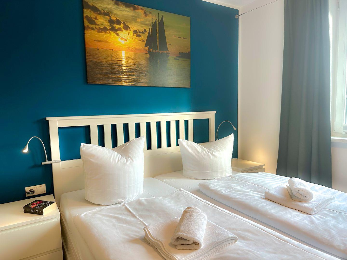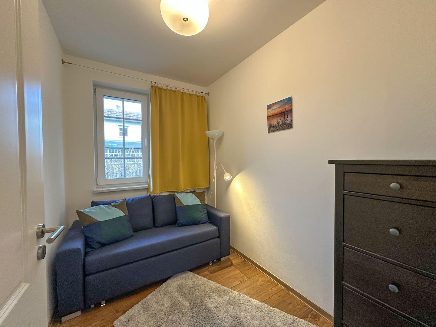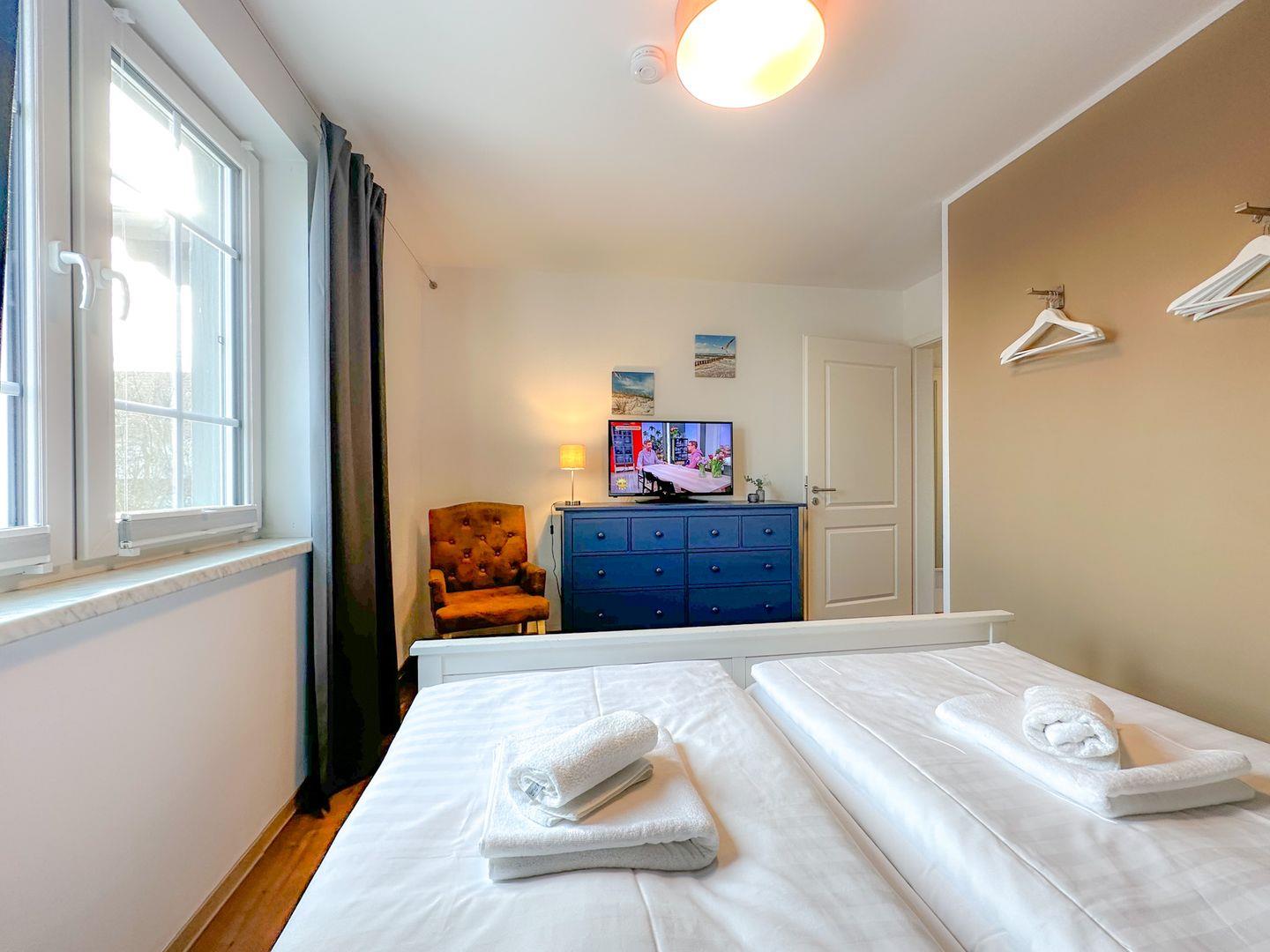 Für Ihre angenehme Nachtruhe sorgen bequeme Matratzen und die Verdunkelungsvorhänge im Schlafzimmern. Das erste Schlafzimmer ist mit einem Doppelbett (90/90x200), zwei Nachttischkommoden und einer großen Kommode mit dem Fernseher ausgestattet .Bei gebuchtem Wäschepaket finden Sie die Betten überzogen vor. Im zweiten Schlafzimmer befinden sich eine bequeme Schlafcouch ( 140/ 200 cm ) und eine Kommode.