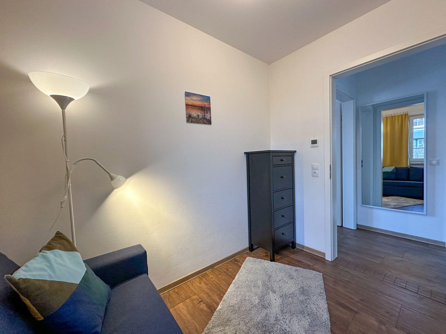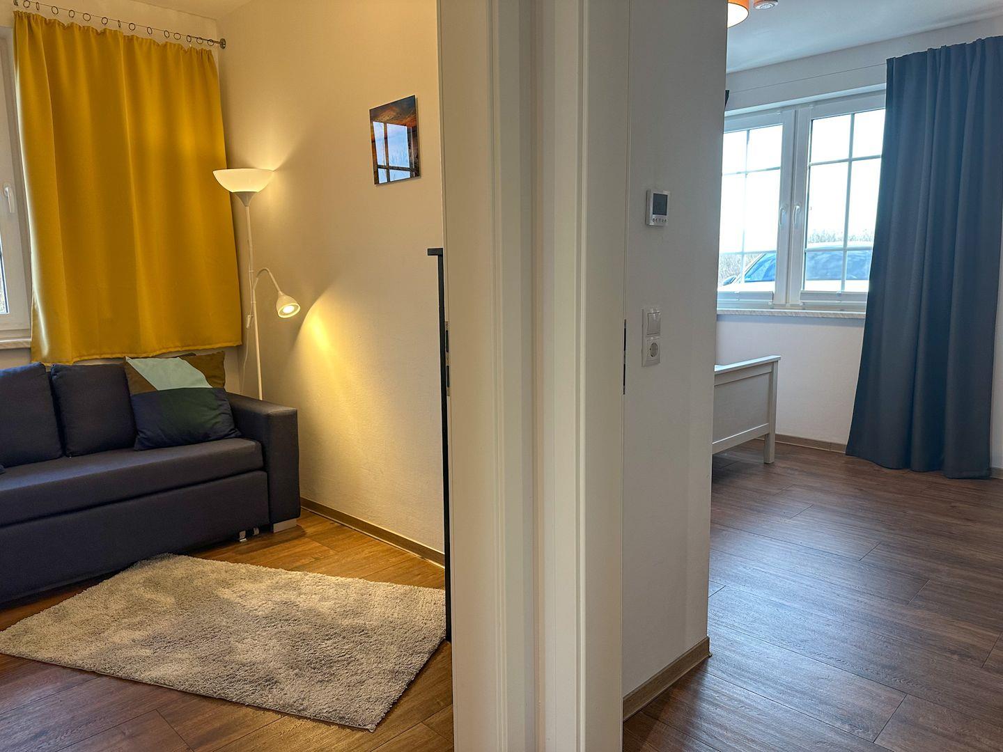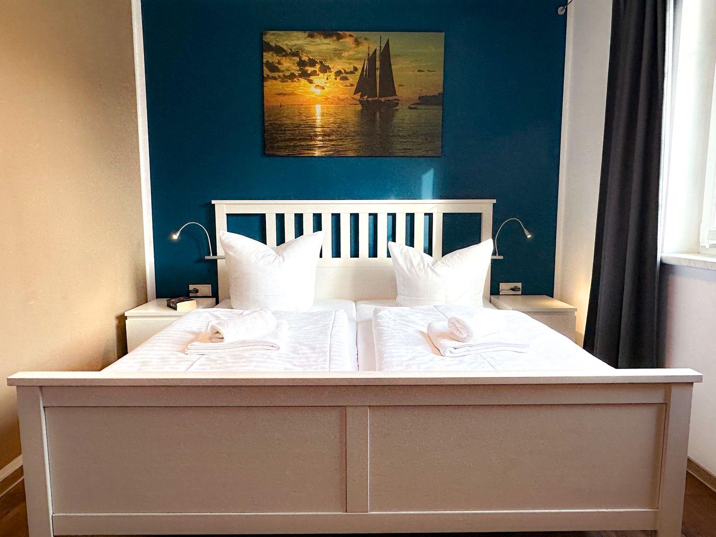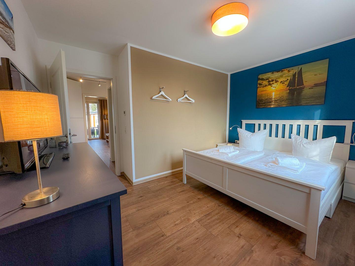 Für Ihre angenehme Nachtruhe sorgen bequeme Matratzen und die Verdunkelungsvorhänge im Schlafzimmern. Das erste Schlafzimmer ist mit einem Doppelbett (90/90x200), zwei Nachttischkommoden und einer großen Kommode mit dem Fernseher ausgestattet .Bei gebuchtem Wäschepaket finden Sie die Betten überzogen vor. Im zweiten Schlafzimmer befinden sich eine bequeme Schlafcouch ( 140/ 200 cm ) und eine Kommode.