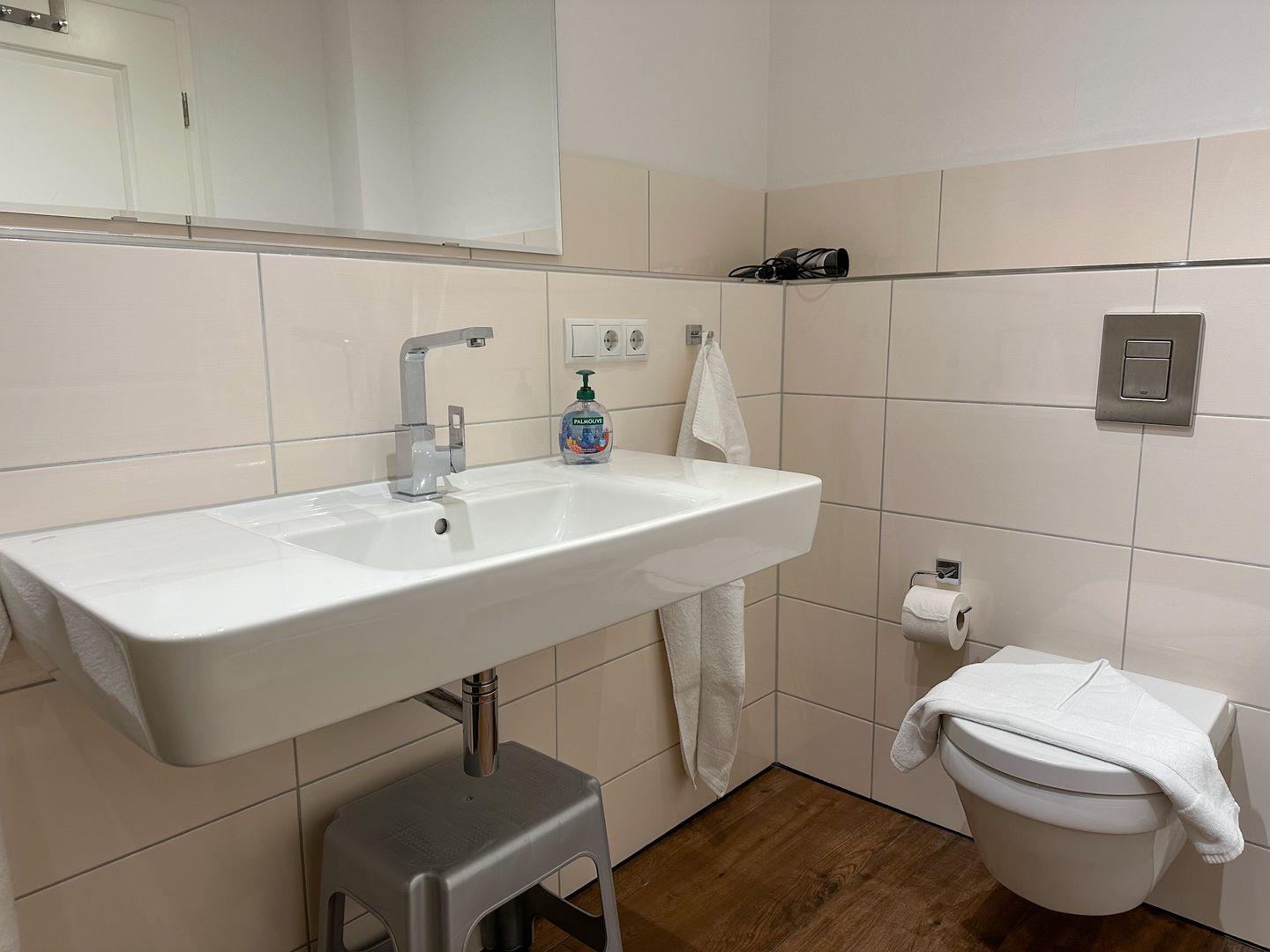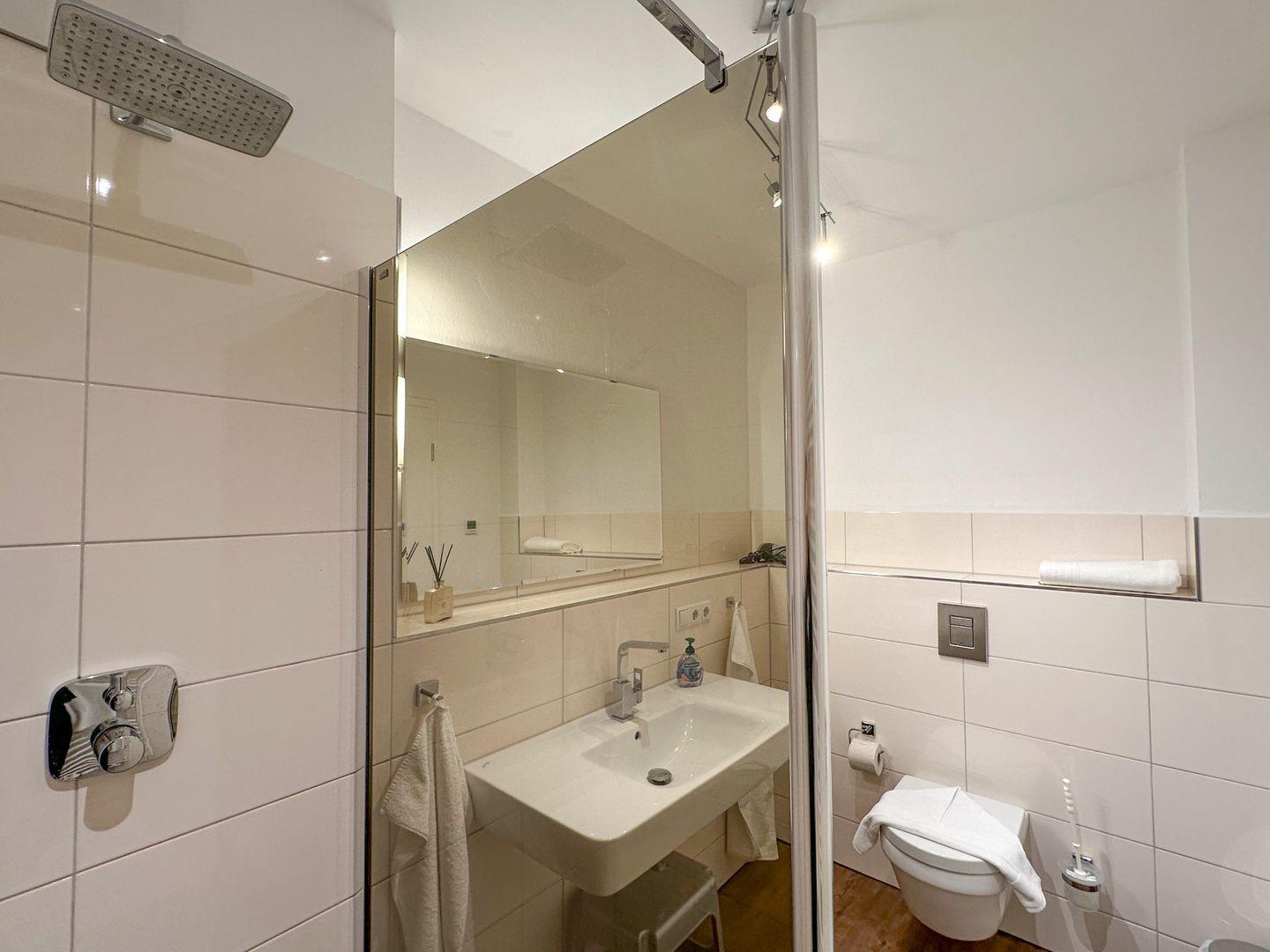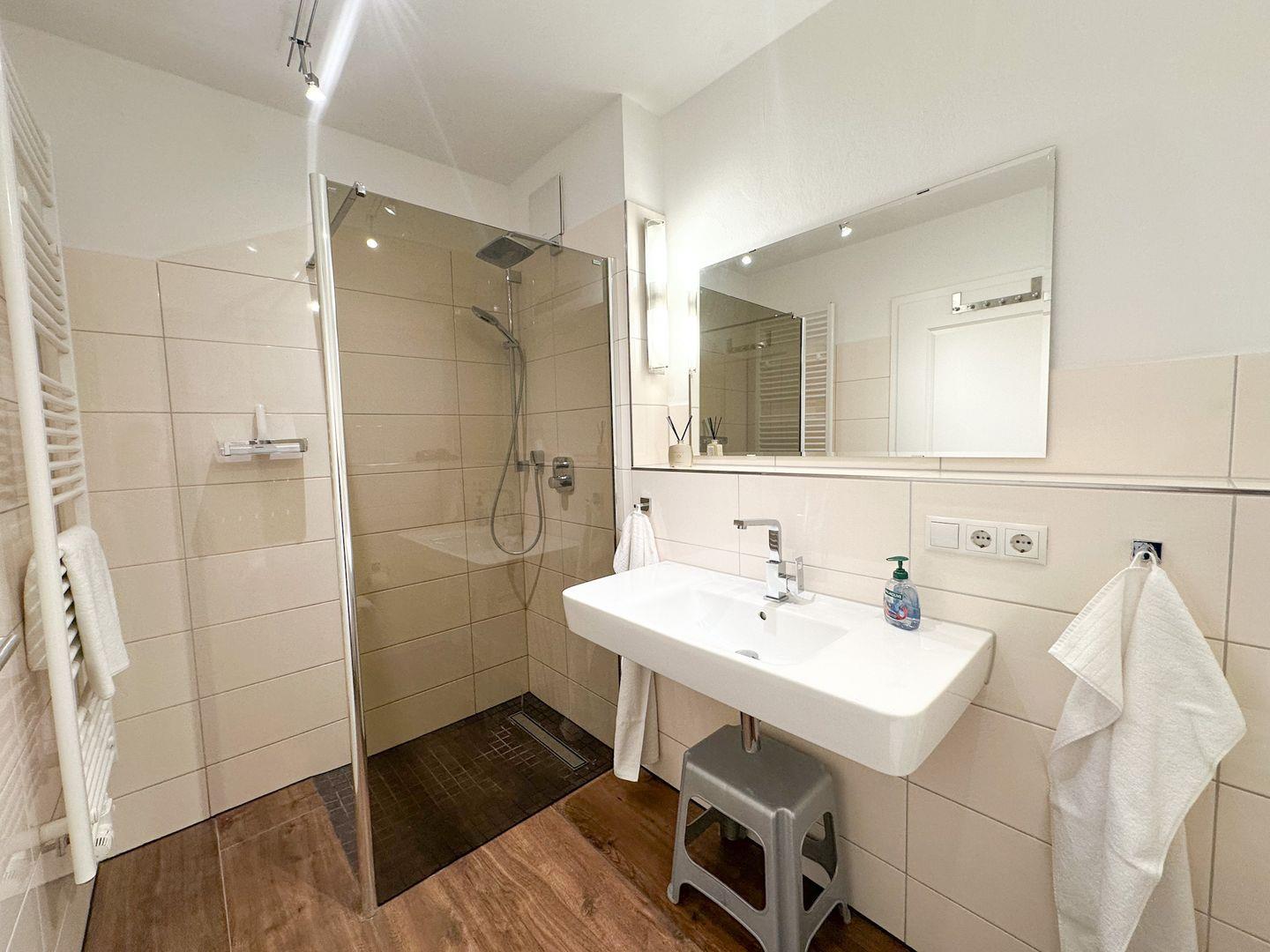 Die ebenerdige Dusche im Bad sorgt für viel Bequemlichkeit . WC, Waschtisch, Badhocker, Fön und ein großer Spiegel ergänzen die Ausstattung.
