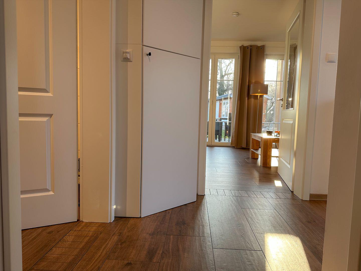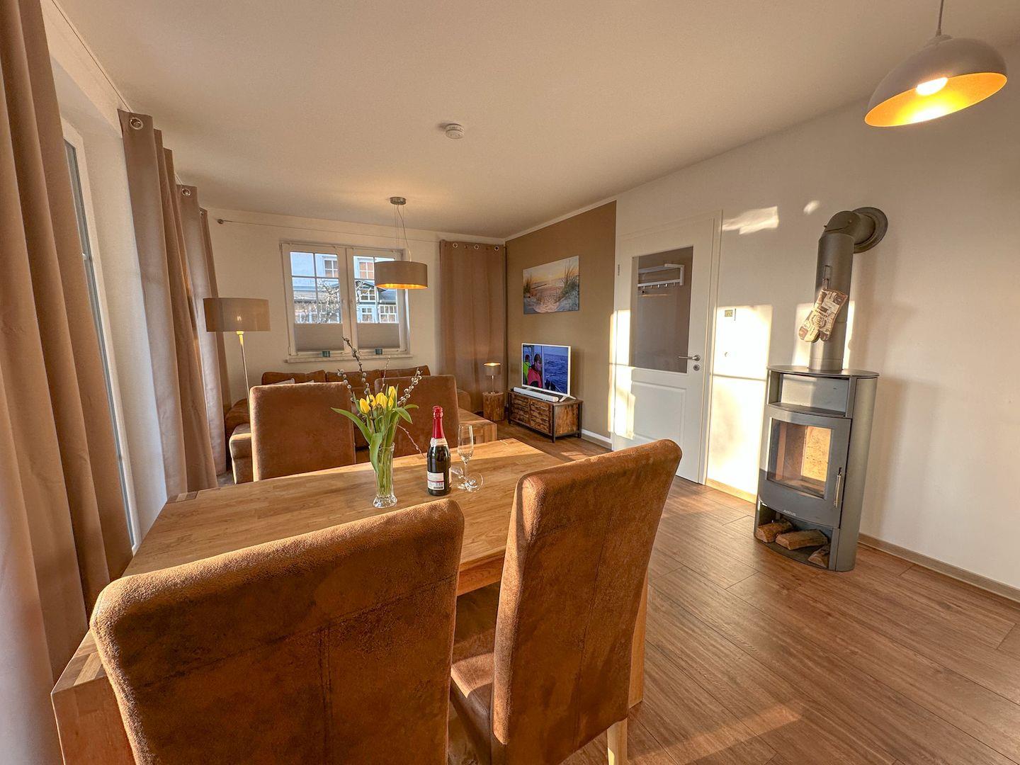 Alle Räumlichkeiten sind gefliest. An kühlen Tagen sorgt eine Fußbodenheizung für wohlige Behaglichkeit und ein Kaminofen für romantische Abende und Gemütlichkeit.