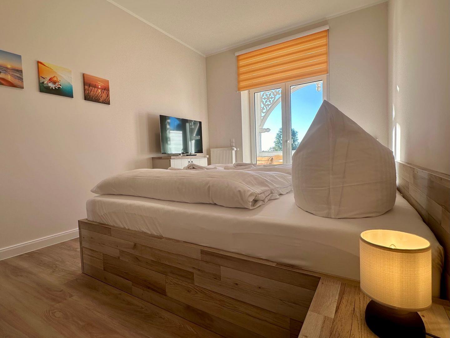 Für Ihre angenehme Nachtruhe sorgen ein hochwertiges Doppelbett im Schlafzimmer und eine bequeme Schlafcouch im Wohnzimmer.