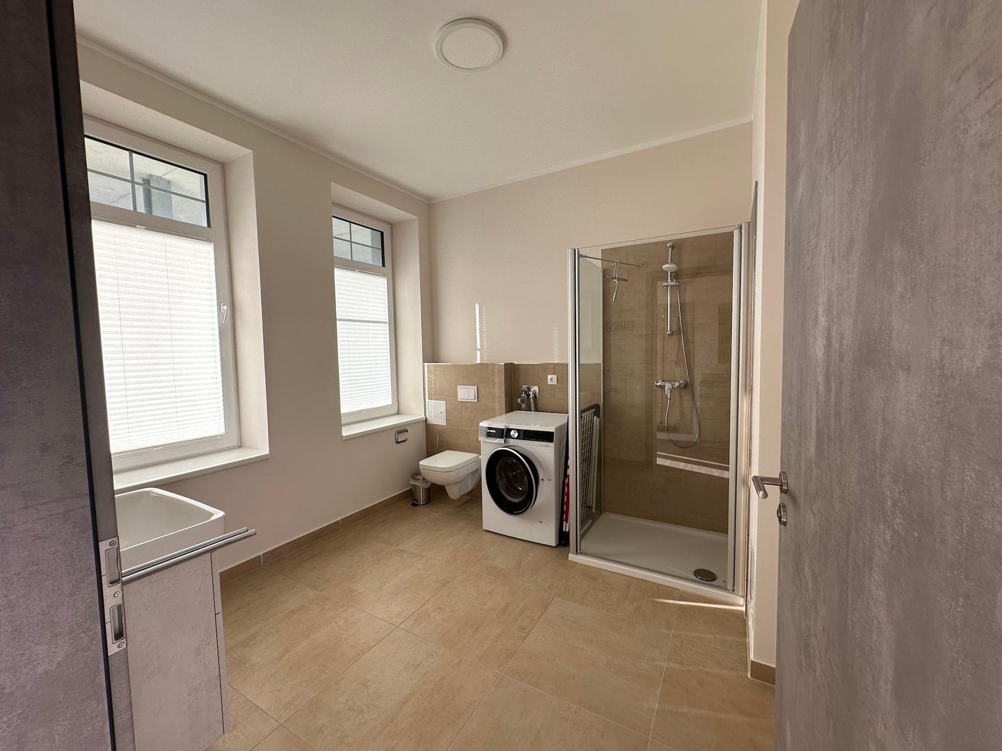 Die ebenerdige Dusche im Bad sorgt für viel Bequemlichkeit . WC, Waschtisch, Fön und eine Waschmaschine ergänzen die Ausstattung. Das Bad verfügt über zwei große Fenster.