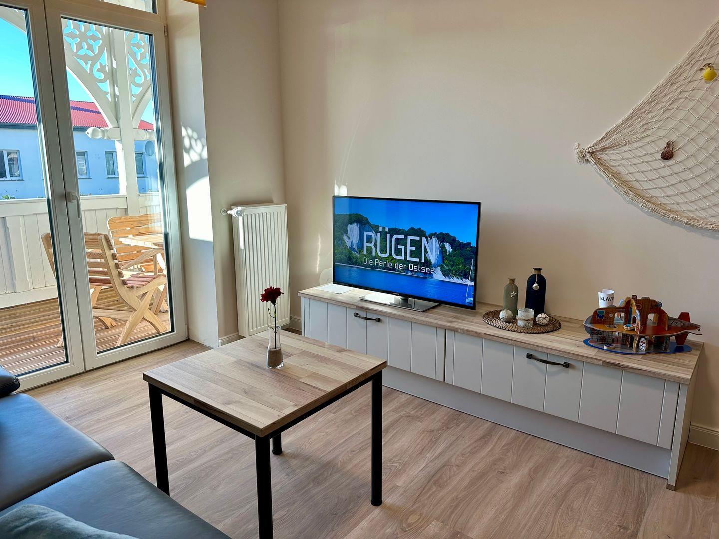 Der großzügige Wohn-/Essbereich verfügt über eine moderne und komplett ausgestattete Küchenzeile mit 4 Zonen-Induktionsfeld und Backofen , Geschirrspüler, Kühlschrank mit Gefrierfach, Mikrowelle, Wasserkocher, Toaster, Kaffeemaschine sowie diversen Küchenutensilien. Angrenzend befindet sich ein Esstisch mit vier Stühlen. Der gemütliche Wohnbereich ist mit einem Flachboard mit großem Fernsehr, einer bequemen Schlafcouch und einem Couchtisch ausgestattet. Angrenzend erreichen Sie den großzügigen Balkon mit einem Tisch, zwei Stühlen und einer Holzbank.