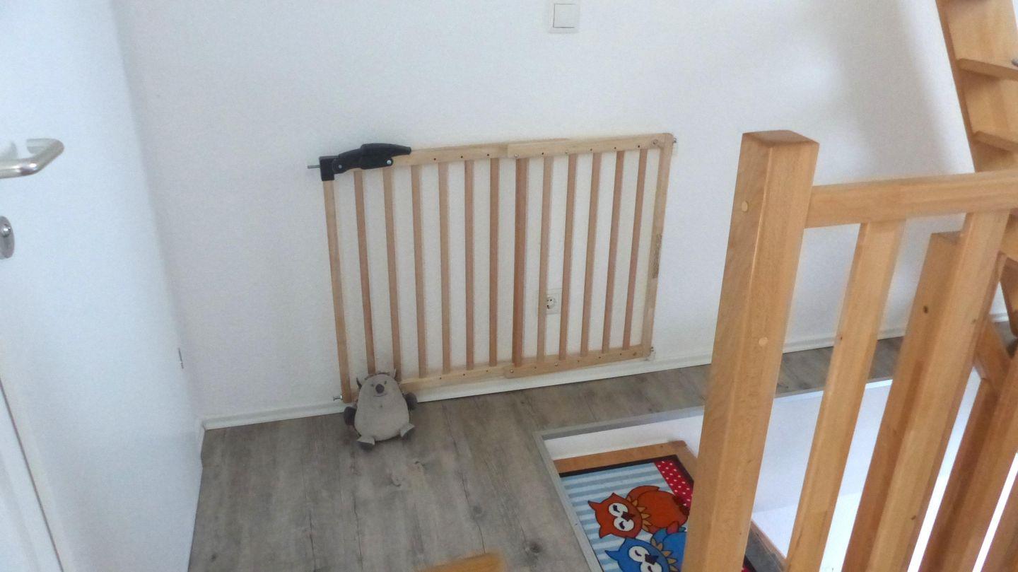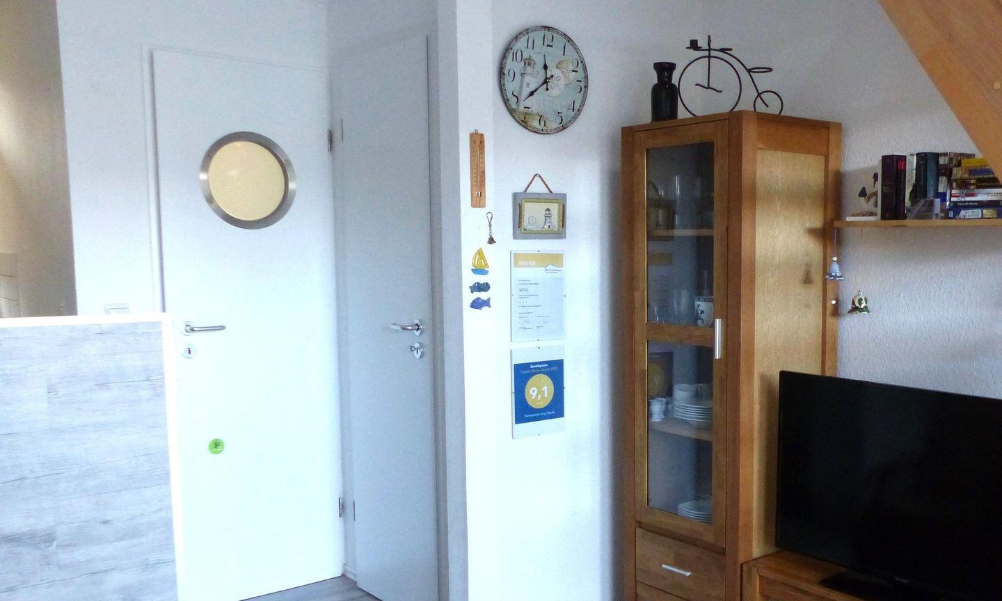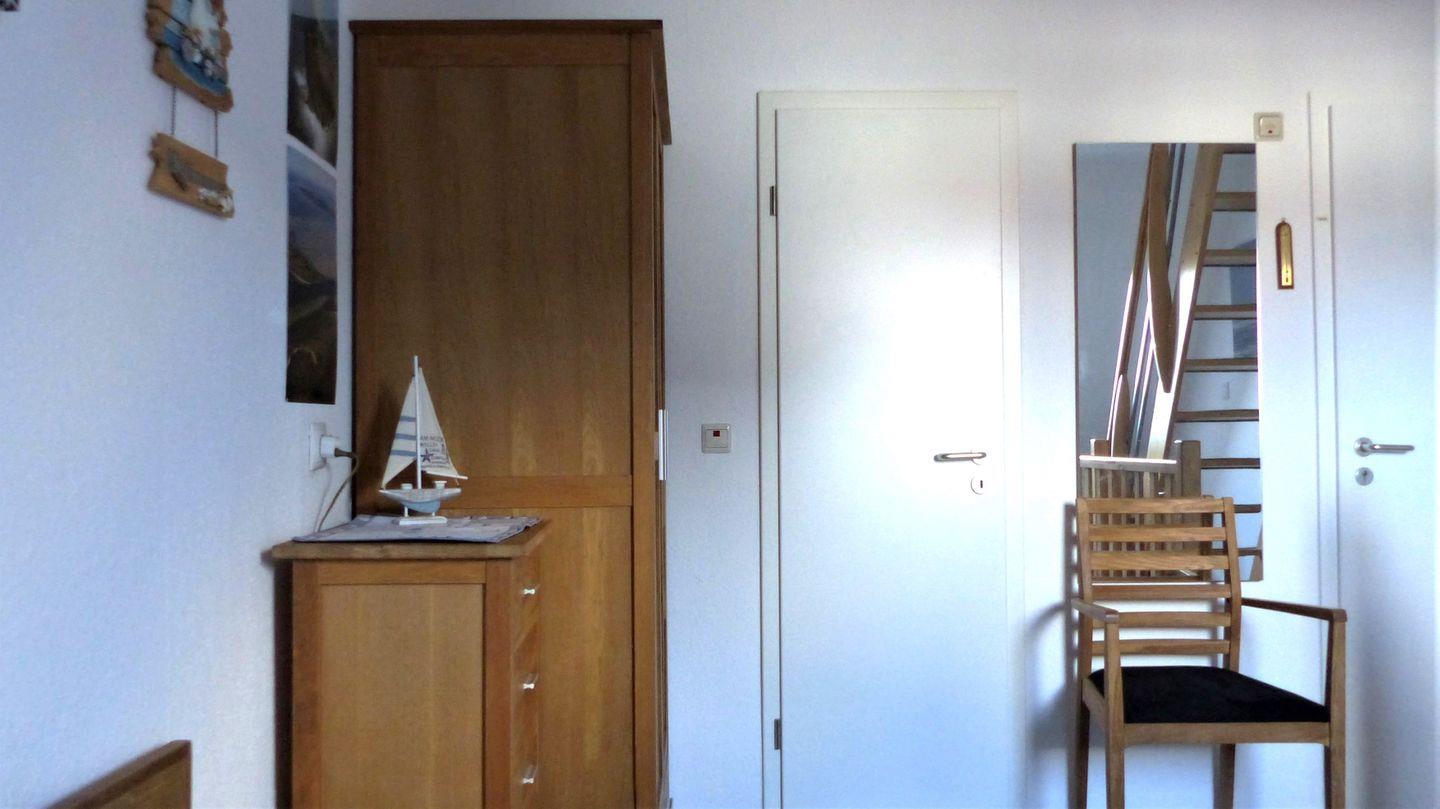 Im Eingangsbereich befindet sich zunächst ein Bereich für Ihre Garderobe, direkt danach führt Sie eine Treppe ins OG