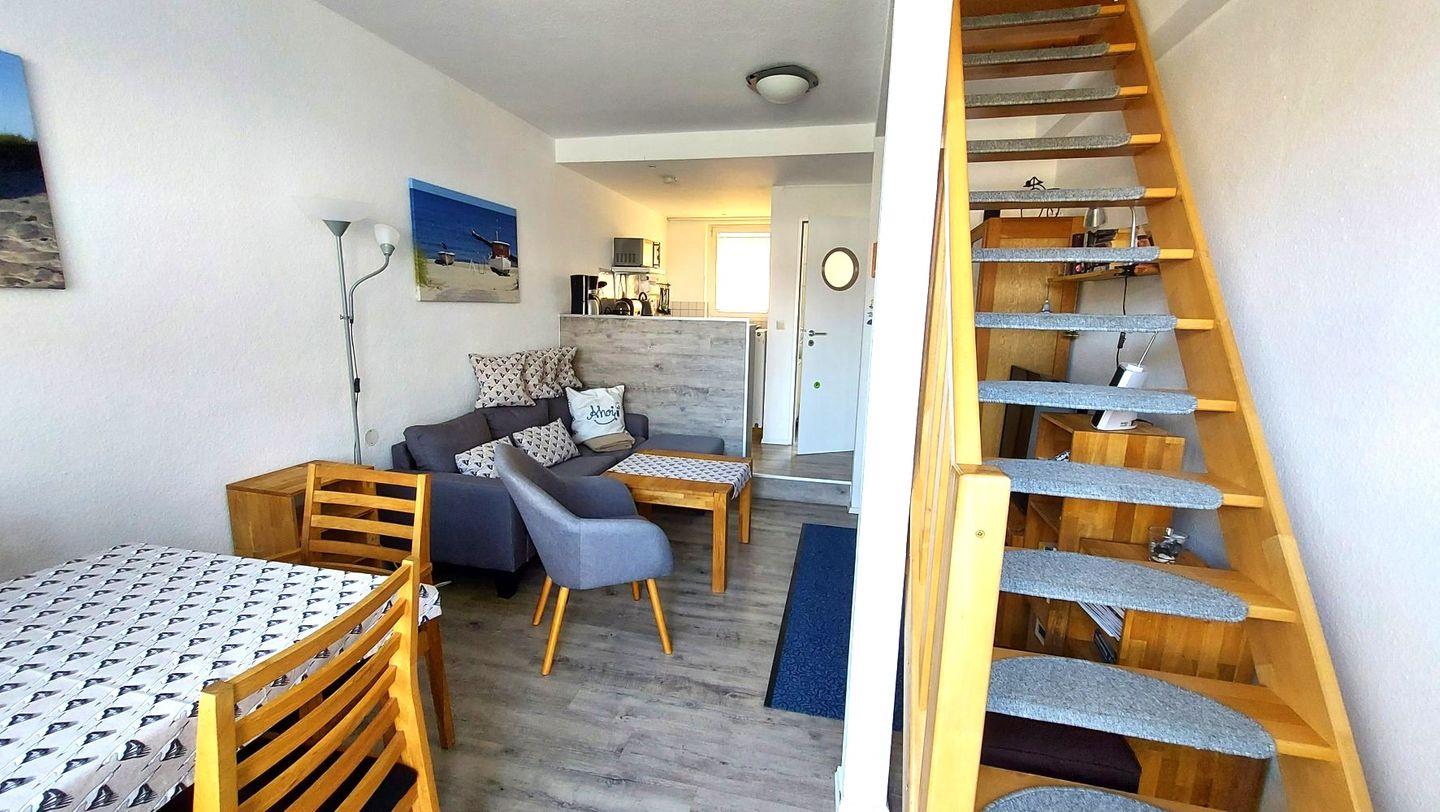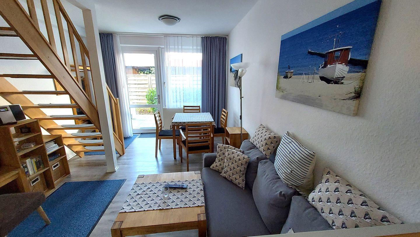 Im Erdgeschoss steht Ihnen ein Wohn- und Essbereich zur Verfügung, eine Couch mit Couchtisch, Sessel und Hocker für die Füße laden Sie ein.