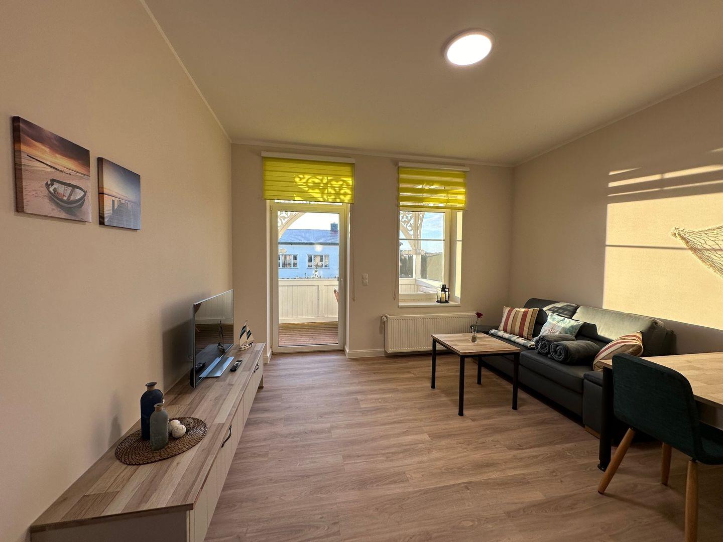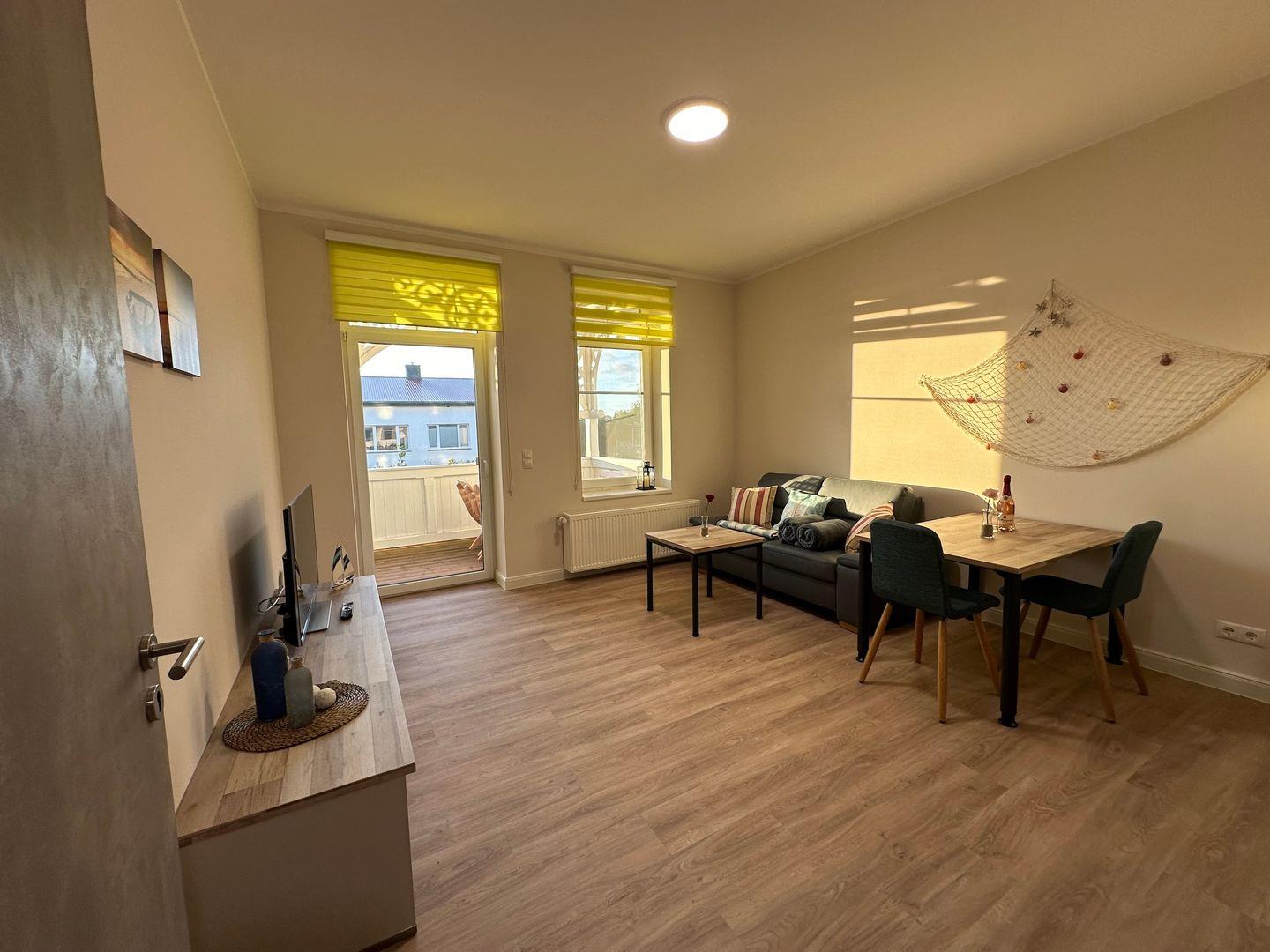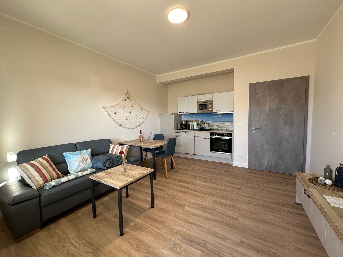Das Wohnzimmer mit einer gemütlichen Couch bietet Ruhe und Entspannung und ist mit einer Essecke für gemütliche Abende mit der Familie abgerundet. Eine anliegende Küche mit gute Ausstattung, ergänzt den Wohnbereich. Die Spülmaschine erledigt für Sie den Abwasch, während Sie am Strand den Sonnenuntergang genießen können. Das Schlafzimmer mit einem Doppelbett (180cmx200cm) bietet Ihnen erholsame Nächte.