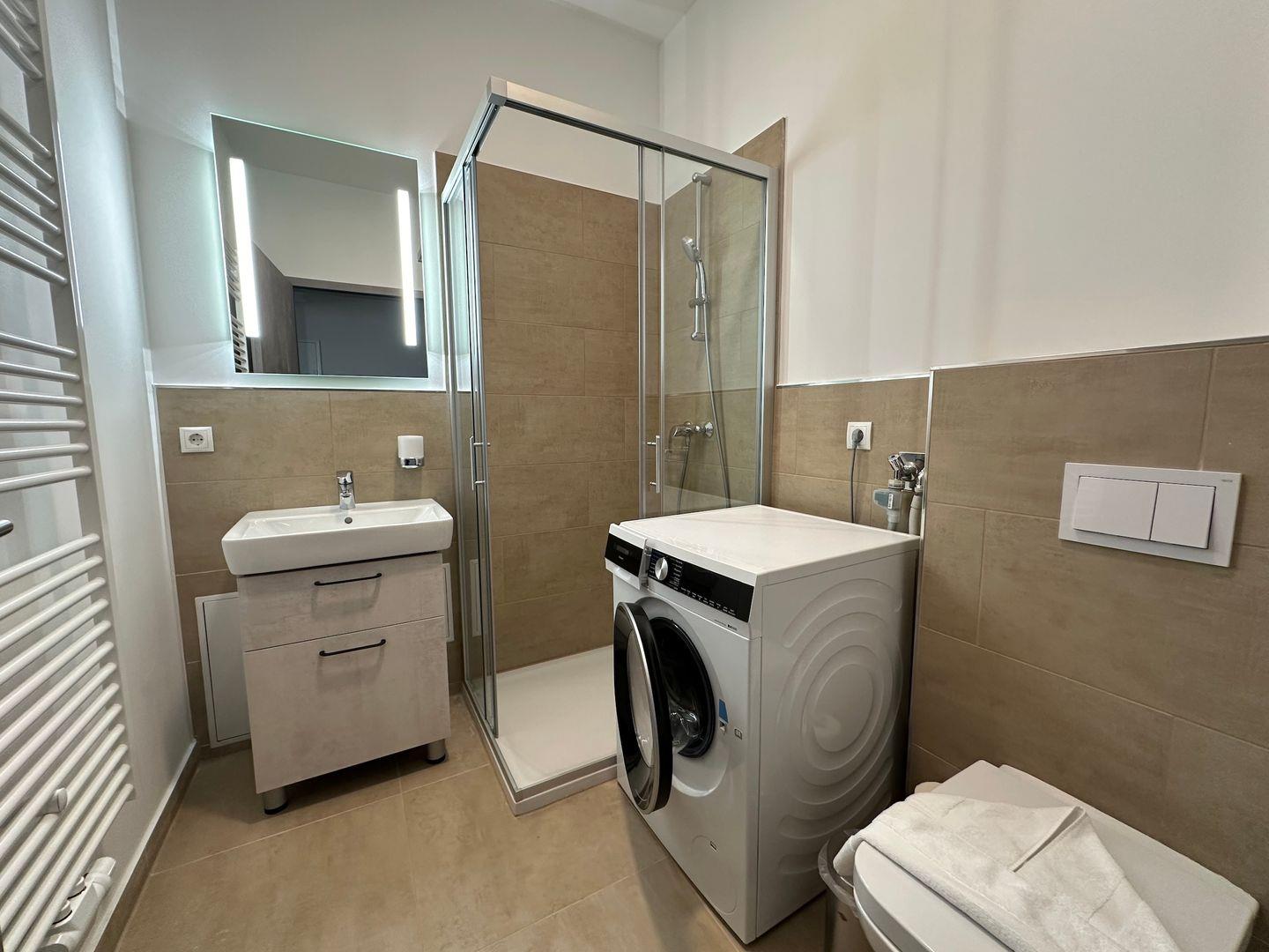 Das Bad mit der Dusche, WC und einer Waschmaschine steht Ihnen auch zur Verfügung.
