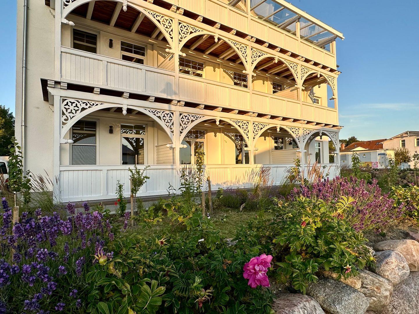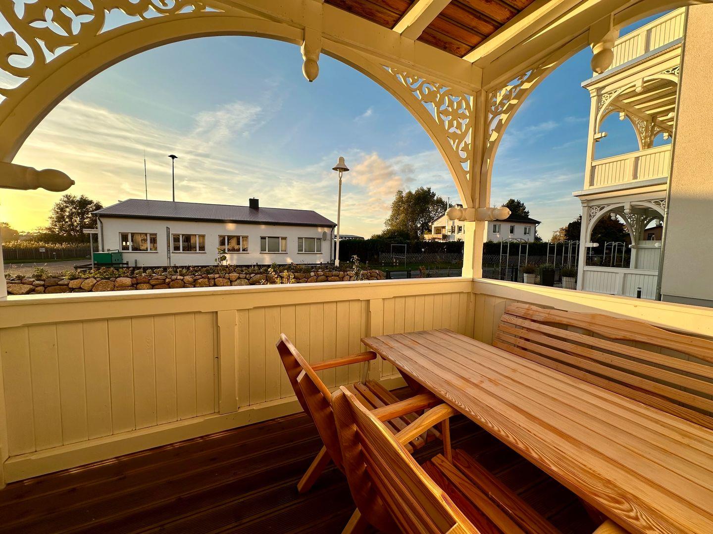 Auf dem großen Balkon mit Gartenmöbeln haben Sie das perfekte Ostseefeeling.