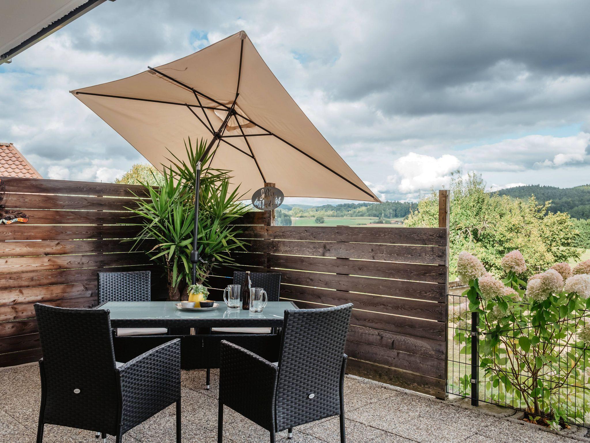 Ferienhaus zur Weinlaube, Ferienwohnung Sonnenblume (85qm) im EG mit überdachter Terrasse und herrlichem Ausblick!