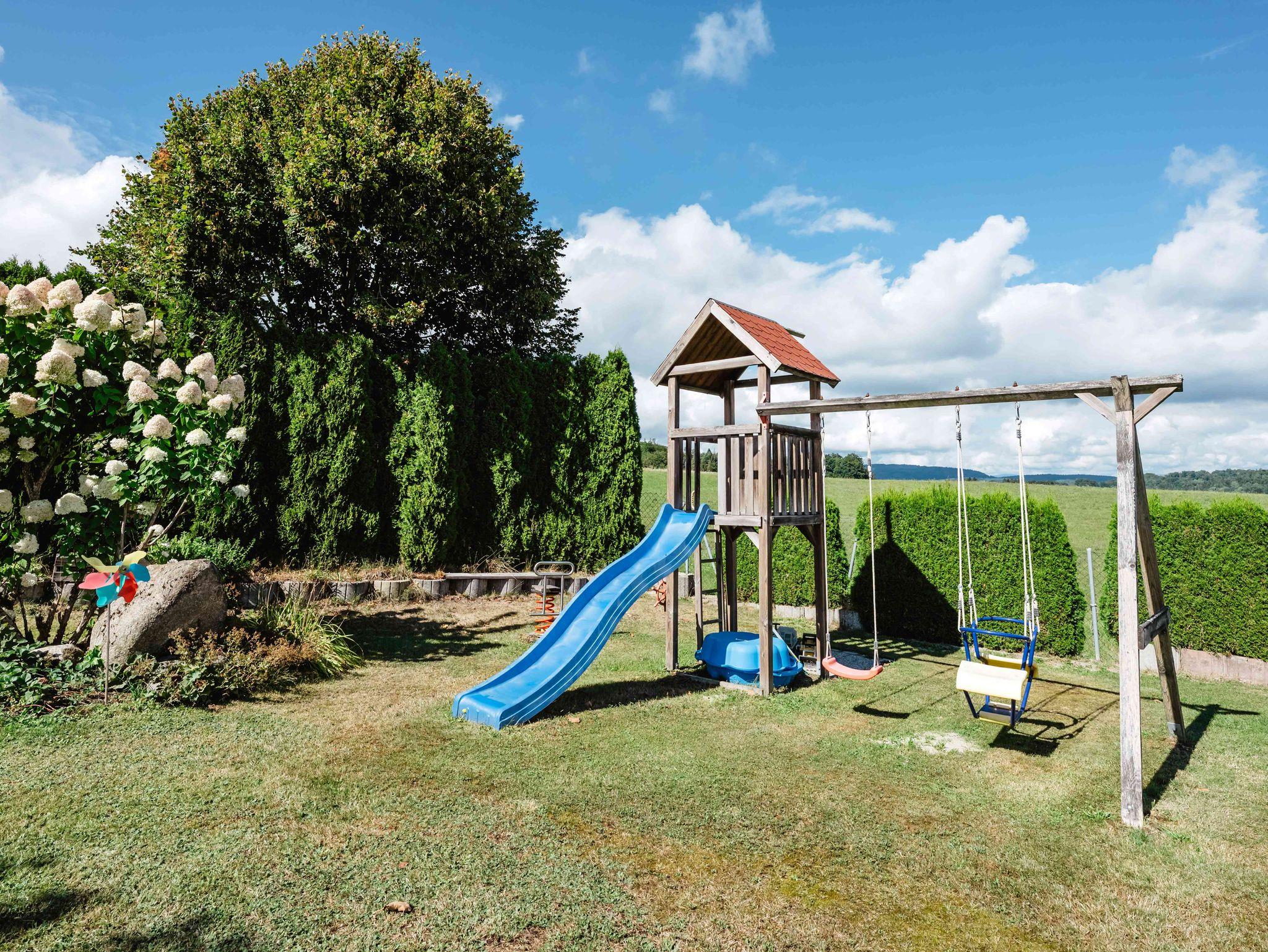 Familienfreundliche Ferienwohnung in ruhiger Lage am Ortsrand! Die geräumige Wohnung befindet sich im Erdgeschoss und verfügt über einen separaten Eingang. Das einladende Wohnzimmer ist ausgestattet mit einem wärmenden Kamin, einer bequemen Sitzgarnitur, Smart-TV und bietet Zugang zur möblierten Terrasse in Ost- und Südausrichtung. Zwei Schlafzimmer mit Doppelbetten sind vorhanden, und es gibt in jedem Raum Platz für ein zusätzliches Bett oder Kinderbett. Die Küche ist komplett eingerichtet mit einer Sitzgruppe, Geschirr, Wasserkocher, Kaffeevollautomat, Spülmaschine und einem Herd mit Backofen für gesellige Kochabende. Das Badezimmer ist mit einer Dusche/WC, Handtüchern und einem Hocker ausgestattet und bietet ausreichend Ablagefläche. Ein Trockenraum steht ebenfalls zur Verfügung. Besonders geschätzt wird der direkte Zugang zur großen Wiese und dem Spielplatz dazu gemütliche Sitzmöglichkeiten. Die Spielscheune mit Bibliothek, Tischtennis, Dart, Kicker Kasten sind bei bei jedem Wetter gefragt. Es gibt viel in der näheren und weiteren Umgebung zu entdecken.