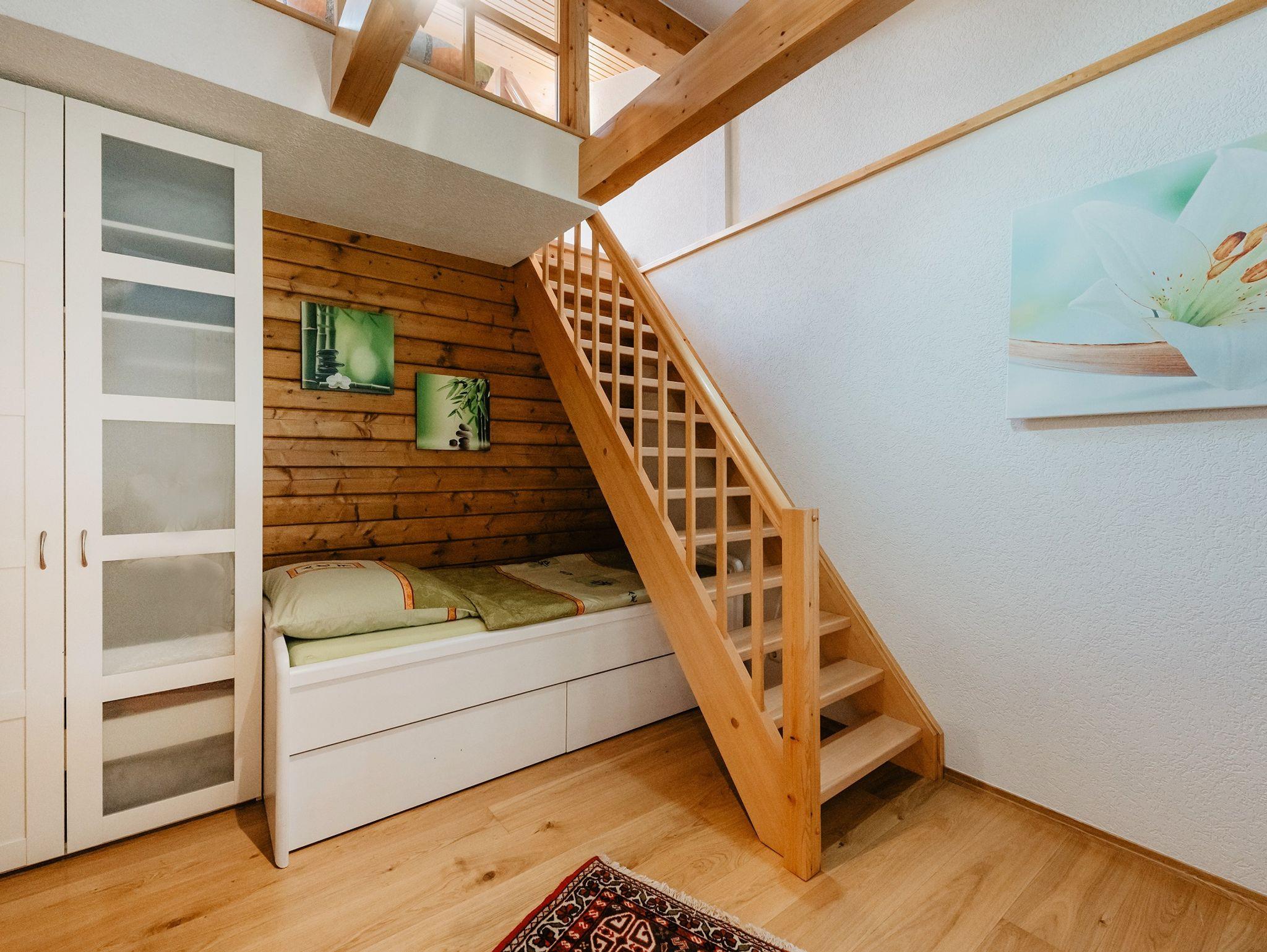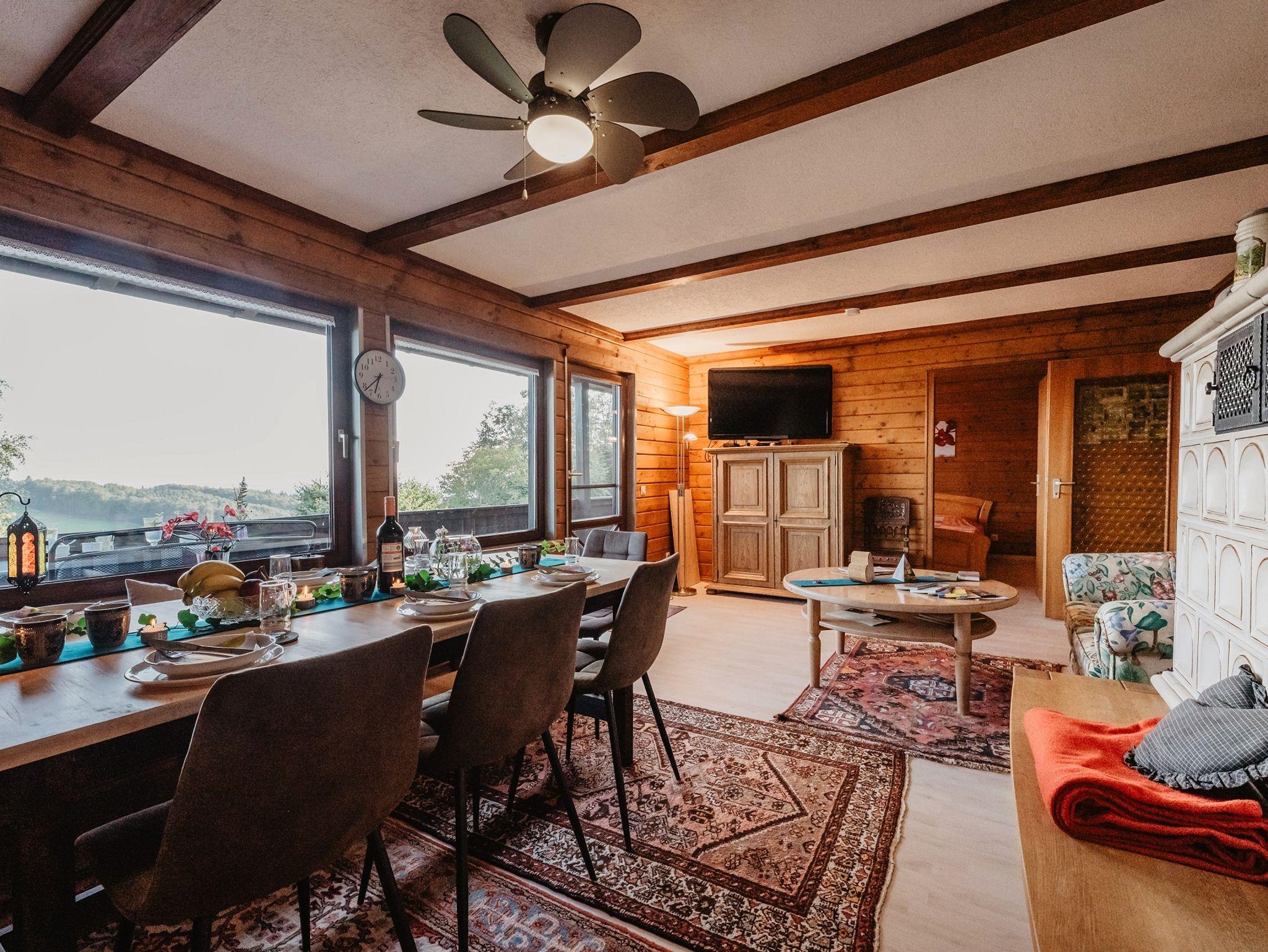 Die Wohnung im Obergeschoss mit 70 qm bietet Platz für 1-4 Personen und verfügt über einen eigenen Eingang, ein gemütliches Wohn- und Esszimmer mit Kachelofen und einen großzügigen Südbalkon.