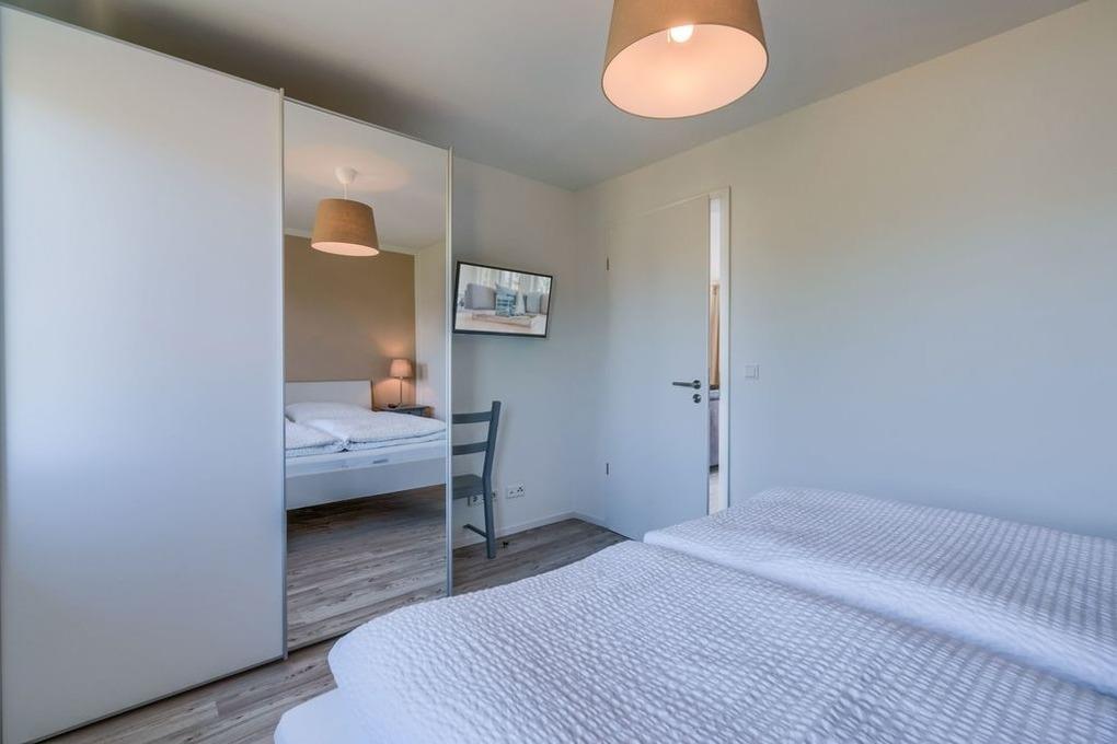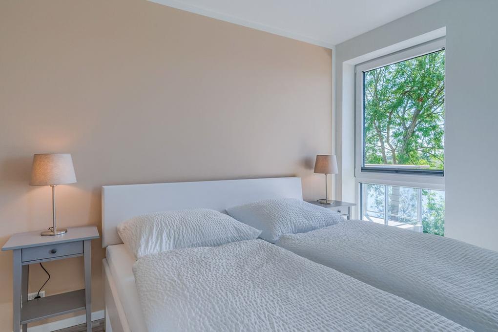 Das südlich ausgerichtete Schlafzimmer verfügt zusätzlich zum Komfortbett über ein Faltsofa mit hochwertigem Lattenrost und Schlafmatratze. Dieses steht, kombiniert mit einem kleinen Beistelltisch und einer Leselampe, in einer kleinen, gemütlichen Nische mit freiem Blick nach draußen. Hier können Sie sich zurückziehen, etwas Ruhe genießen und es sich gemütlich machen.