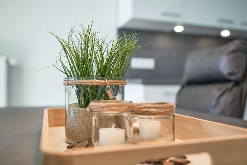 Mit viel Liebe zum Detail ist in der Raumgestaltung das Thema „Strandblick“ aufgenommen worden. So sind die beiden Schlafräume an den rückwärtigen Wänden im warmen Sandton gehalten und vermitteln in Kombination mit den dunklen Sitzmöbeln ein angenehmes Gefühl der Geborgenheit.