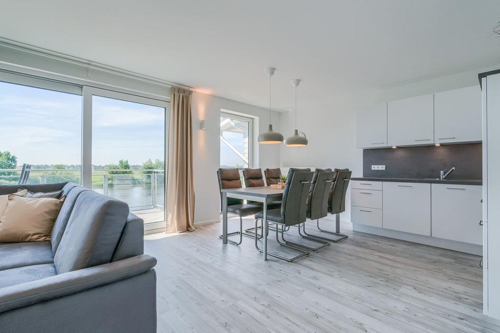 In der modernen Küchenecke bringt das Zubereiten der Speisen in der Gruppe Freude. Eine eingebaute Geschirrspülmaschine übernimmt anschließend den Abwasch, während Sie bei einem Wein auf dem Balkon den Tag Revue passieren lassen. Die Glasumrundung des Balkons schützt vor frischen Winden und lässt den Blick frei auf die wunderschöne Eider.