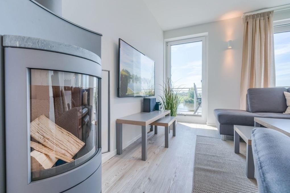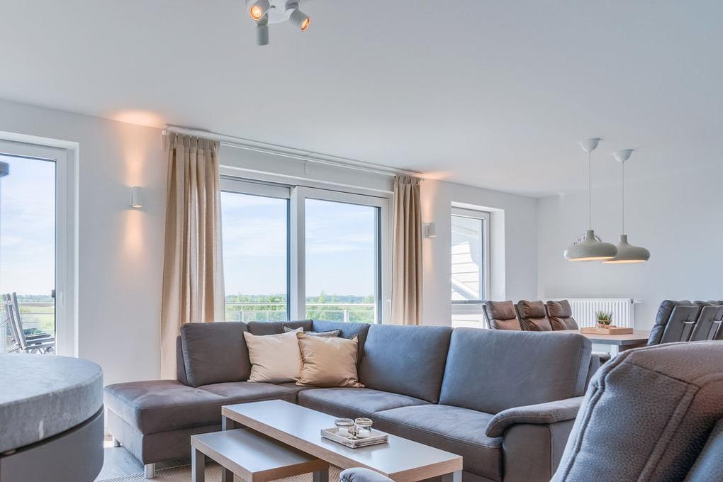 Nach Betreten des Eingangsflurs öffnet sich die nach Süden ausgerichtete Wohnung zu einem großzügigen Tagesraum, der mit seiner bequemen Sitzgarnitur vor dem Kaminofen und dem Flat-TV zum Wohlfühlen einlädt. Der lichtdurchflutete Wohn-/ Essbereich erlaubt durch die bodentiefen Fenster einen herrlichen Blick auf den nahen Sandstrand, die Eider und über das angrenzende, kaum bebaute Weideland bis in die weite Ferne.