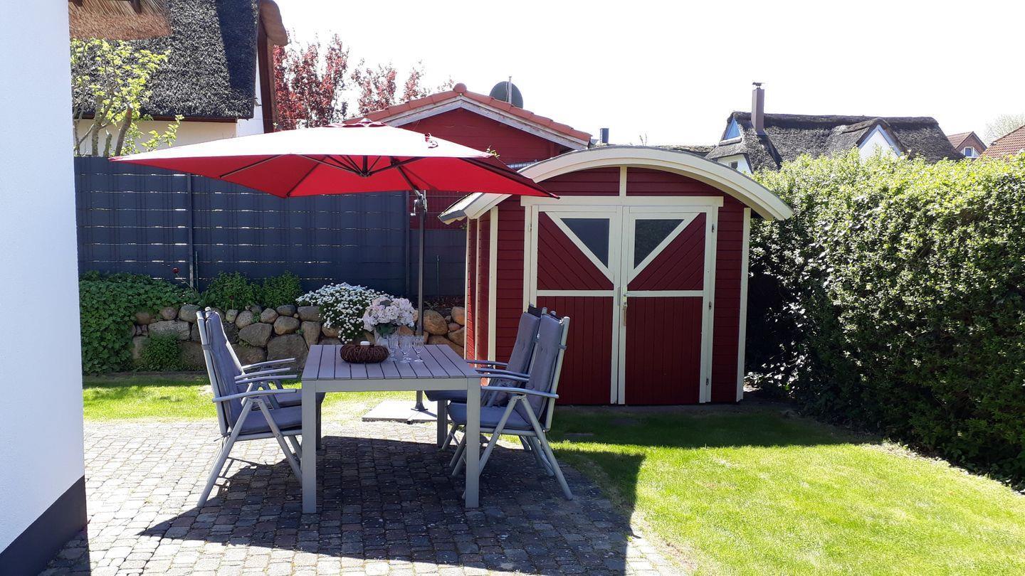 Ach ja, im Gartenhaus stehen natürlich ein Grill, Gartenmöbel für 4 Personen, 2 Liegen und 2 Sonnenschirme für Sie bereit (Grillkohle + Anzünder nicht vergessen!).