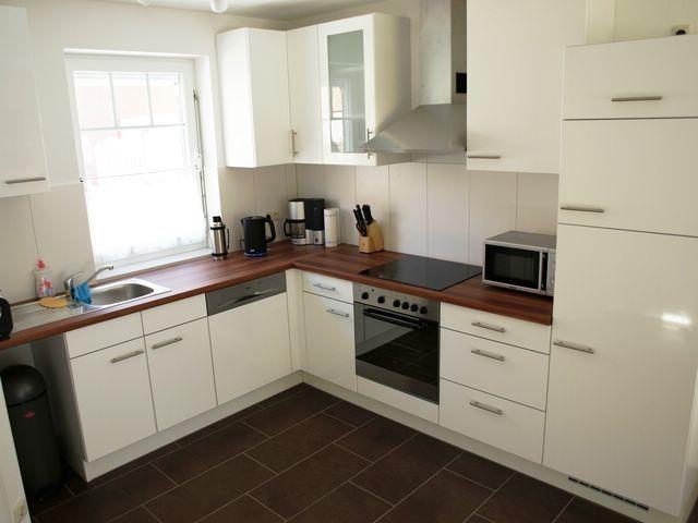 Das helle und offen gestaltete Wohn- und Esszimmer ist mit einer komfortablen Sofaecke mit TV-Gerät, Kamin und einem großzügigen Esstisch möbliert. Die Küche ist ebenfalls in den Raum integriert und mit vielen technischen Geräten, wie Herd mit Backofen, Geschirrspülmaschine, Mikrowelle, Kühlschrank mit Gefrierfach und diversen Kleingeräten ausgestattet.