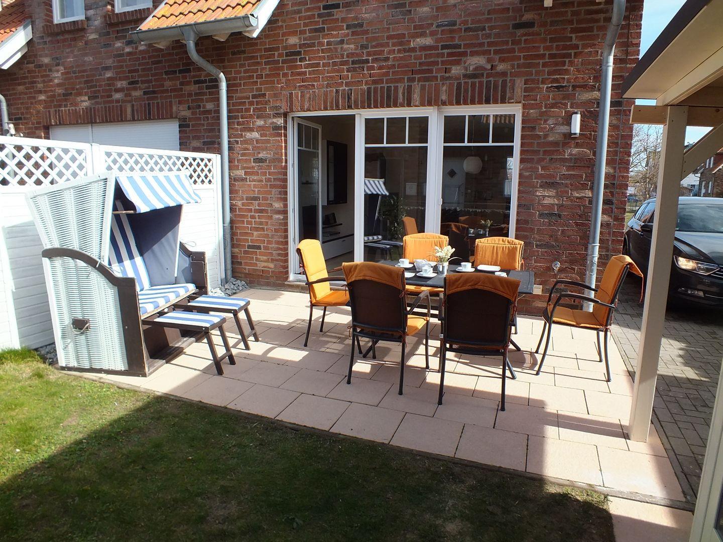 Der kombinierte und offen gestaltete Wohn- und Essbereich ist mit einer gemütlichen Sofaecke mit TV-Gerät und Kamin, Esstisch und Zugang zur möblierten Terrasse mit kleinem Garten ausgestattet. Die Küche ist integriert und bietet alle technischen Geräte, die für einen entspannten Urlaub mit Selbstversorgung nötig sind. Dazu gehören z.B. ein Geschirrspüler, ein Herd mit Backofen, eine Mikrowelle und diverse Kleingeräte, wie Kaffeemaschine und Toaster.