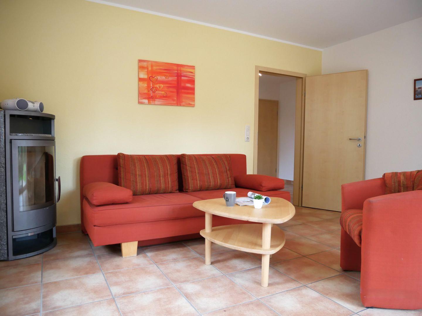 Das geräumige Wohnzimmer ist mit einer Couch, TV, WLAN, Kamin ausgestattet. Außerdem befindet sich hier der Zugang zur möblierten Terrasse. In der separaten Küche verfügen Sie über einen kleinen Esstisch mit Stühlen und einer gut ausgestatteten Küchenzeile mit Backofen, Herd, Geschirrspülmaschine, Kühlschrank mit Gefrierfach und weiteren Kleingeräten, wie Wasserkocher, Toaster und Kaffeemaschine.