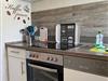 Der moderne Wohn- und Essbereich verfügt über eine gemütliche Sofaecke mit Smart-TV und großzügigem Esstisch. Die angrenzende, zum Wohn- und Essbereich offen gehaltene Küche ist voll ausgestattet. Sie verfügen hier über einen Kühlschrank mit Gefrierfach, einen Herd mit Backofen, einen Geschirrspüler und diverse Kleingeräte, wie Kaffeemaschine, Wasserkocher und Toaster.