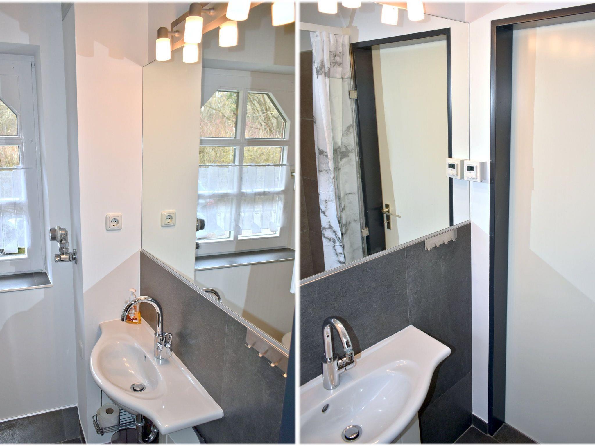 Bad 1: Dusche bodengleich, Spiegel, Waschbecken, WC