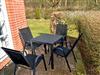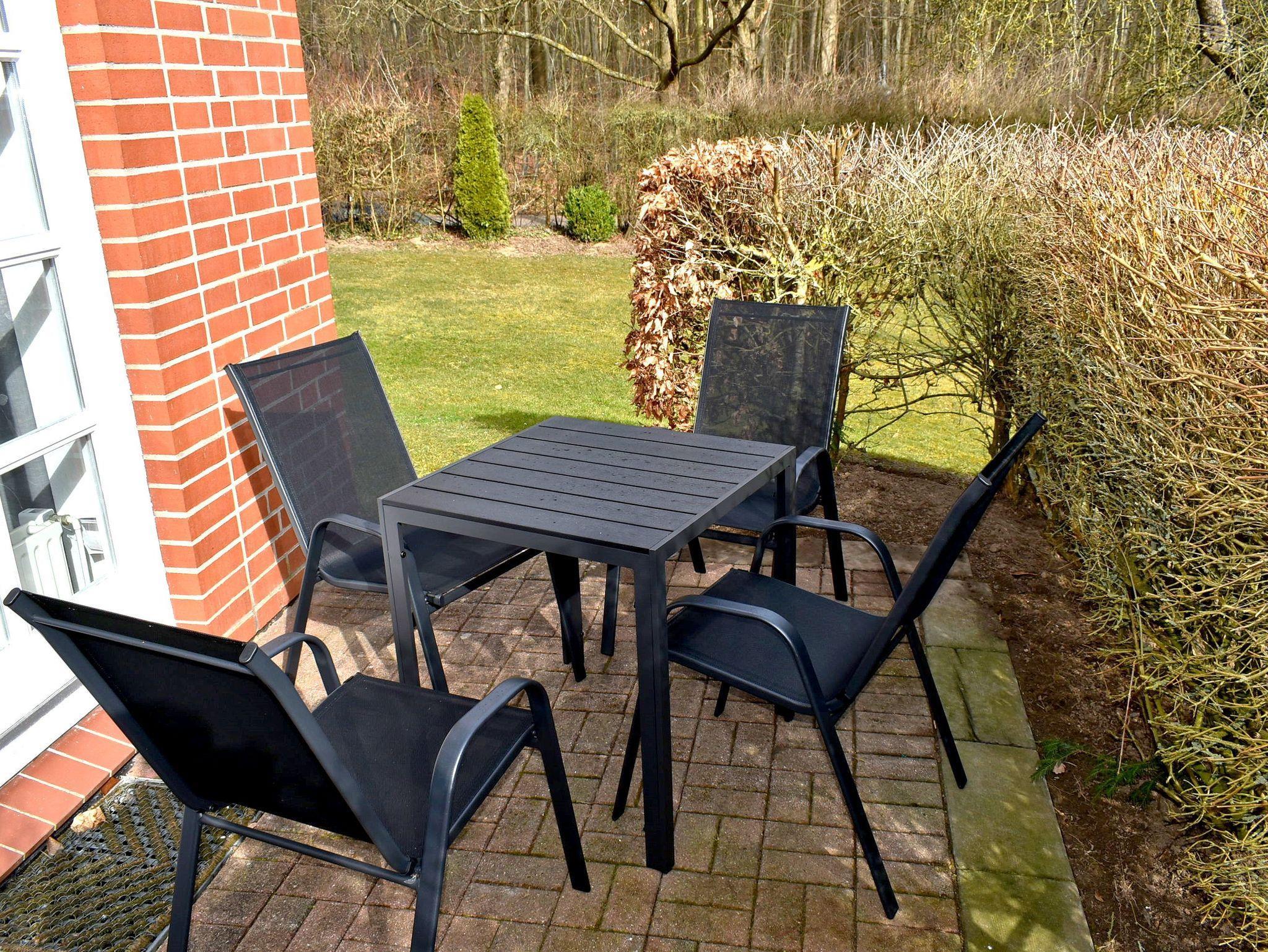 Terrasse: 4 Stühle, Tisch, Sonnenschirm