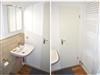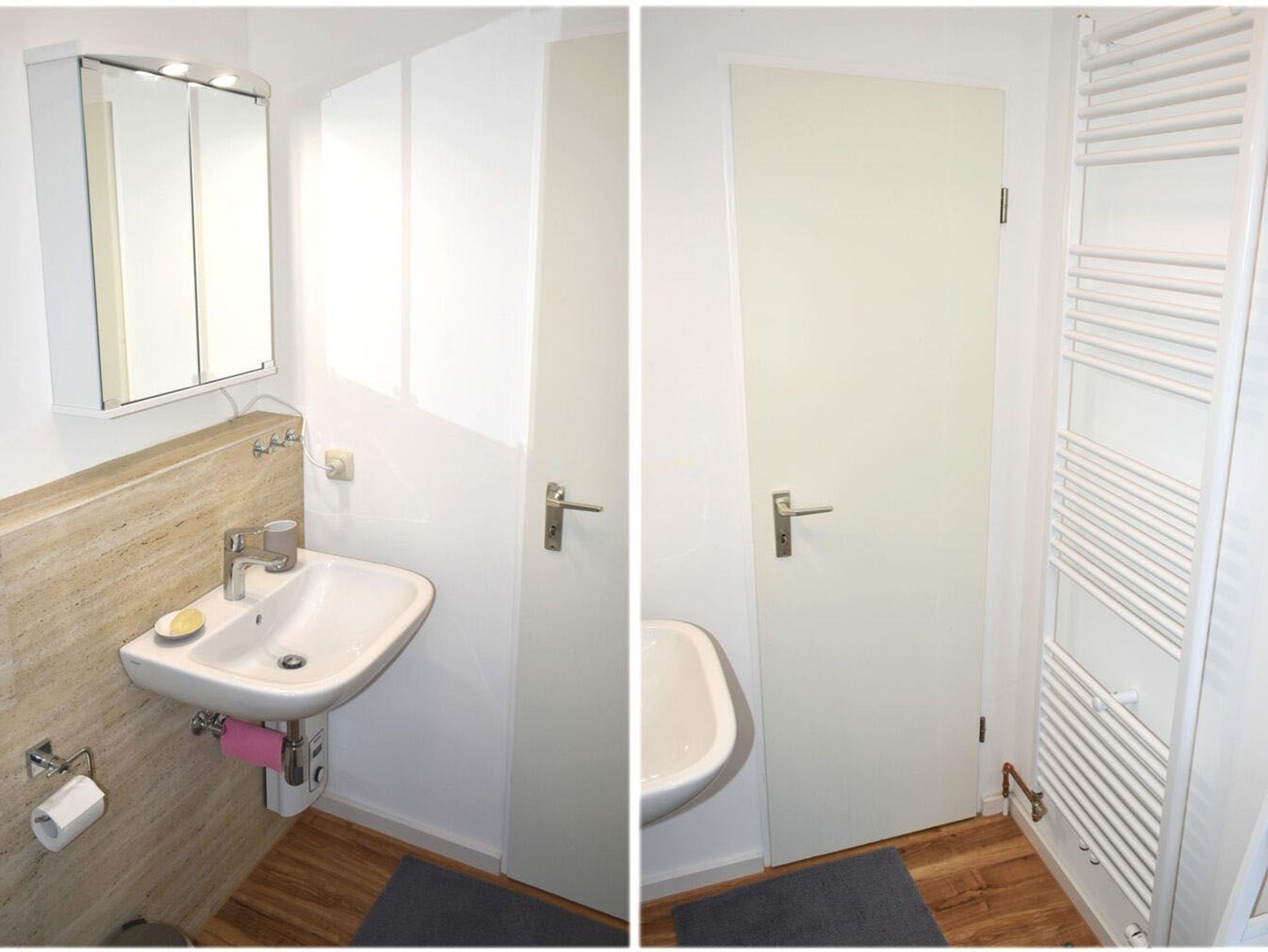 Bad 1: Duschkabine, Fön, Handtuchheizung, Regal, Spiegelschrank, Waschbecken, WC