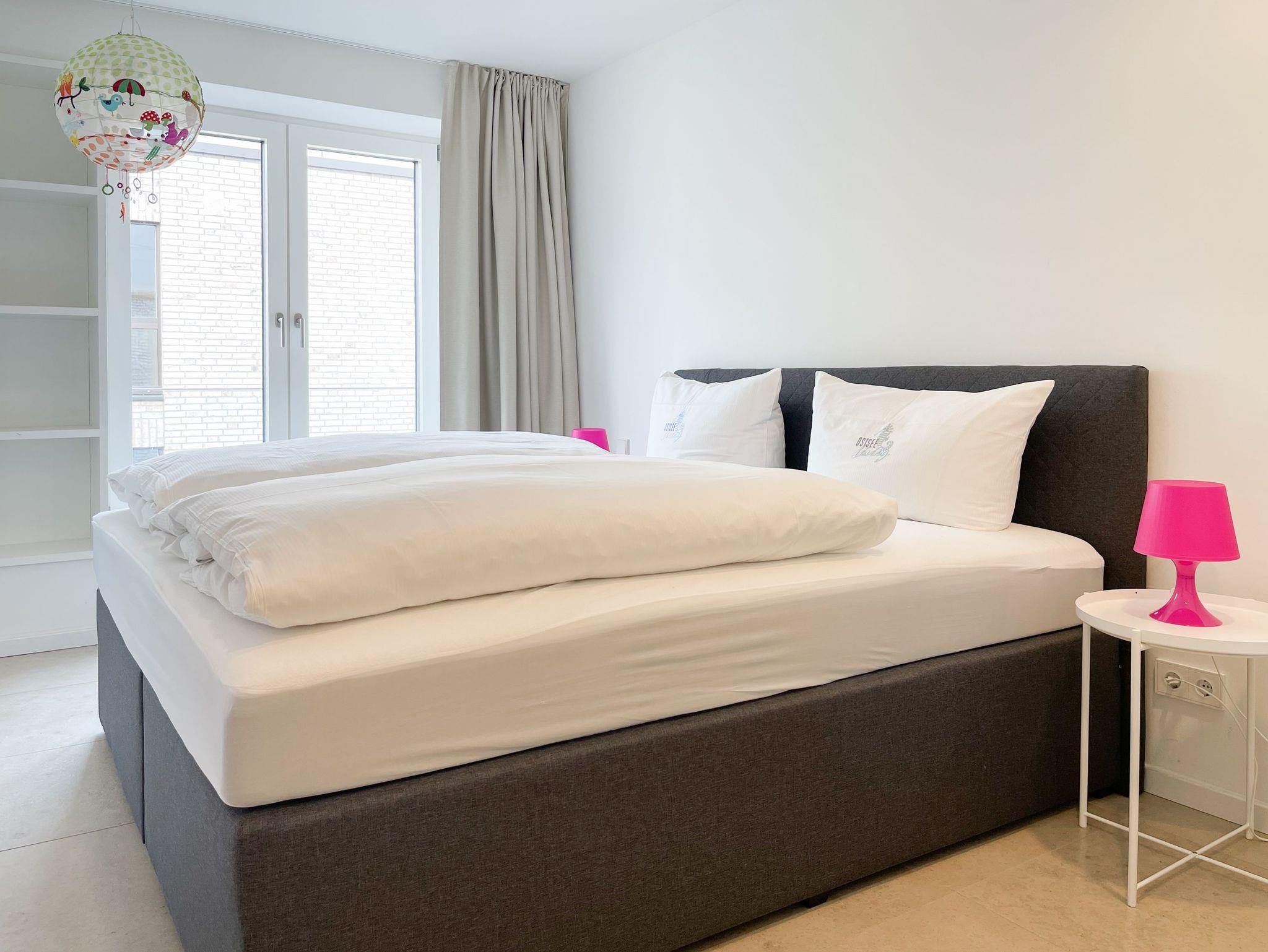 Das großzügige, lichtdurchflutete Wohnzimmer bietet einen herrlichen Ausblick, teilweise bis auf die Ostsee. Hier können Sie schöne Stunden mit Ihrer Familie verbringen und[nbsp] ein Kamin sorgt für behagliche Stunden am warmen Feuer. Die sehr hochwertige und offen gestaltete bulthaup Markenküche fügt sich harmonisch in das Gesamtbild der Wohnung ein und bietet ebenfalls einen schönen Ostseeblick. Sie ist mit einem Esstresen und Barhockern ausgestattet, an dem 6 Personen bequem Platz finden. Das Master Schlafzimmer, eingerichtet mit einem Boxspringbett (180x200), TV und Verdunkelungsvorhängen, lässt Sie nach einem schönen Urlaubstag perfekt zur Ruhe kommen. Ein großer Kleiderschrank hält genügend Möglichkeiten für Sie bereit, Ihre Urlaubsgarderobe unterzubringen. Von hier haben Sie direkten Zugang zu einem Badezimmer der Extraklasse. Die Natursteinfliesen und die helle Ausstattung des Bades sorgen für eine ausgesprochene Wohlfühlatmosphäre. Für absolute Entspannung sorgt die integrierte Sauna, die Sie natürlich kostenfrei nutzen können. Zwei weitere Schlafzimmer sind mit je einem kleinen Kleiderschrank, Verdunkelungsvorhängen und einem Boxspringbett eingerichtet.[nbsp] Selbstverständlich gehören drei TV und WLAN zum Entertainment-Paket.