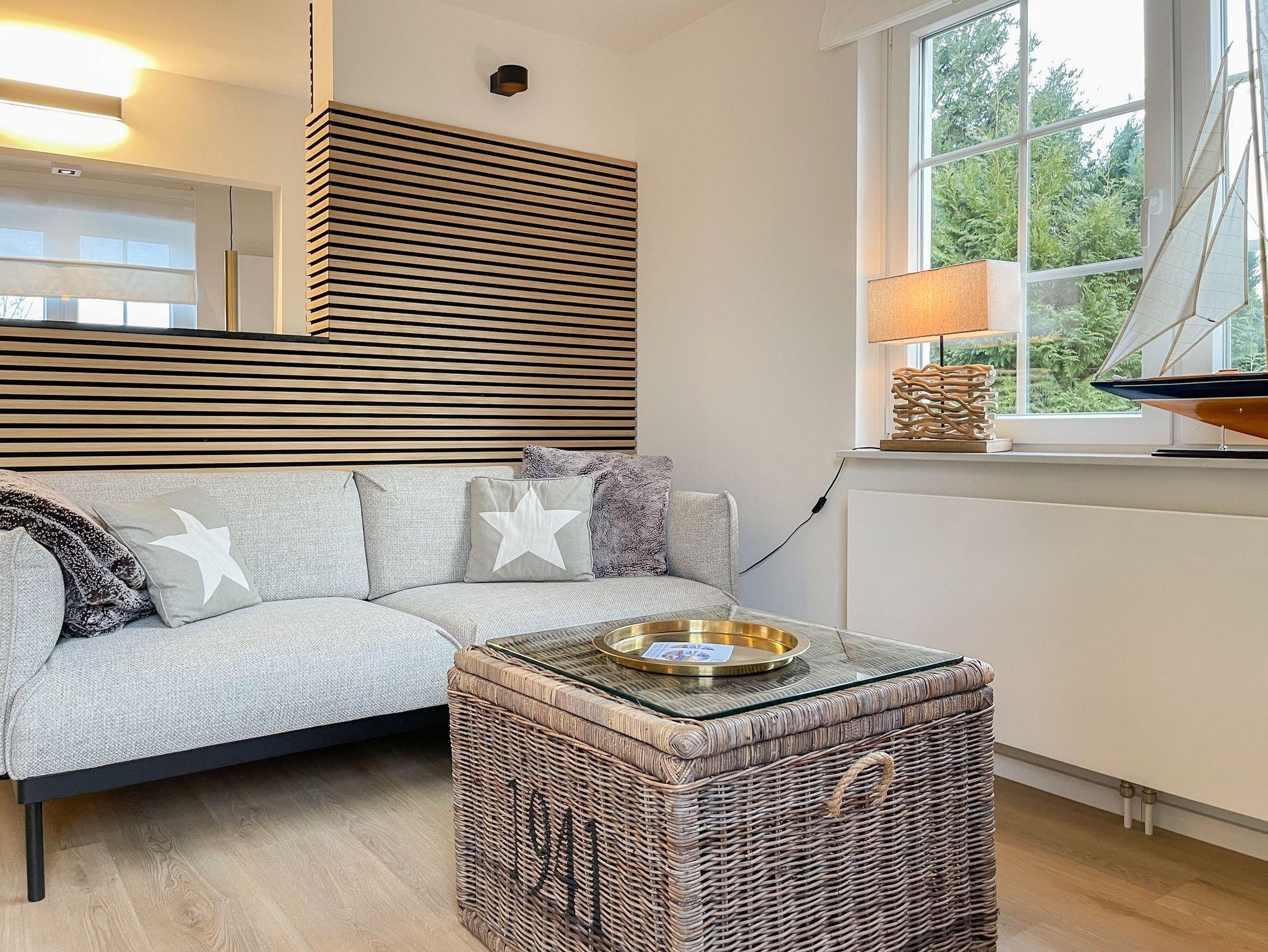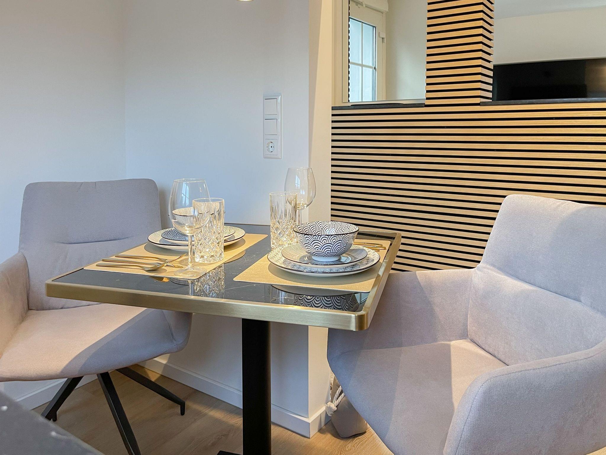 Frisch und aufwendig renoviert in 2024, erwartet Sie eine hochwertige und mit vielen liebevollen Details eingerichtete Ferienwohnung, die im Hochpaterre liegt und über einen eigenen, privaten Eingang verfügt. Ein Highlight ist die großzügige, begrünte und uneinsehbare Terrasse, für viele entspannte Stunden mit Sonnenschein vom Nachmittag bis zum Sonnenuntergang. Der stilvolle Wohnbereich mit Terrassenzugang ist lichtdurchflutet und mit einem bequemen Sofa zum Relaxen sowie einem Smart-TV ausgestattet. WLAN steht selbstverständlich zur Verfügung. Die offene Wohnküche in perfekter Ausstattung verfügt unter anderem über Spülmaschine, Backofen mit integrierter Mikrowelle, Induktionskochfeld, Kühlschrank und Gefrierfach. Der integrierte Essbereich ist sehr gemütlich gestaltet. Das großzügig angelegte Schlafzimmer ist mit einem Boxspringbett (180x200), Kleiderschrank für die Urlaubsgarderobe und einem Schreibtisch eingerichtet. Die bodentiefen Terrassenfenster lassen sich mit Vorhängen verdunkeln. Im modernen Bad sorgen zwei Fenster für reichlich Tageslicht. Die hochwertige Ausstattung umfasst eine Walk-In Dusche, Waschtisch, Spiegel mit indirekter Beleuchtung, Handtuchtrockner und WC.