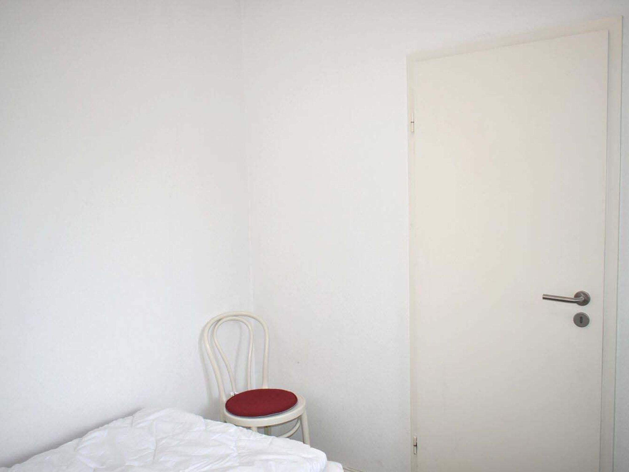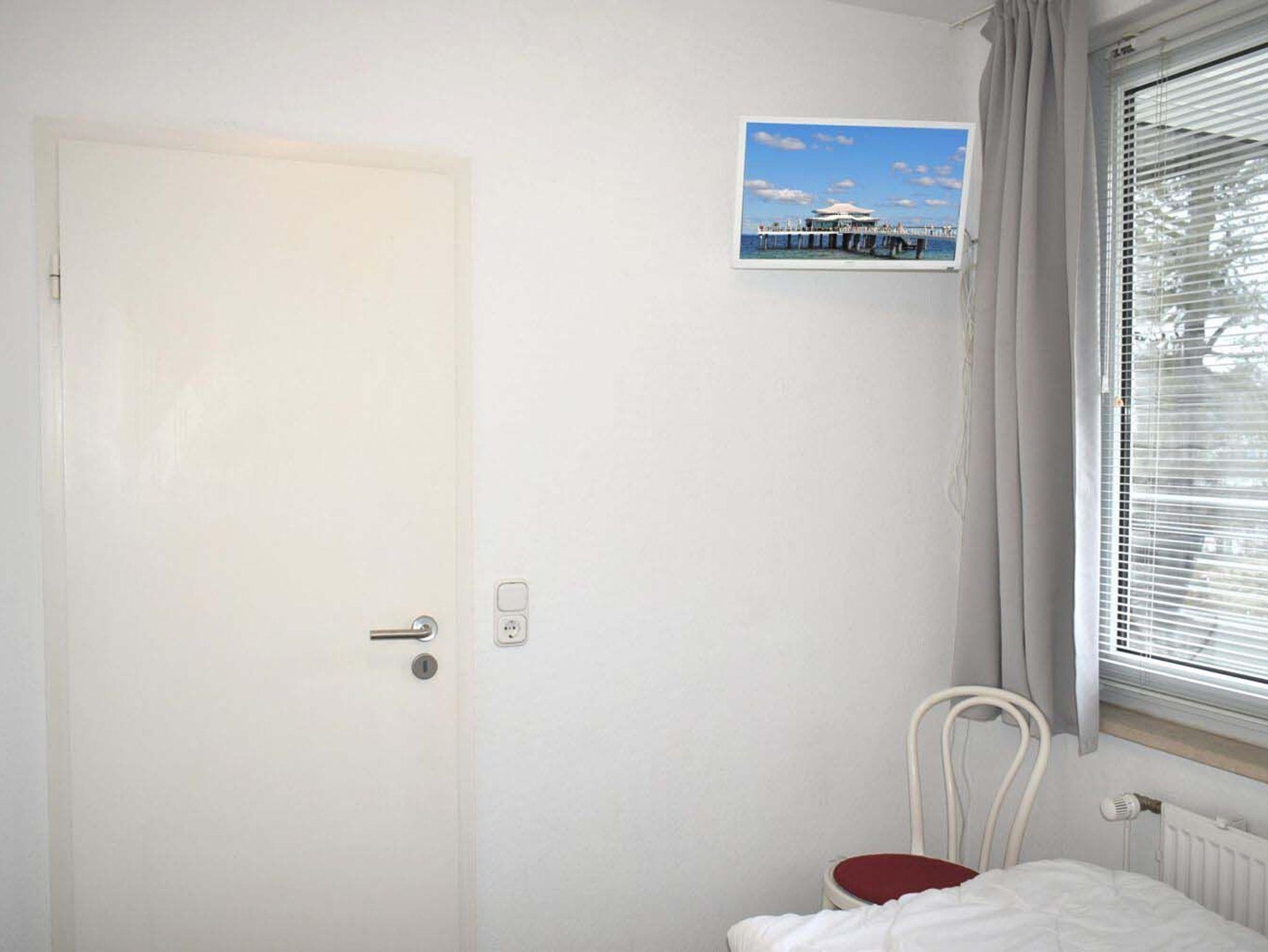 Schlafzimmer 1: 2 Einzelbetten, Kommode, Nachttischlampe, Stuhl, Tischlampe, wandhängender Sat-TV Flachbildschirm, Wecker
