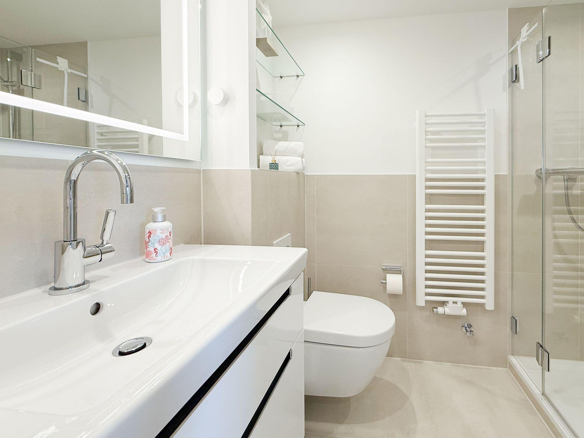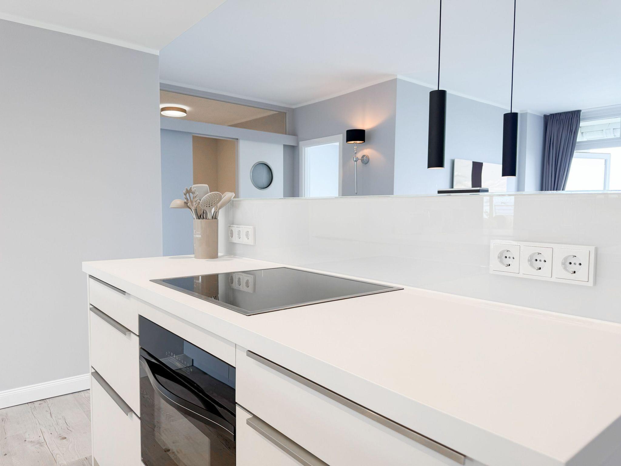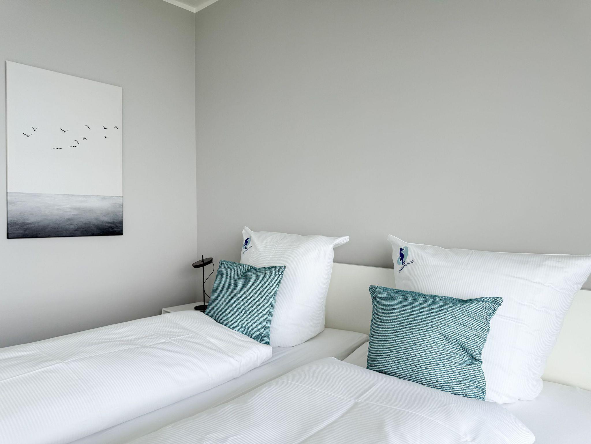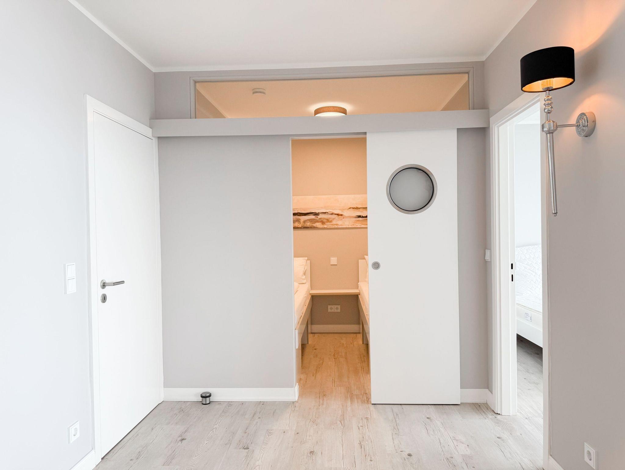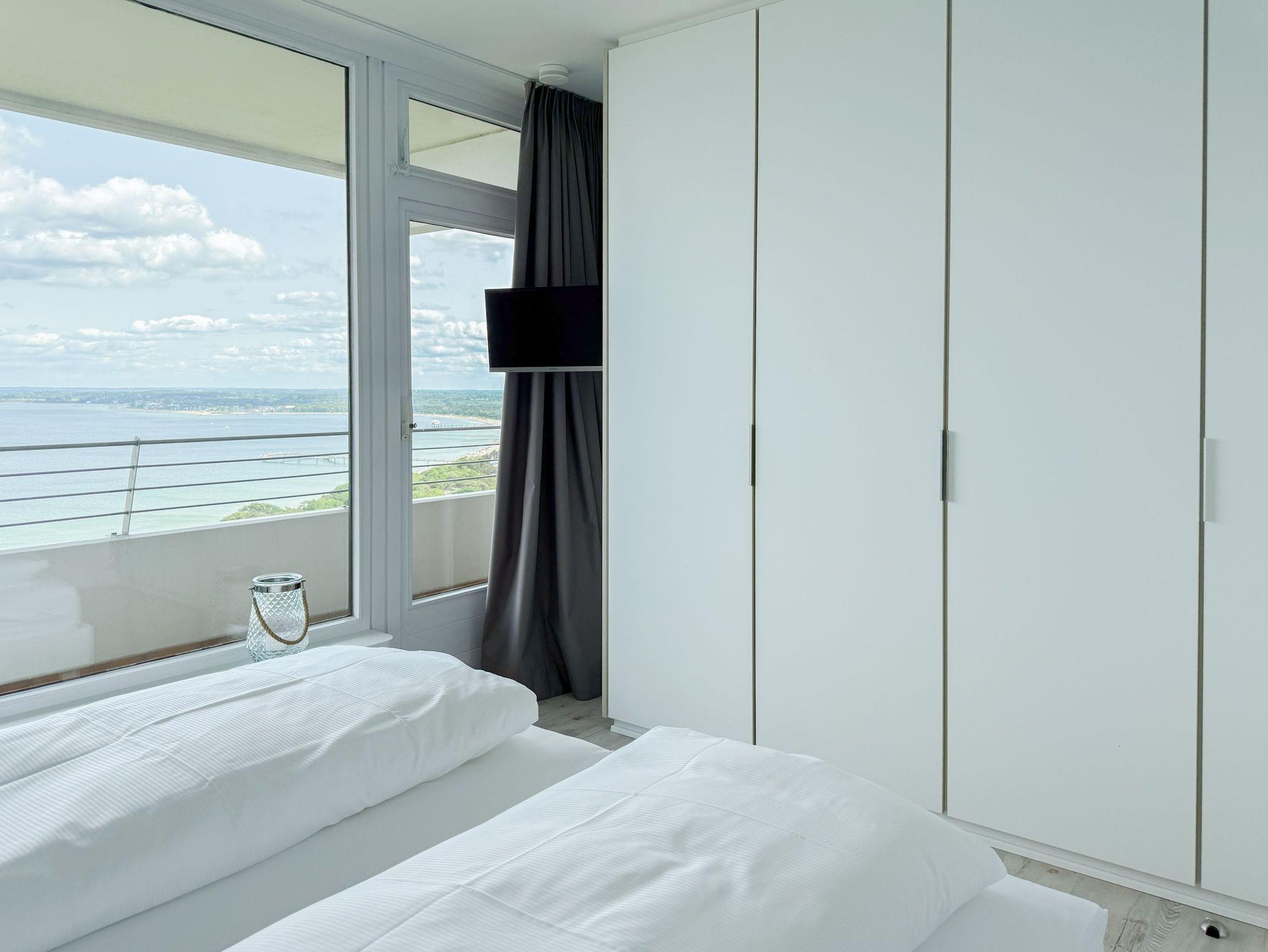 Die traumhafte Ferienwohnung Bay Oase bietet auf 75 qm höchsten Wohnkomfort durch eine luxuriöse Ausstattung und ein stilvolles Interieur bis ins letzte Detail, gestaltet durch eine Innenarchitektin, die ihr Handwerk versteht. Der großzügige Sonnenbalkon ist mit Gartenmöbeln und einer elektrischen Markise ausgestattet und sowohl vom Wohnzimmer als auch vom Schlafzimmer zugänglich. Genießen Sie tagsüber das beeindruckende Meerblickpanorama aus fast jedem Raum und bei Nacht die besondere Atmosphäre der beleuchteten Lübecker Bucht. Der in warmen, hellen Farbtönen gestaltete Wohn- und Essbereich besticht durch eine hochwertige Einrichtung und einen herrlichen Meerblick. Hier finden Sie ein gemütliches Sofa mit Loungeteil, TV, Radio und WLAN. Der Essbereich bietet Platz für vier Personen, und die integrierte Design-Küche lässt keine Wünsche offen. Das große Meerblickschlafzimmer ist mit einem Doppelbett (180x200), einem geräumigen Kleiderschrank und TV ausgestattet. Das kleinere Kojenschlafzimmer (ohne Fenster) verfügt über zwei Einzelbetten (80x200) und eine Schiebetür mit Bullauge, die für Tageslicht sorgt. Das moderne Badezimmer ist mit einem Waschtisch, Dusche, Handtuchwärmer, viel Ablagefläche und einem integrierten Waschtrockner ausgestattet. Die Steckdosen verfügen über integrierte USB Anschlüsse. Ein abschließbarer Fahrradraum für 2 Fahrräder und ein fester PKW Stellplatz in der Hotelgarage (Einfahrtshöhe 1,90/kein Aufzug) sind inklusive. (Der Stellplatz ist für große Fahrzeuge ungeeignet). Bei Verlust der Parkkarte ist Ersatz zu leisten. Ein Fahrtstuhl im Gebäude ist vorhanden.