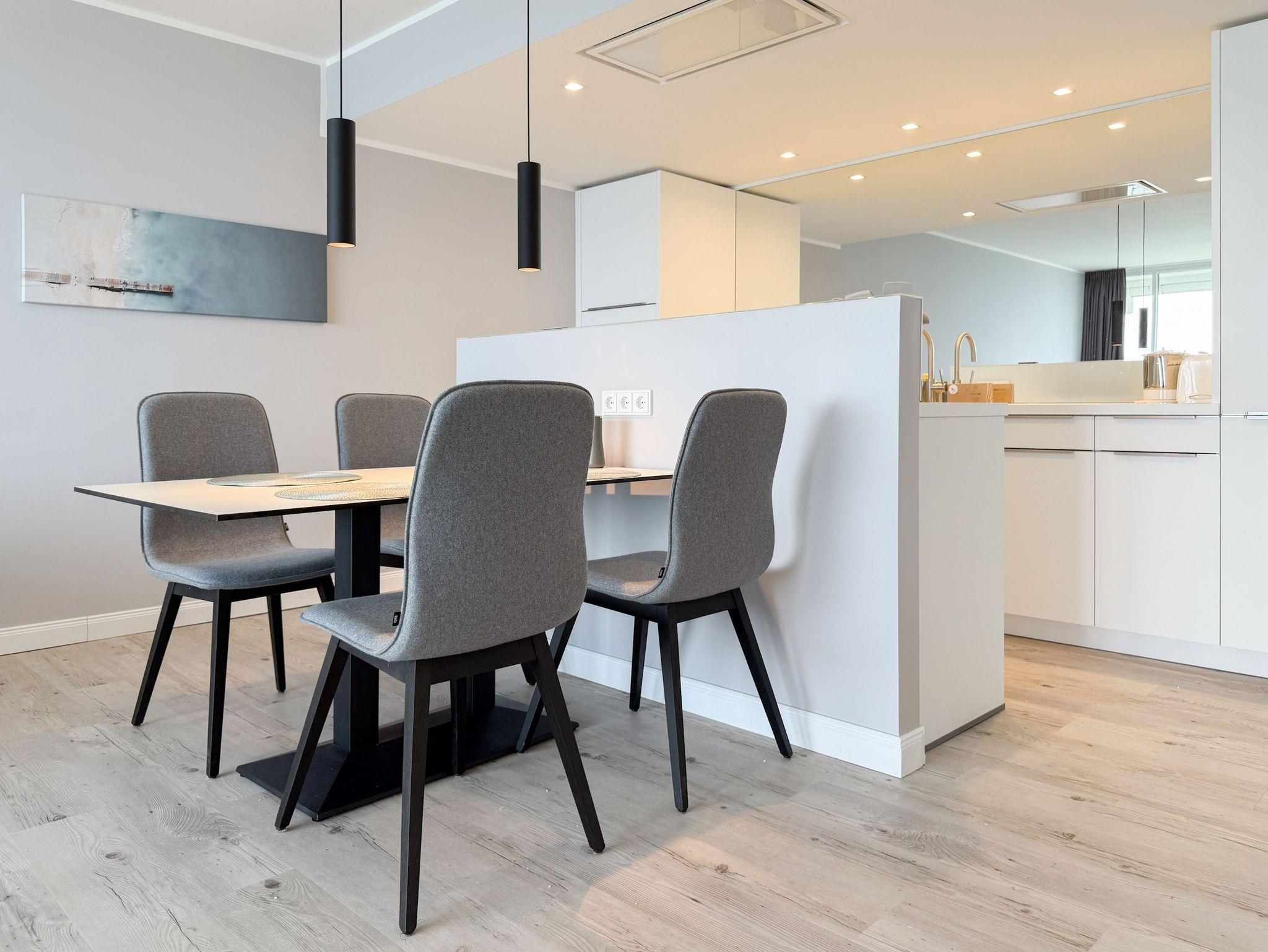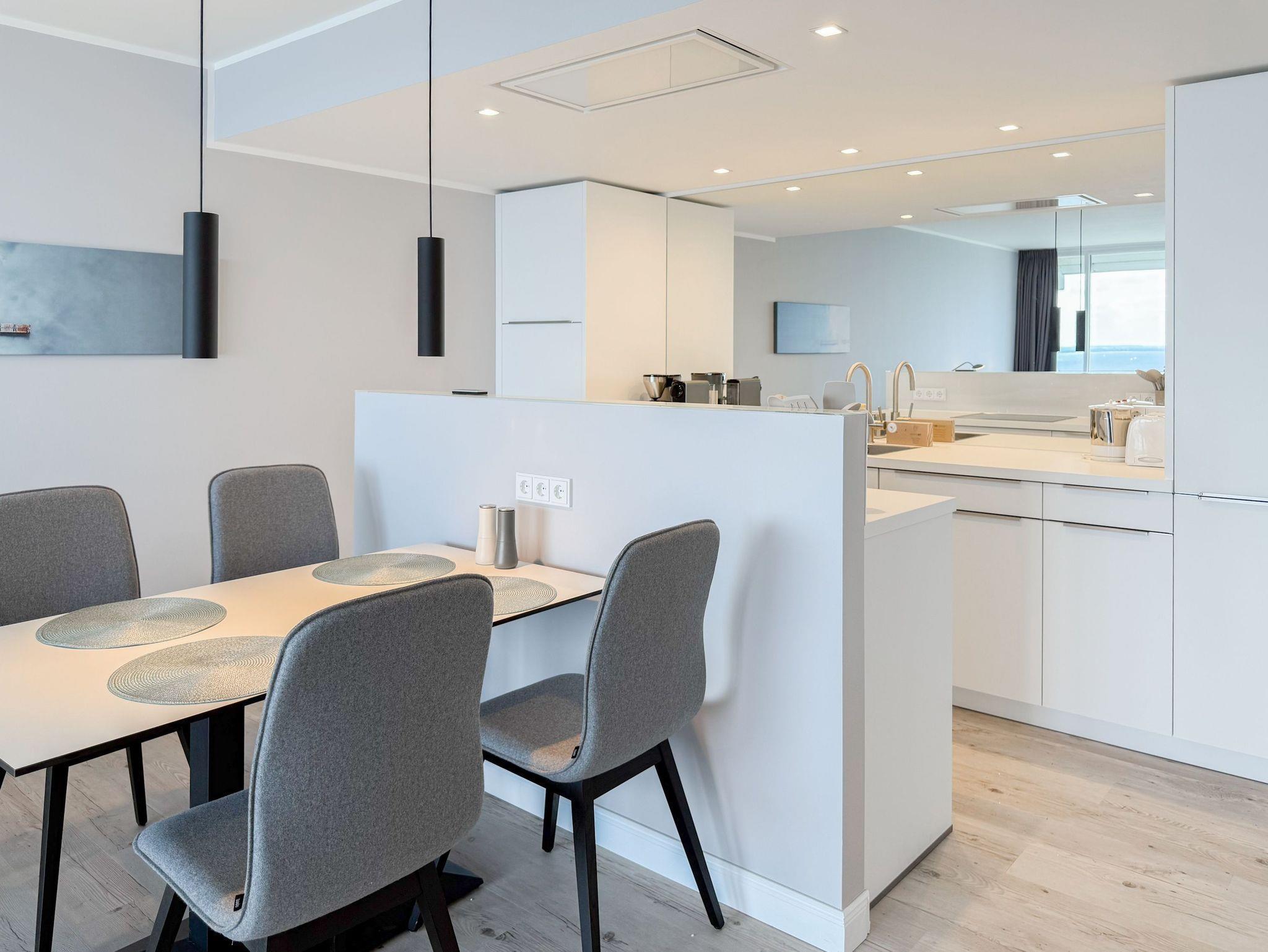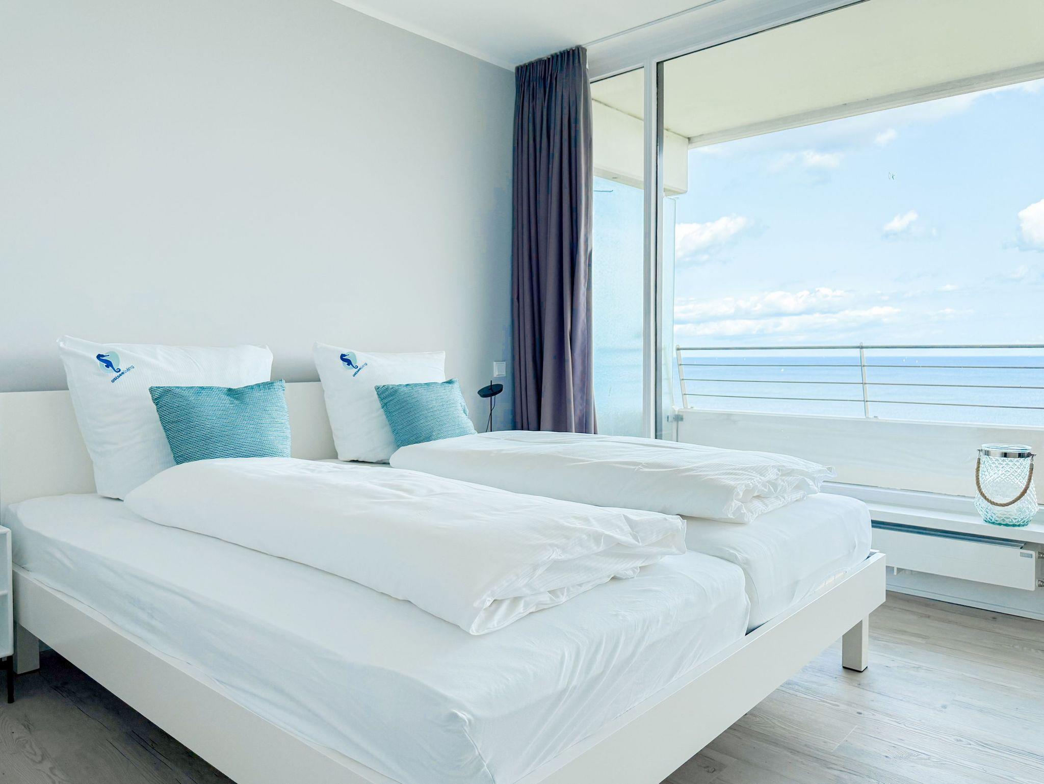 Die traumhafte Ferienwohnung „Bay Oase“ bietet auf 75 qm höchsten Wohnkomfort durch eine luxuriöse Ausstattung und ein stilvolles Interieur bis ins letzte Detail, gestaltet durch eine Innenarchitektin, die ihr Handwerk versteht. Der großzügige Sonnenbalkon ist mit Gartenmöbeln und einer elektrischen Markise ausgestattet und sowohl vom Wohnzimmer als auch vom Schlafzimmer zugänglich. Genießen Sie tagsüber das beeindruckende Meerblickpanorama aus fast jedem Raum und bei Nacht die besondere Atmosphäre der beleuchteten Lübecker Bucht. Der in warmen, hellen Farbtönen gestaltete Wohn- und Essbereich besticht durch eine hochwertige Einrichtung und einen herrlichen Meerblick. Hier finden Sie ein gemütliches Sofa mit Loungeteil, TV, Radio und WLAN. Der Essbereich bietet Platz für vier Personen, und die integrierte Design-Küche lässt keine Wünsche offen. Das große Meerblickschlafzimmer ist mit einem Doppelbett (180x200), einem geräumigen Kleiderschrank und TV ausgestattet. Das kleinere Kojenschlafzimmer (ohne Fenster) verfügt über zwei Einzelbetten (80x200) und eine Schiebetür mit Bullauge, die für Tageslicht sorgt. Das moderne Badezimmer ist mit einem Waschtisch, Dusche, Handtuchwärmer, viel Ablagefläche und einem integrierten Waschtrockner ausgestattet. Die Steckdosen verfügen über integrierte USB Anschlüsse. Ein abschließbarer Fahrradraum für 2 Fahrräder und ein fester PKW Stellplatz in der Hotelgarage (Einfahrtshöhe 1,90/kein Aufzug) sind inklusive. (Der Stellplatz ist für große Fahrzeuge ungeeignet). Bei Verlust der Parkkarte ist Ersatz zu leisten. Ein Fahrtstuhl im Gebäude ist vorhanden.