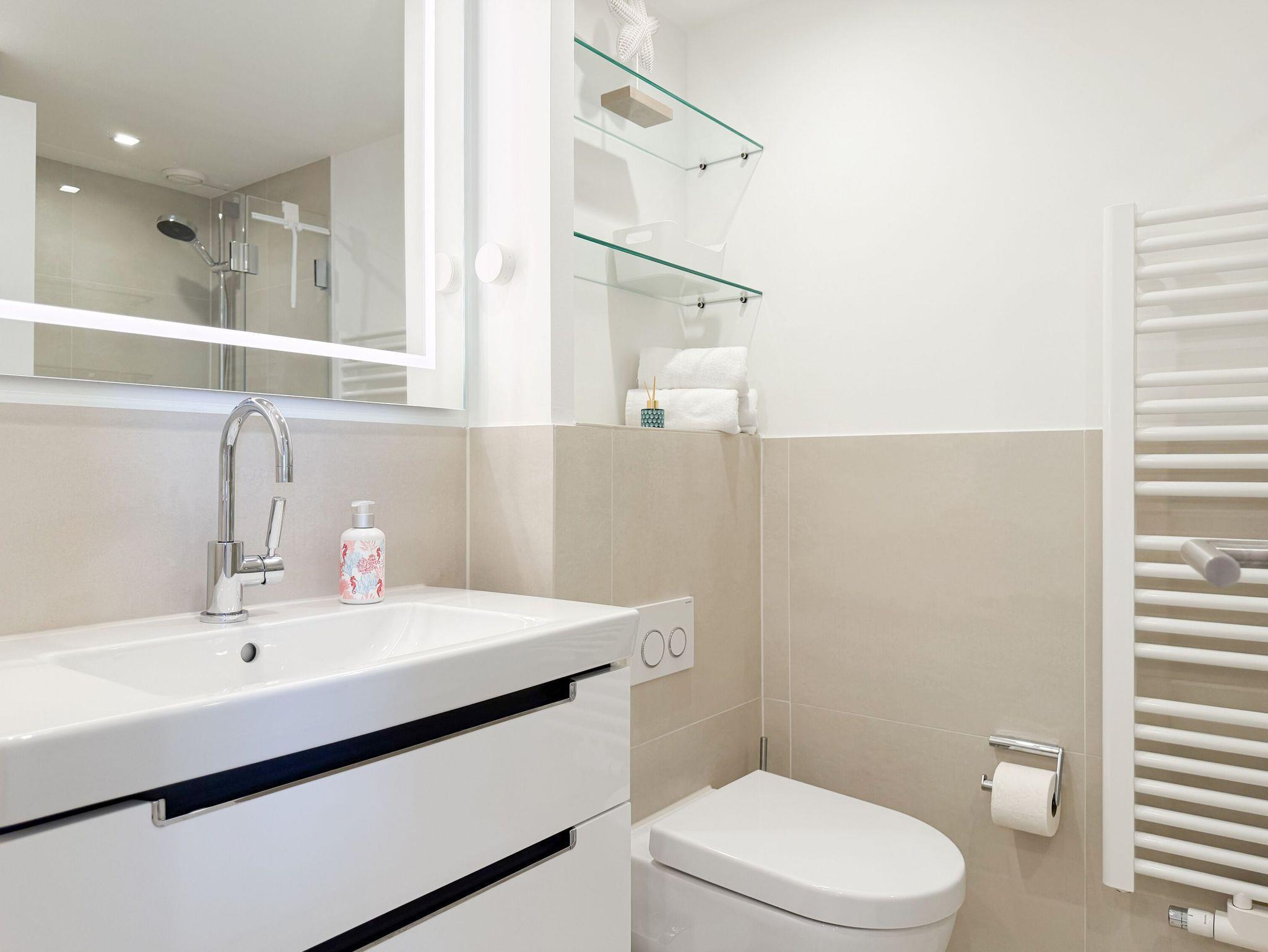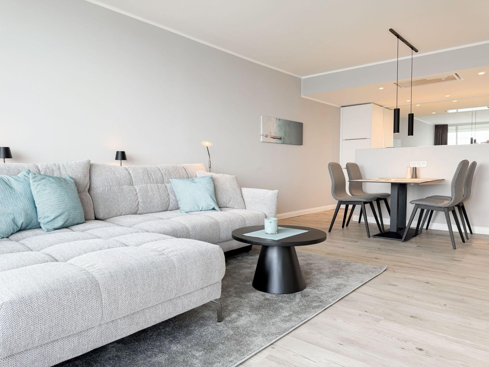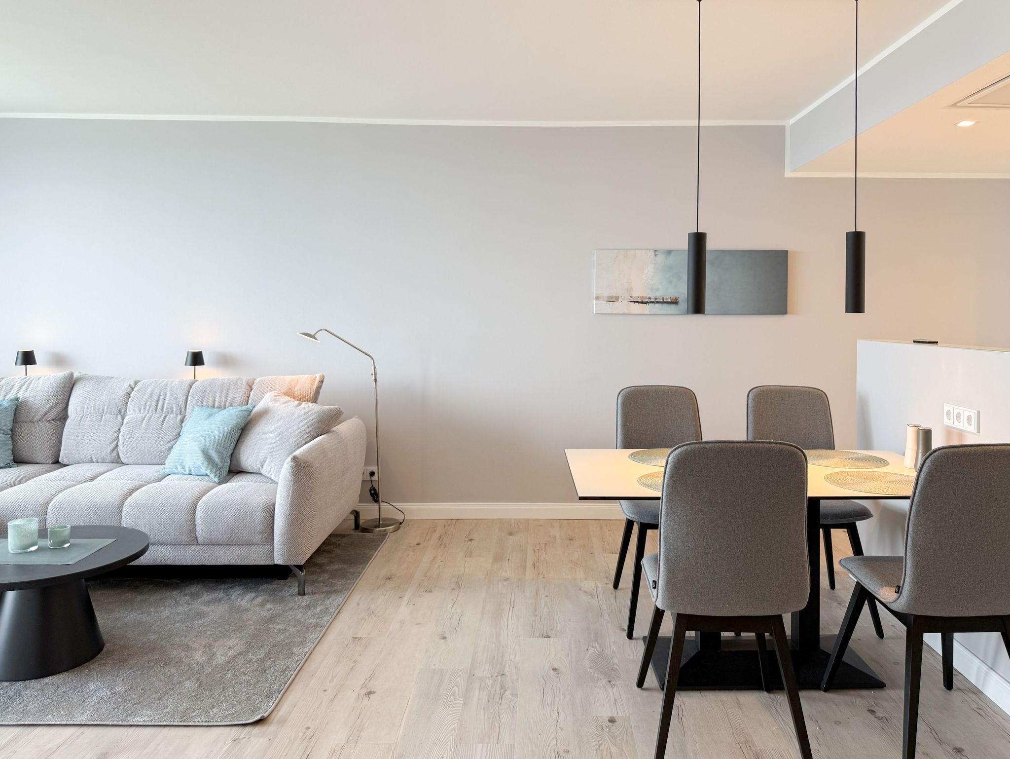 Die traumhafte Ferienwohnung „Bay Oase“ bietet auf 75 qm höchsten Wohnkomfort durch eine luxuriöse Ausstattung und ein stilvolles Interieur bis ins letzte Detail, gestaltet durch eine Innenarchitektin, die ihr Handwerk versteht. Der großzügige Sonnenbalkon ist mit Gartenmöbeln und einer elektrischen Markise ausgestattet und sowohl vom Wohnzimmer als auch vom Schlafzimmer zugänglich. Genießen Sie tagsüber das beeindruckende Meerblickpanorama aus fast jedem Raum und bei Nacht die besondere Atmosphäre der beleuchteten Lübecker Bucht. Der in warmen, hellen Farbtönen gestaltete Wohn- und Essbereich besticht durch eine hochwertige Einrichtung und einen herrlichen Meerblick. Hier finden Sie ein gemütliches Sofa mit Loungeteil, TV, Radio und WLAN. Der Essbereich bietet Platz für vier Personen, und die integrierte Design-Küche lässt keine Wünsche offen. Das große Meerblickschlafzimmer ist mit einem Doppelbett (180x200), einem geräumigen Kleiderschrank und TV ausgestattet. Das kleinere Kojenschlafzimmer (ohne Fenster) verfügt über zwei Einzelbetten (80x200) und eine Schiebetür mit Bullauge, die für Tageslicht sorgt. Das moderne Badezimmer ist mit einem Waschtisch, Dusche, Handtuchwärmer, viel Ablagefläche und einem integrierten Waschtrockner ausgestattet. Die Steckdosen verfügen über integrierte USB Anschlüsse. Ein abschließbarer Fahrradraum für 2 Fahrräder und ein fester PKW Stellplatz in der Hotelgarage (Einfahrtshöhe 1,90/kein Aufzug) sind inklusive. (Der Stellplatz ist für große Fahrzeuge ungeeignet). Bei Verlust der Parkkarte ist Ersatz zu leisten. Ein Fahrtstuhl im Gebäude ist vorhanden.