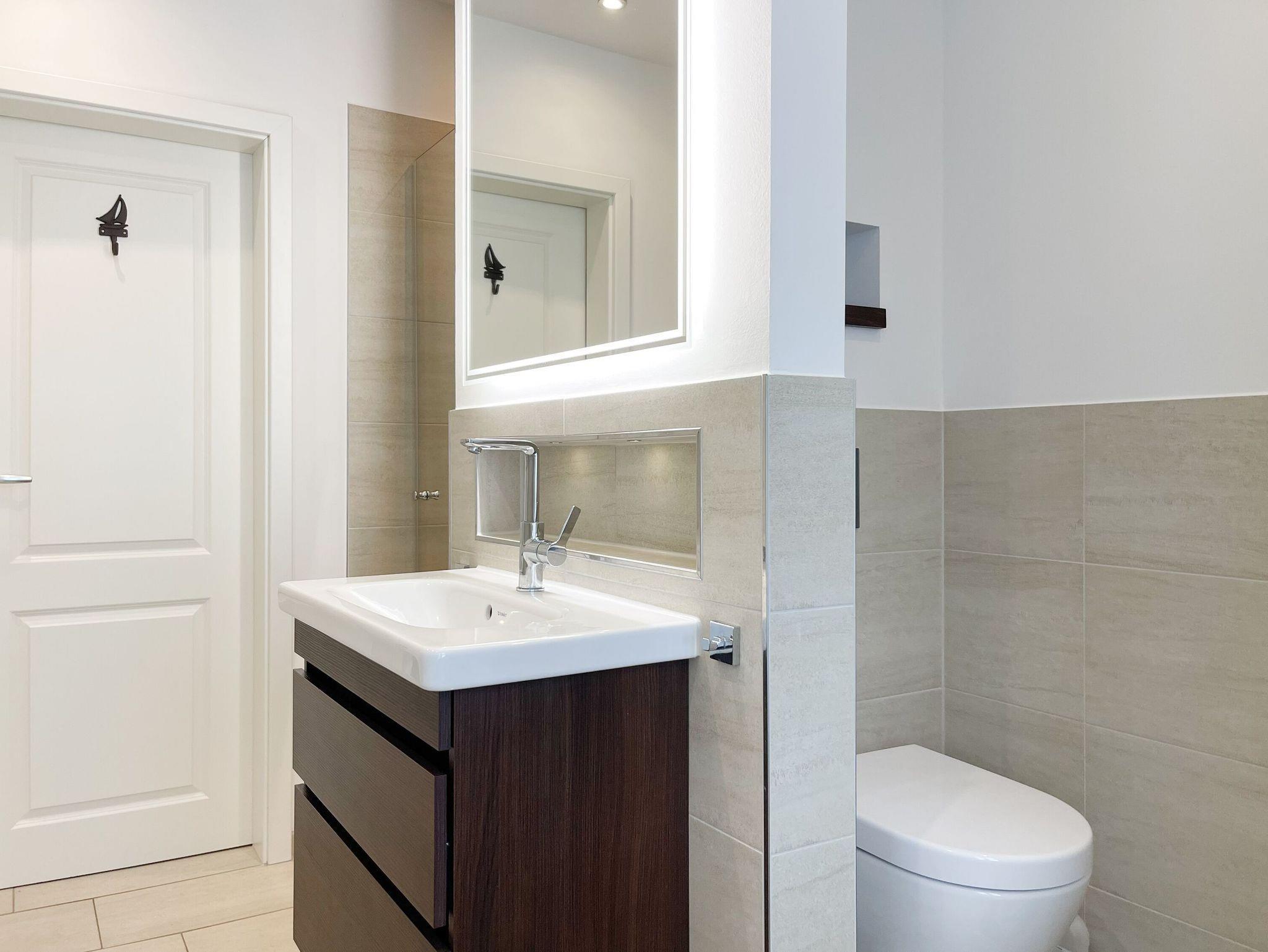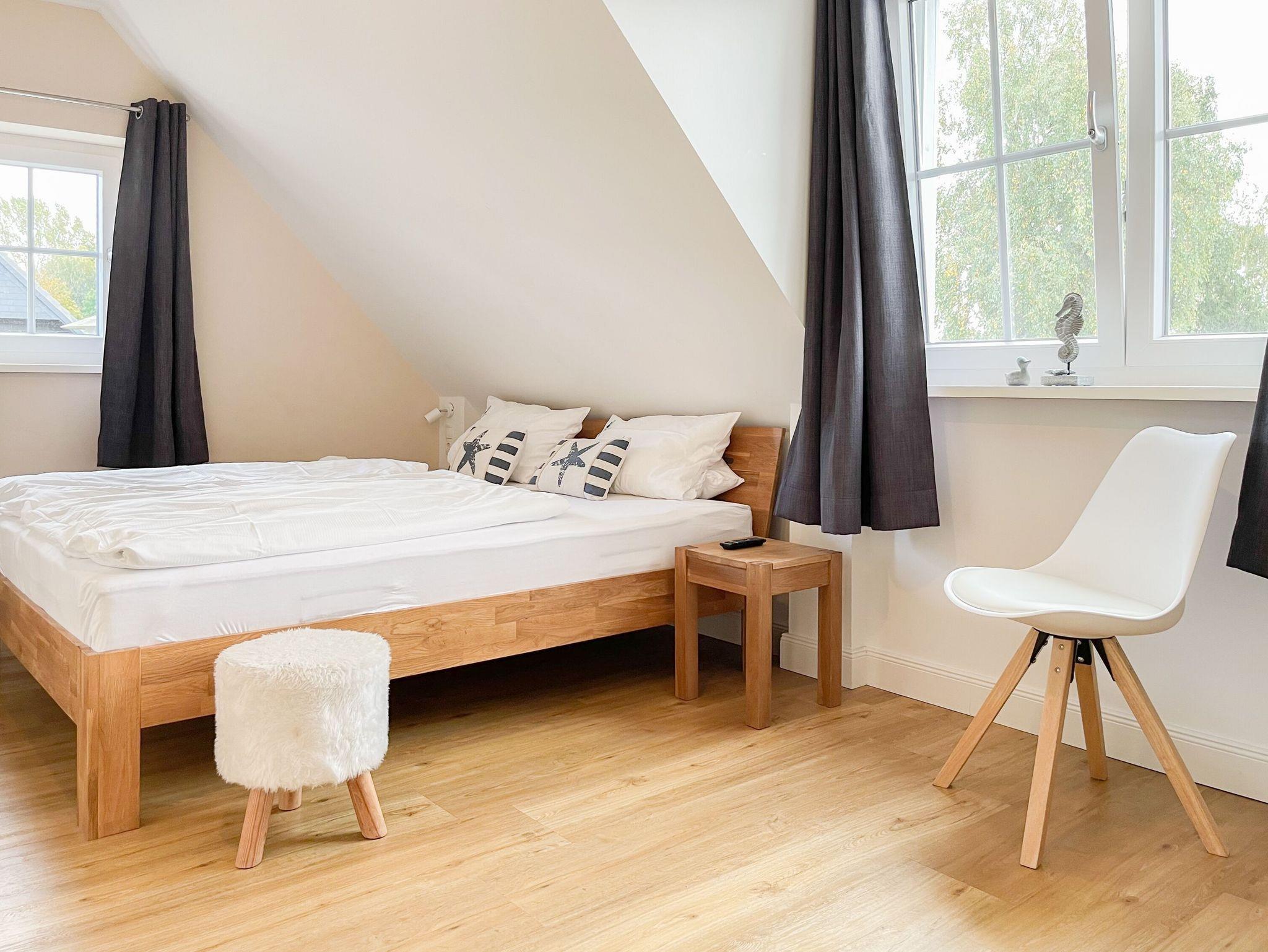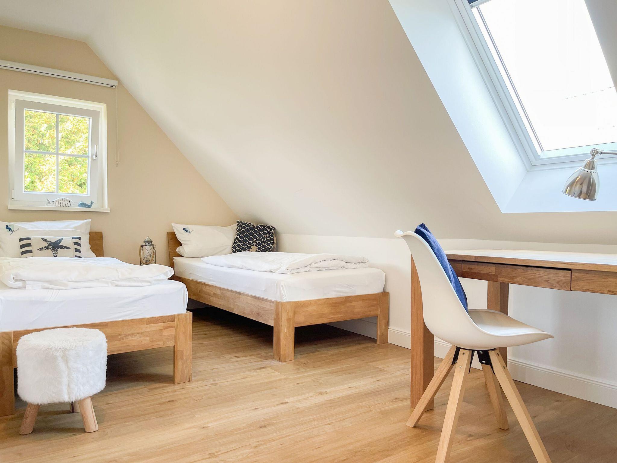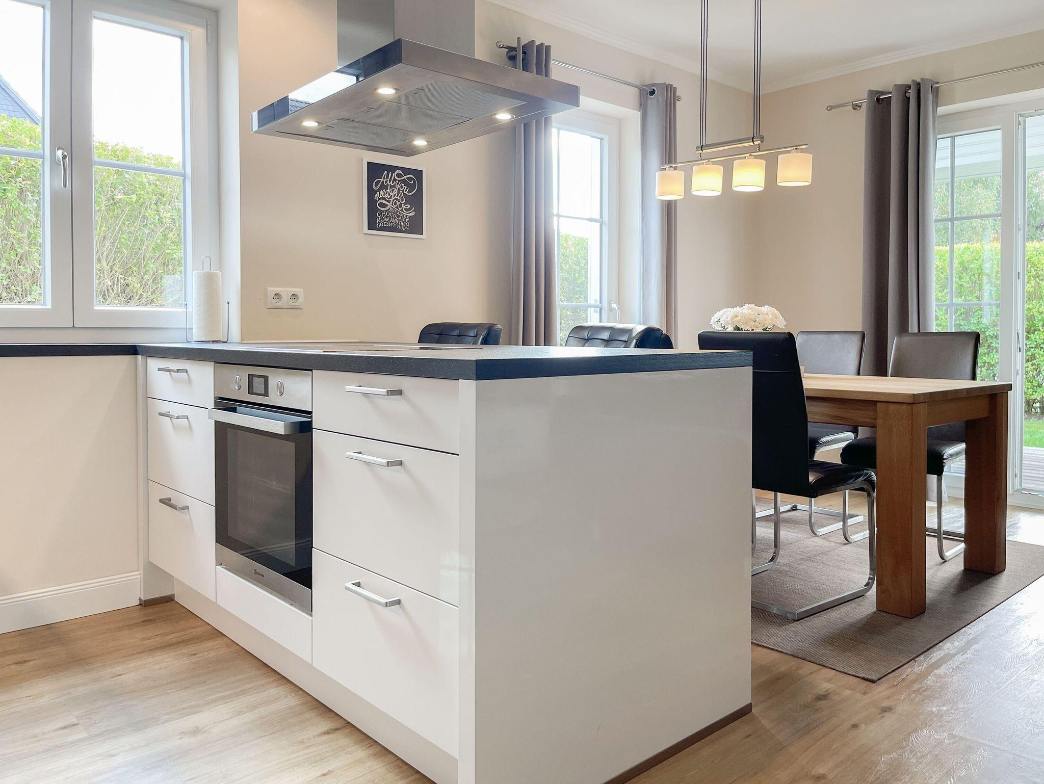 Es erwartet Sie ein wunderschönes Doppelhaus im Hampton Style. Sonnige Räumlichkeiten und die hochwertige Ausstattung sorgen für hohen Wohnstandard in einem schönen Ambiente. Mit 3 Schlafzimmern, einem modernen Bad mit Dusche und Badewanne sowie einem zusätzlichen Gäste WC, bietet das Haus auf[nbsp] 75 qm Wohnfläche ausreichend Raum für 5 Personen, um einen erholsamen Ostseeurlaub ganz nah am Strand zu verbringen. Im Erdgeschoss erwartet Sie ein gemütlich eingerichteter Wohnbereich mit Sofa, TV und Kaminofen, ein anschließender Essbereich sowie eine offene Einbauküche in bester Ausstattung zum gemeinsamen Kochen. Die vorgelagerte überdachte Veranda in Südausrichtung mit Garten ist ein herrlicher Platz zum Entspannen oder für Outdoor Aktivitäten. Ein Schlafzimmer, ausgestattet mit einem Einzelbett (90x200) und einer Kommode[nbsp] sowie ein Gäste WC, sind ebenfalls im Erdgeschoss untergebracht. Im Obergeschoss gibt es zwei separate Schlafzimmer, eines ist mit einem Doppelbett (180x200), einem Kleiderschrank und einem weiteren[nbsp] TV ausgestattet. Das andere ist mit 2 Einzelbetten (90x200), einem Kleiderschrank und einem Schreibtisch für das Homeoffice eingerichtet. Das hochwertige Bad mit Badewanne, Dusche und integrierter Waschmaschine, ist modern und lichtdurchflutet. Die Fenster der Schlafzimmer lassen sich abdunkeln (keine Blackout Verdunkelung). WLAN steht selbstverständlich zur Verfügung.