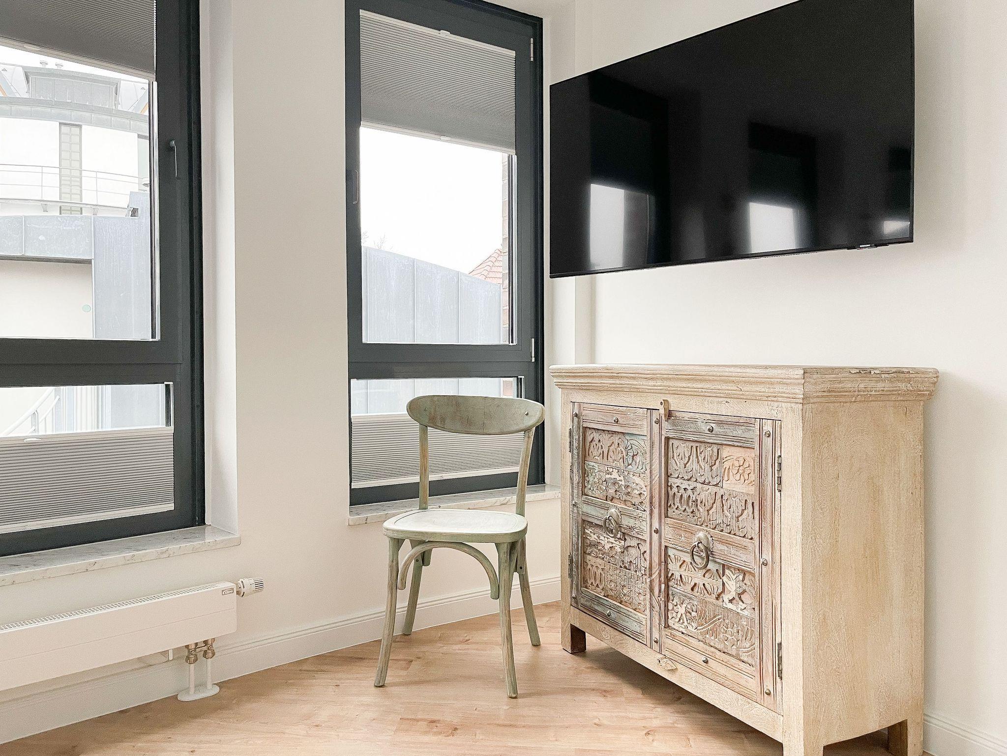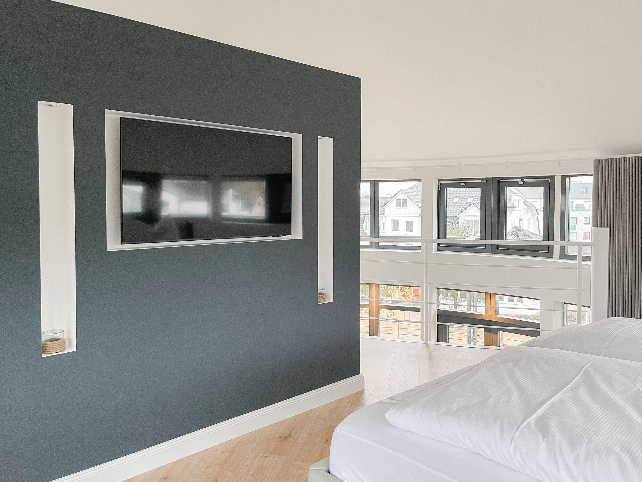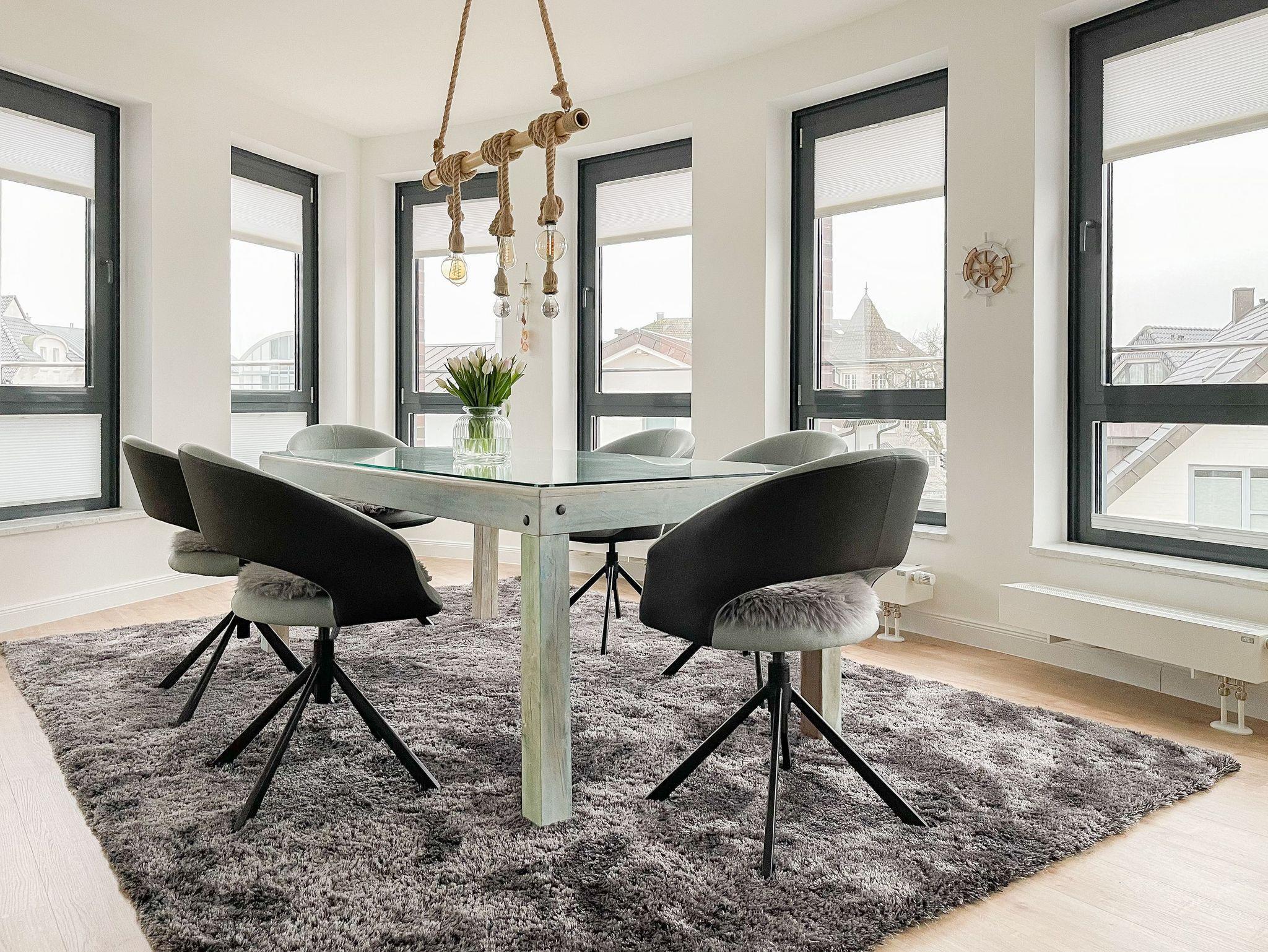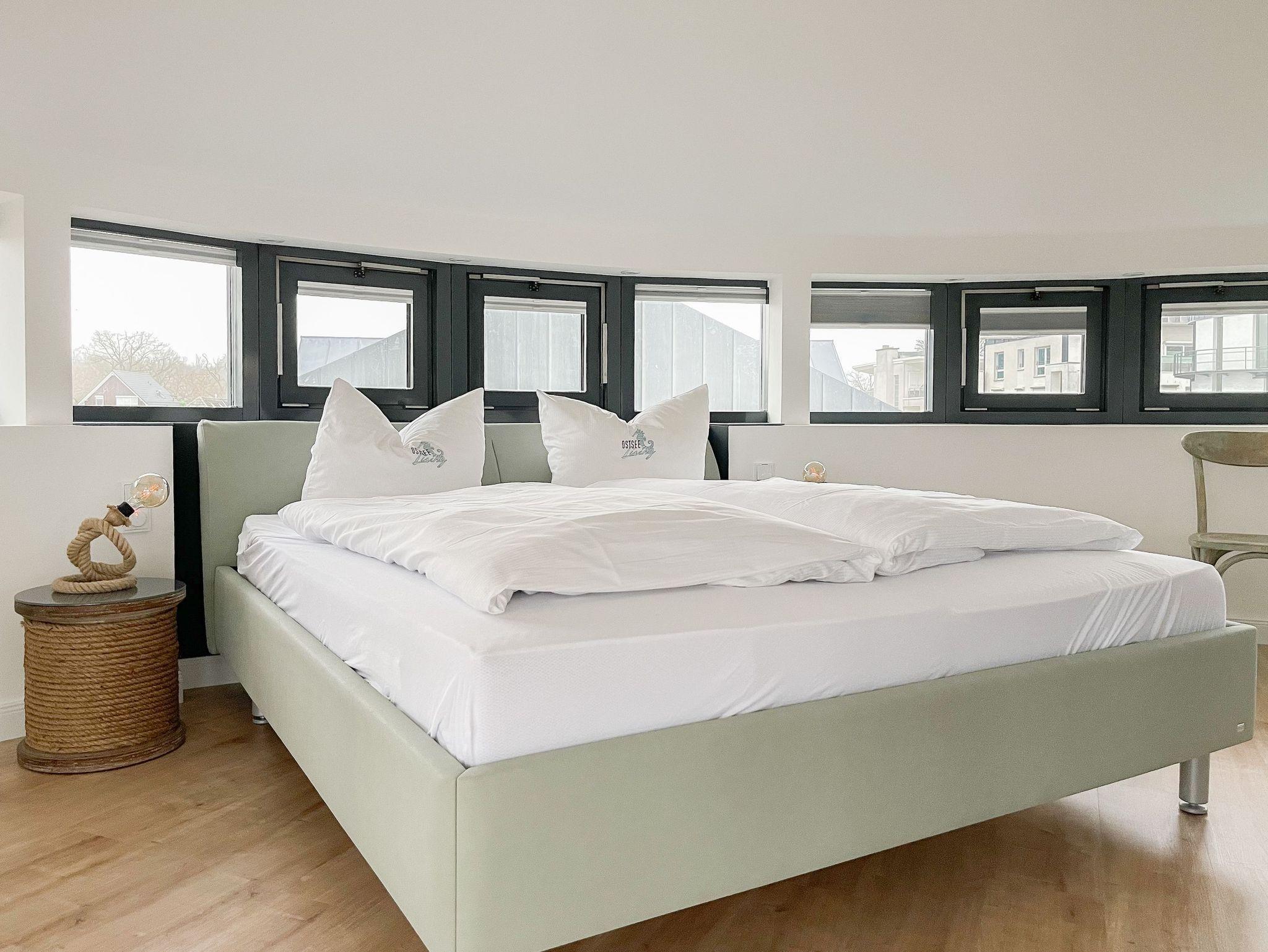 Das Penthouse Leuchtturm Lounge präsentiert sich als lichtdurchflutetes Loft mit unglaublich großzügigen Räumlichkeiten und einer faszinierenden Deckenhöhe über 2 Ebenen im Wohnbereich. Eine Wendeltreppe führt auf die riesige Empore, ein echtes architektonisches Highlight, eingerichtet mit einem traumhaften Schlafzimmer mit Klimaanlage und TV, einem Büro und kleinem exklusiven Duschbad ensuite. Ein weiteres Highlight ist definitiv die riesige Dachterrasse in Südausrichtung für viele gemeinsame Sonnenstunden, die mit einer Essgruppe und XXL Strandkorb ausgestattet ist. Im überaus weitläufigen Wohn- Essbereich mit anschließender Wohnküche in top Ausstattung, spielt sich das Leben ab. Die gemütliche Sofalandschaft und der großzügige Essbereich bieten viel Raum, um einen entspannten Urlaub zu verleben. Durch die Kombination von anspruchsvollem Design, hochwertigen Materialien und warmen Farben ist es der Innenarchitektin gelungen, eine wunderbare Wohnatmosphäre zu schaffen. Es gibt 2 weitere großzügige Schlafzimmer, die[nbsp] wie auch das Emporenschlafzimmer über hochwertige Ruf[nbsp] Boxspringbetten (180x200), Einbauschränke, TV und Verdunkelungsplissees verfügen sowie ein weiteres exklusives Duschbad. Beide Bäder sind mit einem Radio ausgestattet. Eine Waschmaschine ist in die Küche integriert. Zum Penthouse (2. Etage) gehört ein reservierter Stellplatz in der Tiefgarage ( Einfahrtshöhe 1,90 m ). Ein Fahrstuhl ist nicht vorhanden. Das Penthouse ist aufgrund der offenen Treppe und Empore nicht unbedingt für Kleinkinder geeignet.