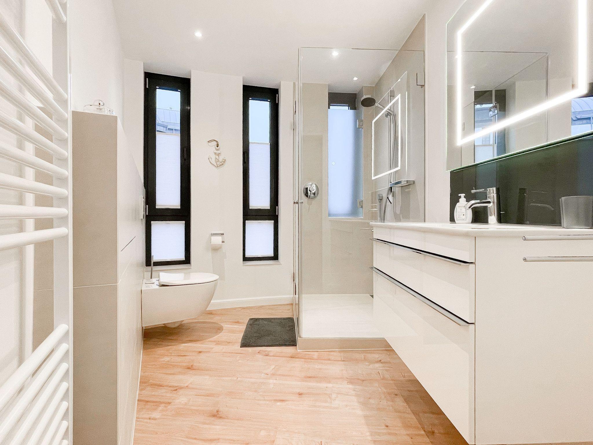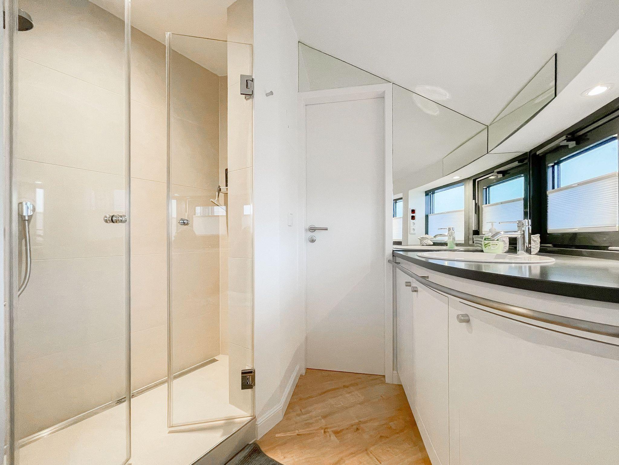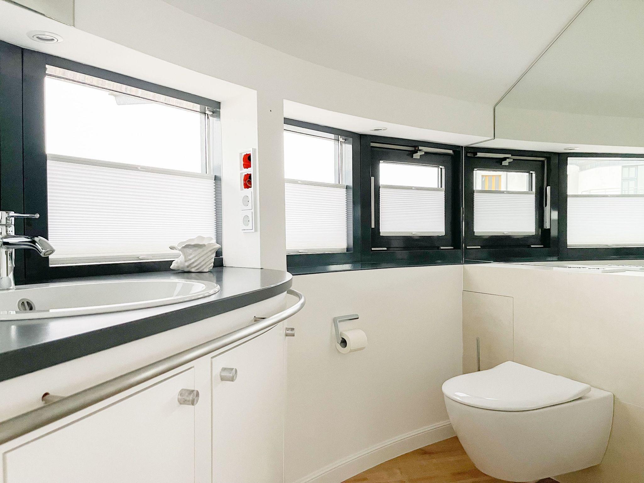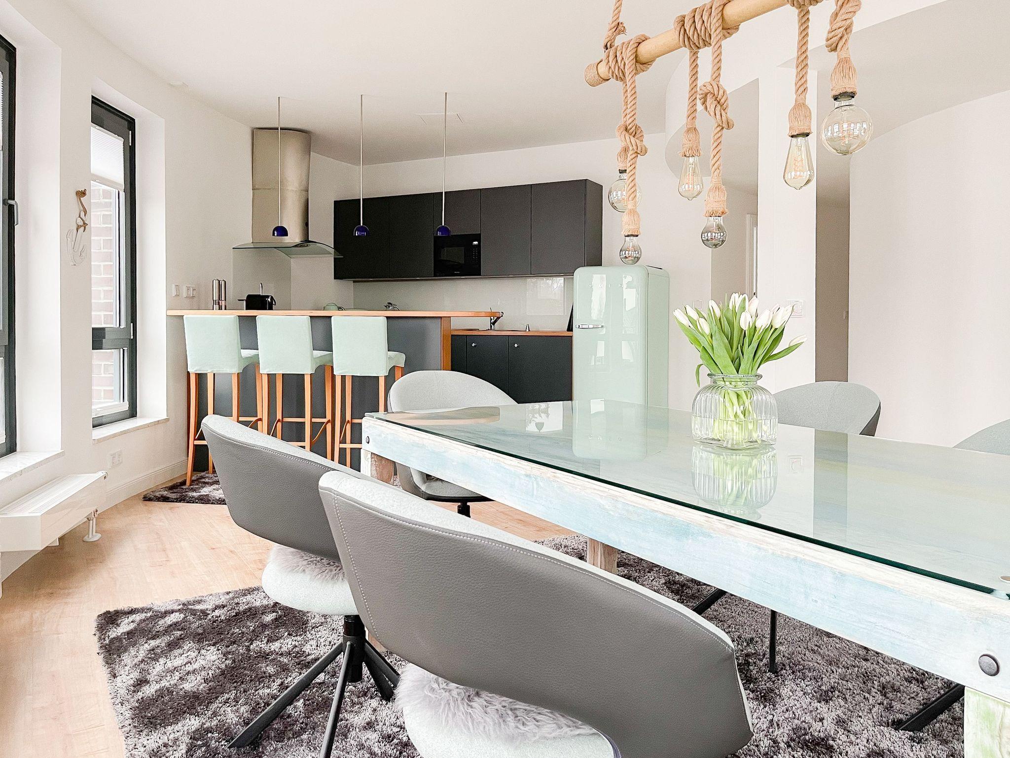 Das Penthouse Leuchtturm Lounge präsentiert sich als lichtdurchflutetes Loft mit unglaublich großzügigen Räumlichkeiten und einer faszinierenden Deckenhöhe über 2 Ebenen im Wohnbereich. Eine Wendeltreppe führt auf die riesige Empore, ein echtes architektonisches Highlight, eingerichtet mit einem traumhaften Schlafzimmer mit Klimaanlage und TV, einem Büro und kleinem exklusiven Duschbad ensuite. Ein weiteres Highlight ist definitiv die riesige Dachterrasse in Südausrichtung für viele gemeinsame Sonnenstunden, die mit einer Essgruppe und XXL Strandkorb ausgestattet ist. Im überaus weitläufigen Wohn- Essbereich mit anschließender Wohnküche in top Ausstattung, spielt sich das Leben ab. Die gemütliche Sofalandschaft und der großzügige Essbereich bieten viel Raum, um einen entspannten Urlaub zu verleben. Durch die Kombination von anspruchsvollem Design, hochwertigen Materialien und warmen Farben ist es der Innenarchitektin gelungen, eine wunderbare Wohnatmosphäre zu schaffen. Es gibt 2 weitere großzügige Schlafzimmer, die[nbsp] wie auch das Emporenschlafzimmer über hochwertige Ruf[nbsp] Boxspringbetten (180x200), Einbauschränke, TV und Verdunkelungsplissees verfügen sowie ein weiteres exklusives Duschbad. Beide Bäder sind mit einem Radio ausgestattet. Eine Waschmaschine ist in die Küche integriert. Zum Penthouse (2. Etage) gehört ein reservierter Stellplatz in der Tiefgarage ( Einfahrtshöhe 1,90 m ). Ein Fahrstuhl ist nicht vorhanden. Das Penthouse ist aufgrund der offenen Treppe und Empore nicht unbedingt für Kleinkinder geeignet.