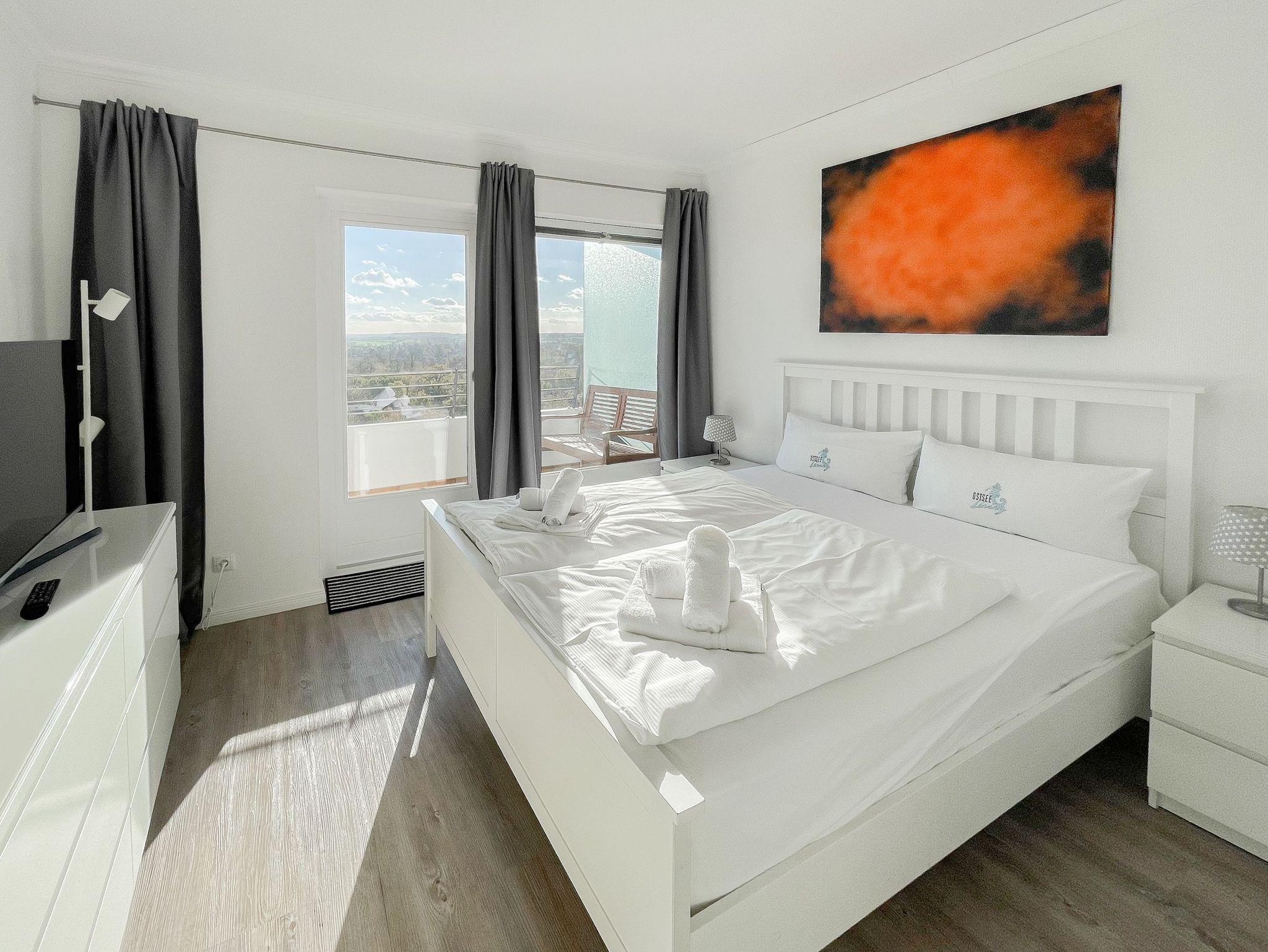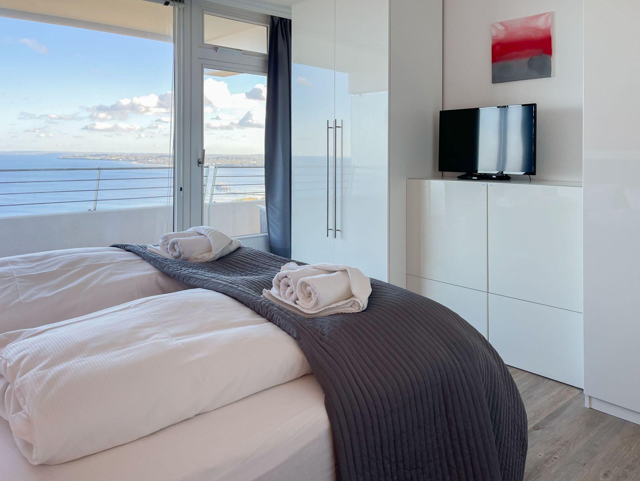 Die großzügige Eckwohnung bietet[nbsp] mit 2 Schlafzimmern und 2 Bädern auf 120 qm höchsten Wohnkomfort für 4 Personen, um einen entspannten Urlaub zu verleben. Der umlaufende Sonnenbalkon ist sowohl vom Wohnbereich als auch von den [nbsp]beiden Schlafzimmern zugänglich. Genießen Sie tagsüber das sensationelle Meerblickpanorama aus nahezu jedem Raum und bei Dunkelheit die besondere Atmosphäre der beleuchteten Lübecker Bucht. Es steht ein großzügiges[nbsp] Wohnzimmer mit anschließendem Essbereich für 4 Personen zur Verfügung. In der offenen, bestens ausgestatteten Designküche mit Induktionskochfeld, Mikrowelle und Spülmaschine, ist ebenfalls eine Waschmaschine untergebracht. Die beiden Schlafzimmer sind jeweils mit einem Doppelbett (180x200 und 160x200) und TV ausgestattet. Die Fenster sind mit Verdunkelungsvorhängen versehen. Zwei neue, hochwertige Bäder, eines mit Dusche und eines mit Badewanne, runden das Angebot ab. Ein fester PKW Stellplatz in der Hotelgarage (Einfahrtshöhe 1,90/kein Aufzug) ist[nbsp] inklusive. Bei Verlust der Parkkarte ist Ersatz zu leisten.