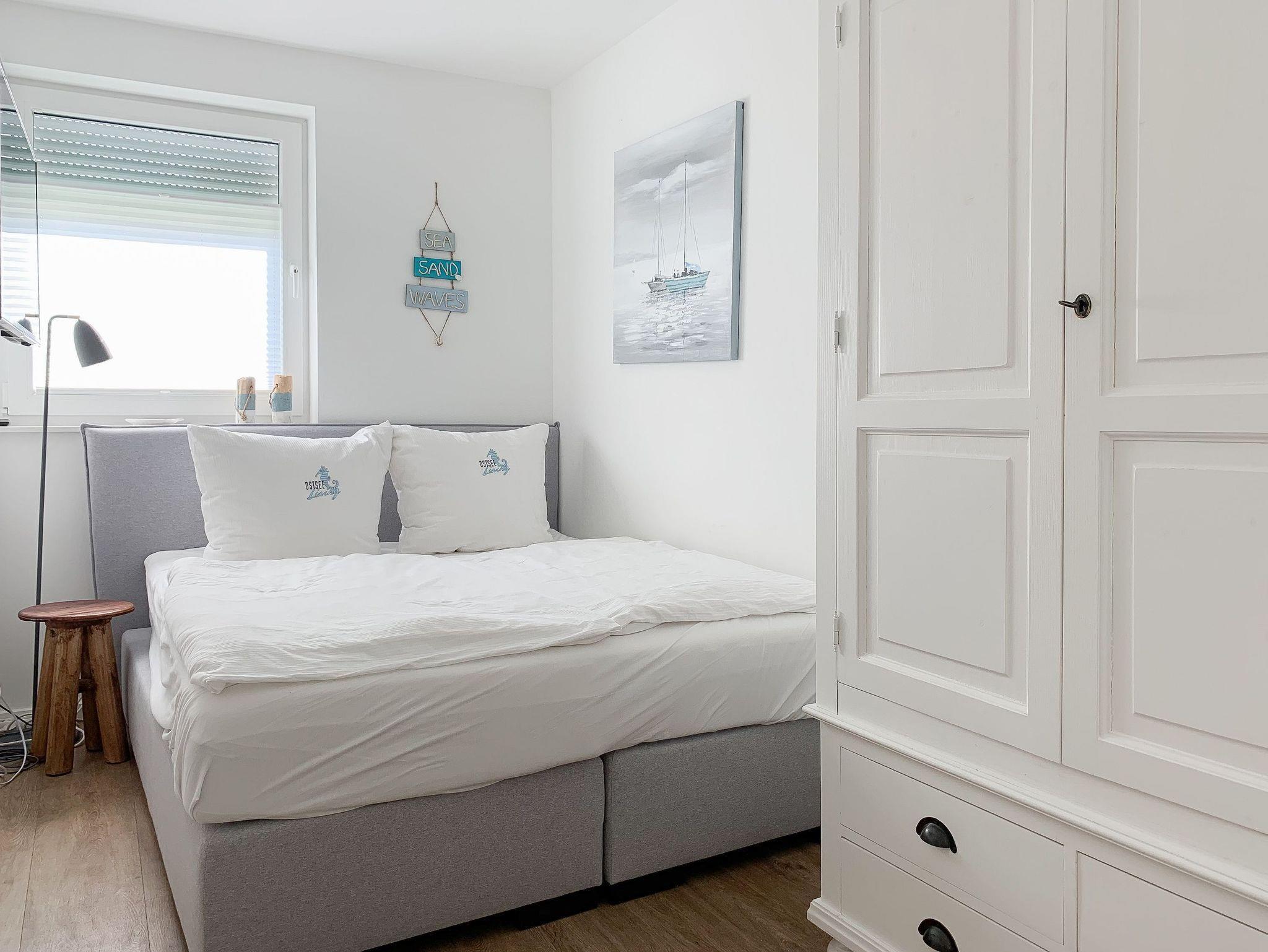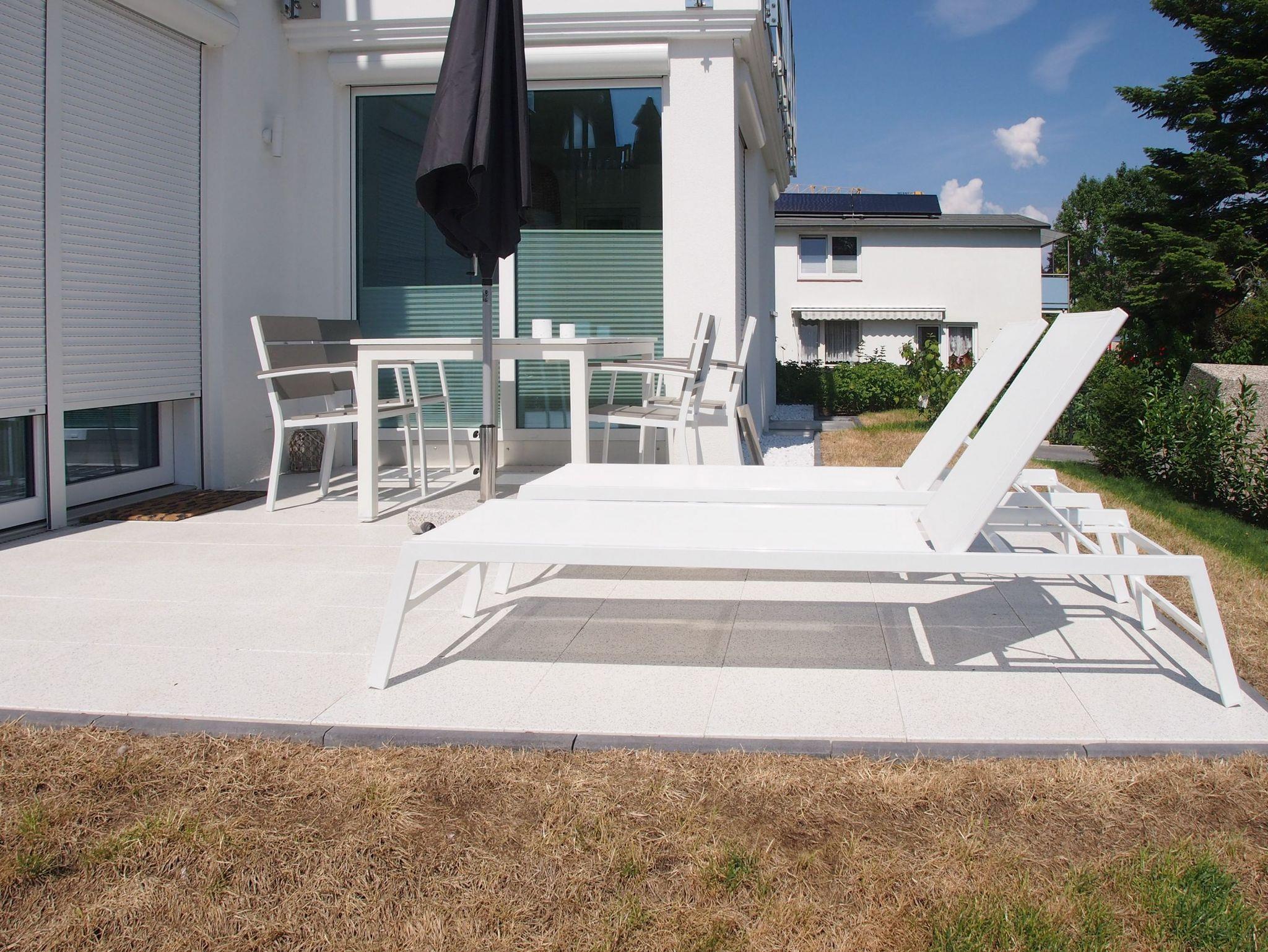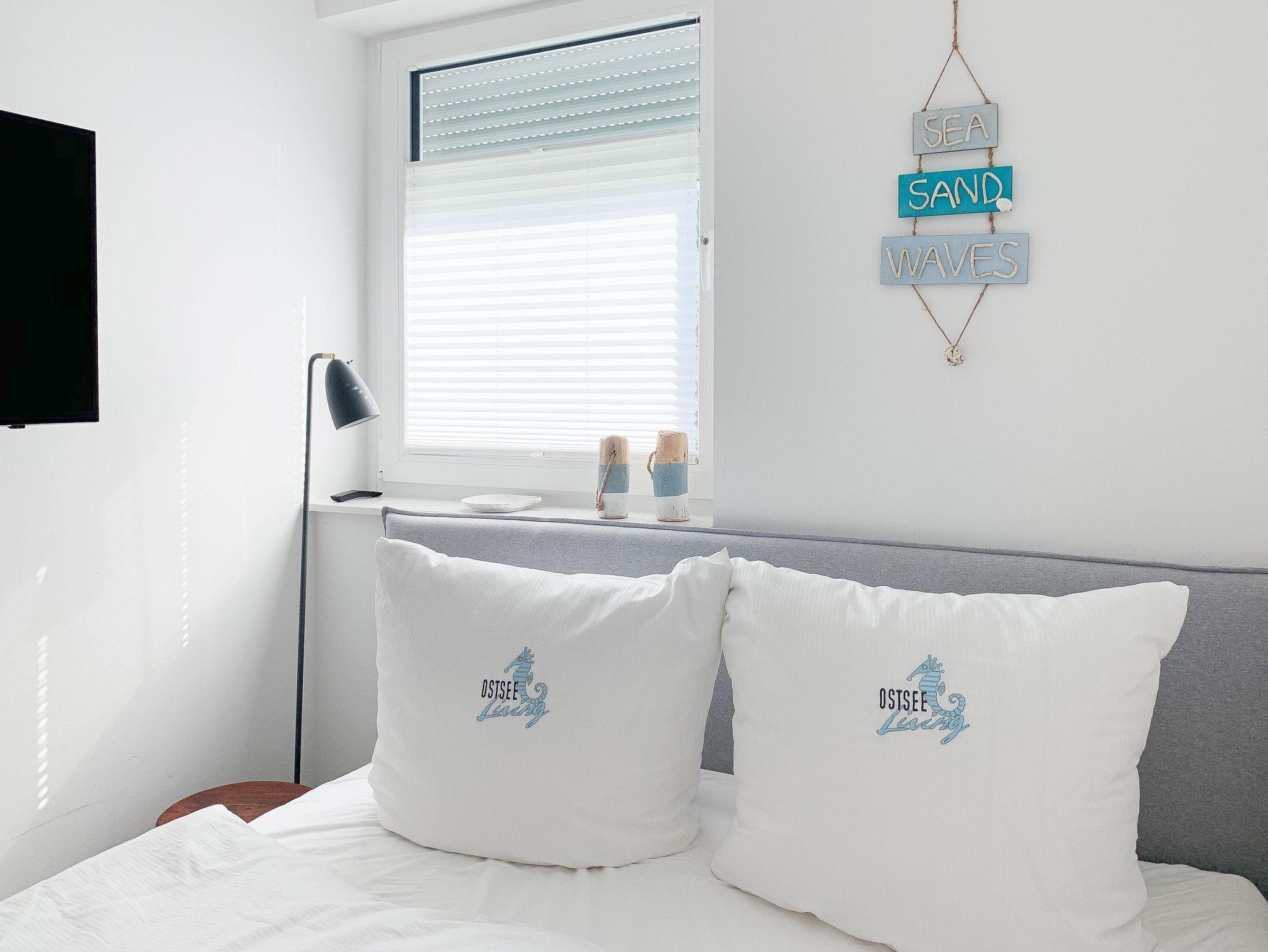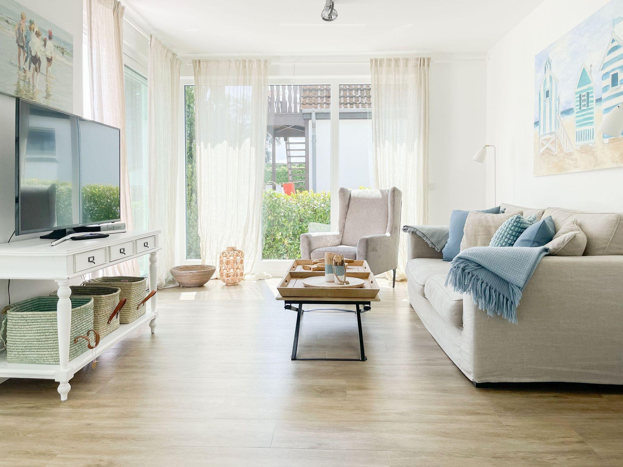 Die Ferienwohnung ist hochwertig ausgestattet und geschmackvoll eingerichtet. Bodentiefe Fensterflächen sorgen für einen lichtdurchfluteten Wohnbereich mit einem gemütlichen Sofa, Sessel und TV. Die vorgelagerte Sonnenterrasse ist ein wunderbarer Platz, um entspannte Urlaubstage zu genießen. Die offene Einbauküche mit angrenzendem Essbereich ist bestens mit allen technischen Geräten ausgestattet, um höchsten Ansprüchen zu genügen. Es stehen zwei separate Schlafzimmer zur Verfügung, die beide mit Boxspringbetten (180x200 und 160x200), Kleiderschrank und TV ausgestattet sind. Das hochwertige Duschbad mit integrierter Waschmaschine und integriertem Trockner ist großzügig angelegt und bietet reichlich Tageslicht. Die gesamte Wohnung ist mit elektrischen Außenjalousien versehen und verfügt über eine Fußbodenheizung für ein angenehmes Raumklima.