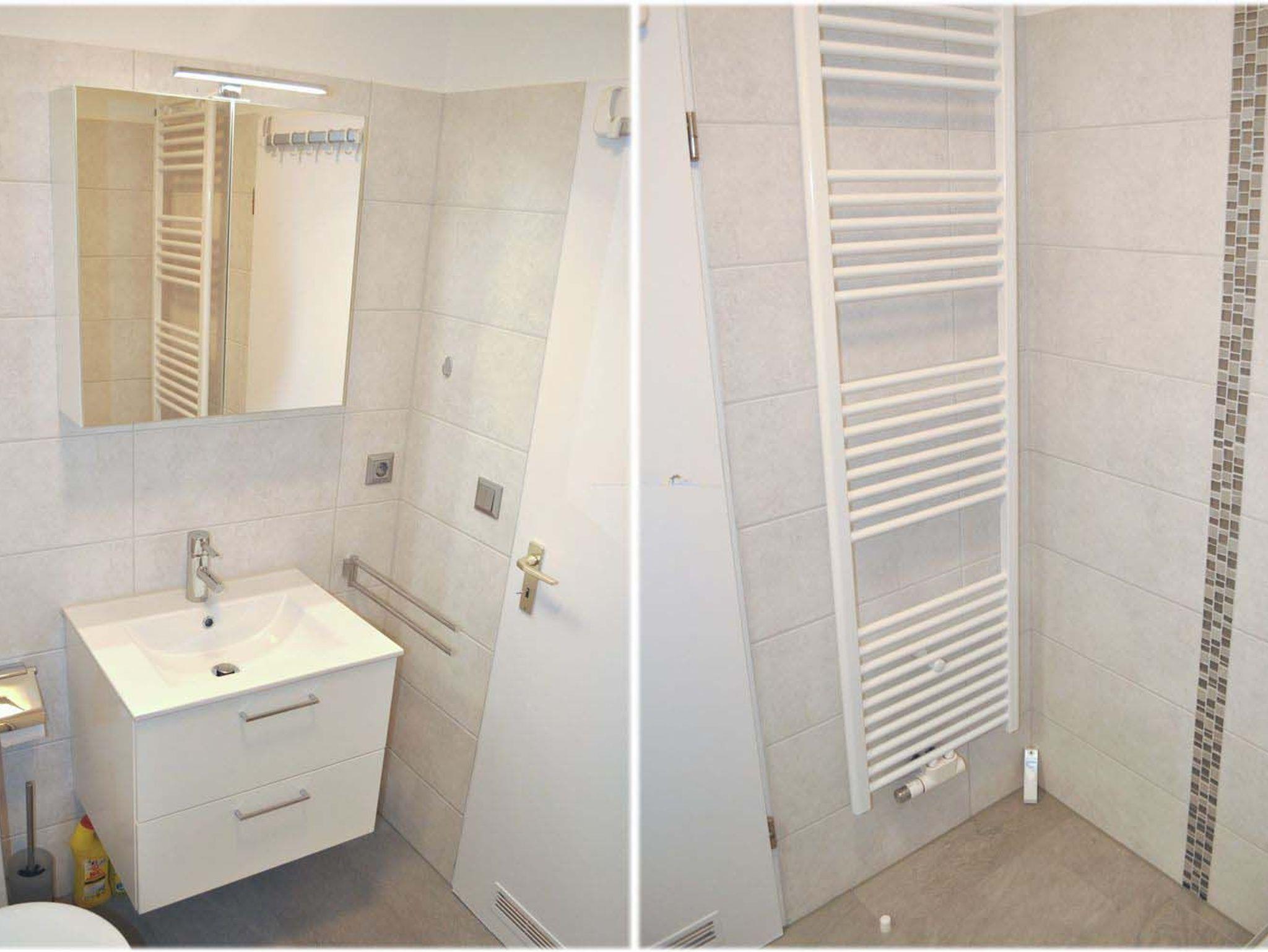 Bad 1: Dusche, Duschkabine, Spiegelschrank, Waschtisch mit Unterschrank, WC