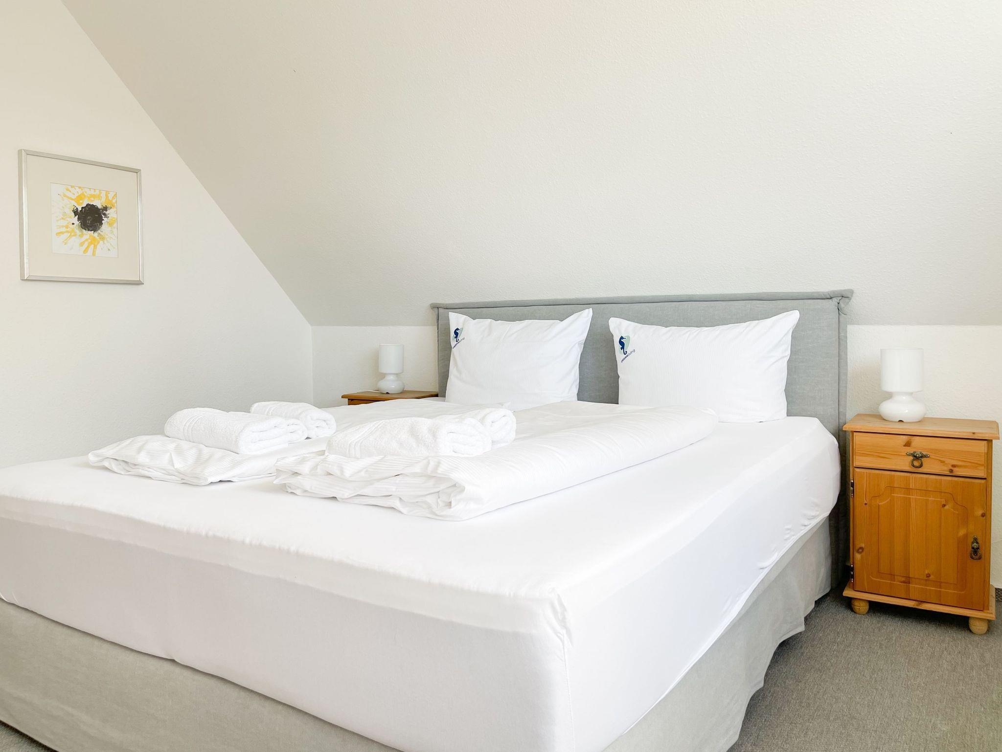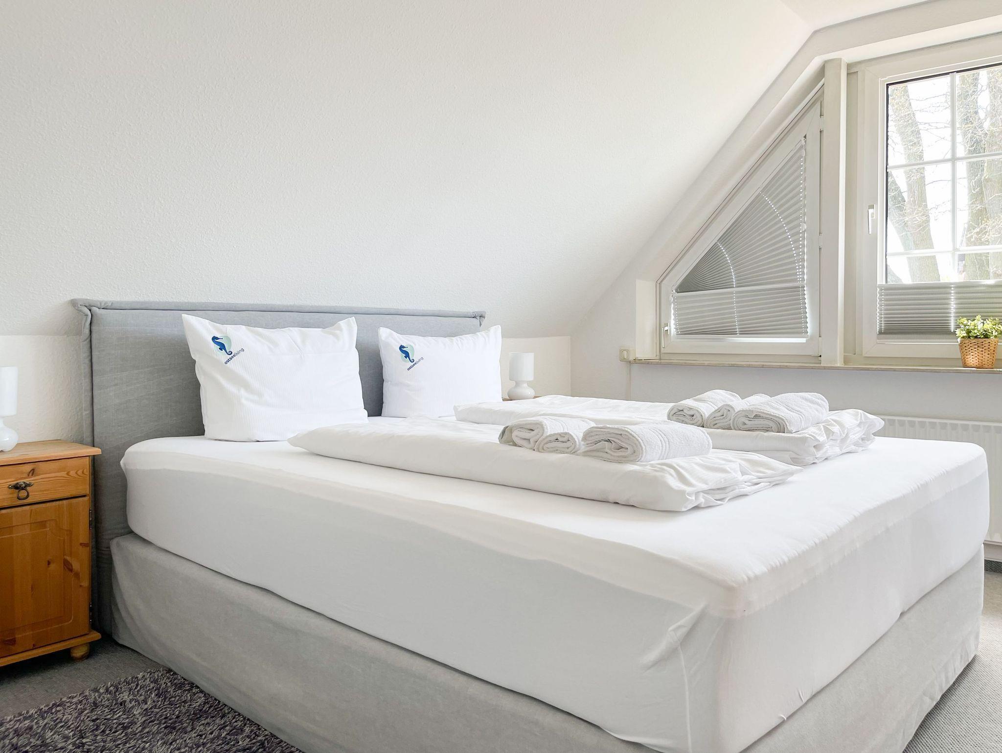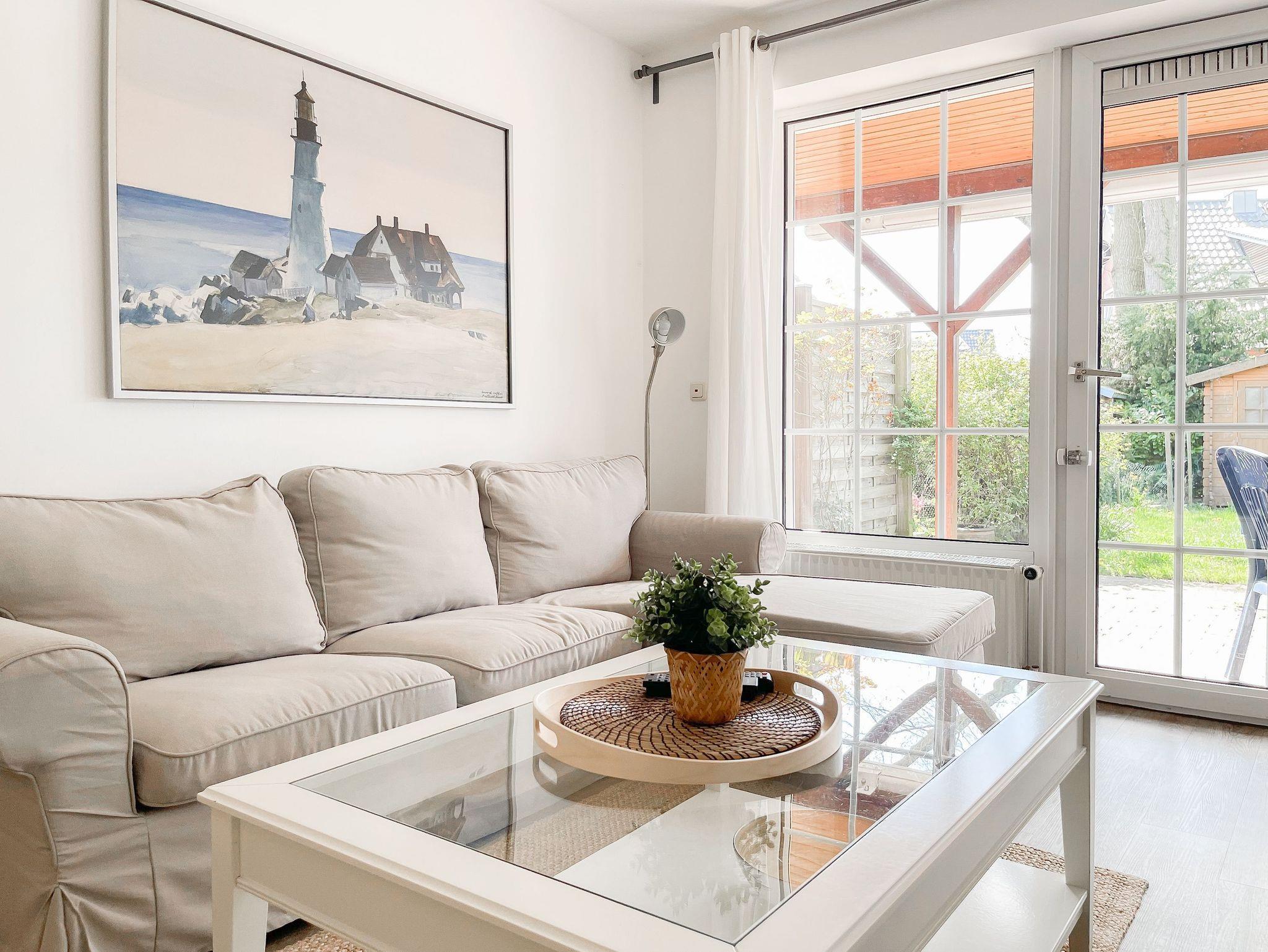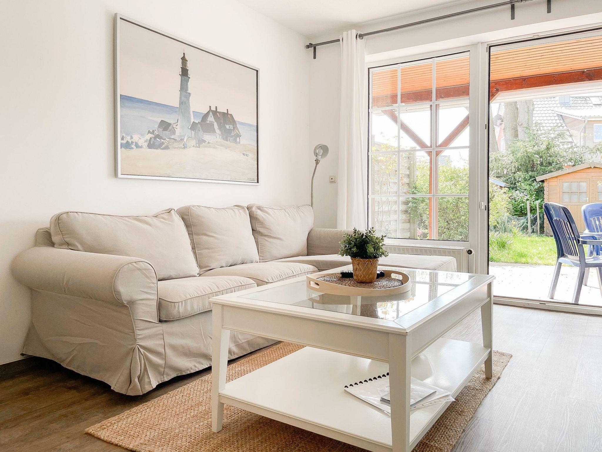 Das Ferienhaus bietet auf ca. 75 qm Wohnfläche über 2 Ebenen[nbsp] ausreichend Platz für 4 Personen (+Baby im Reisebett). Im Erdgeschoss[nbsp] befindet sich eine moderne, abgeschlossene Einbauküche mit Mikrowelle, Backofen, Kochfeld und Spülmaschine. Im hellen, freundlichen Wohnraum mit integriertem Essbereich befindet sich eine gemütliche Sitzecke und ein Kamin. TV und Radio sowie kostenloser Internetzugang über WLAN stehen zur Verfügung. Vom Wohnraum ist die großzügige, überdachte Südterrasse mit anschließendem, kleinen Garten zu betreten. Eine elektrische Markise sorgt für ausreichend Schatten. Der Außenbereich bietet einen herrlichen Rückzugsort zu jeder Tageszeit. Ein Gäste WG ist ebenfalls im EG untergebracht. Im Obergeschoss befinden sich zwei separate Schlafzimmer, die beide mit einem Boxspringbett (180x200) und Verdunkelungsplissees ausgestattet sind sowie das Duschbad. Eine Garage gehört zum Objekt.