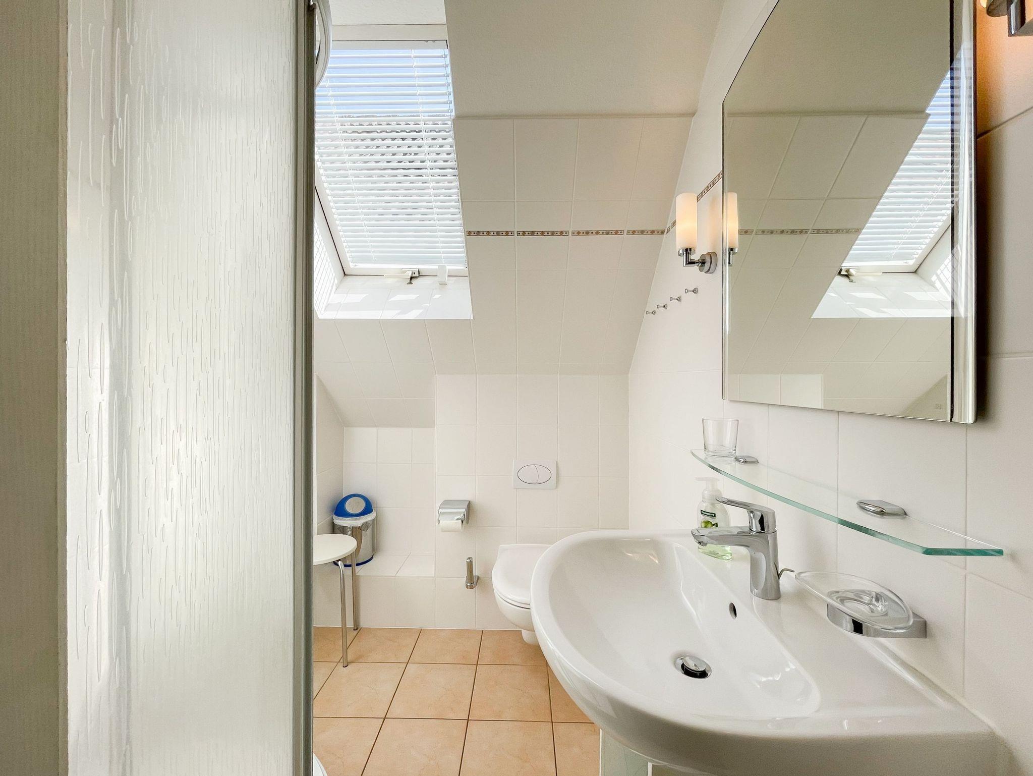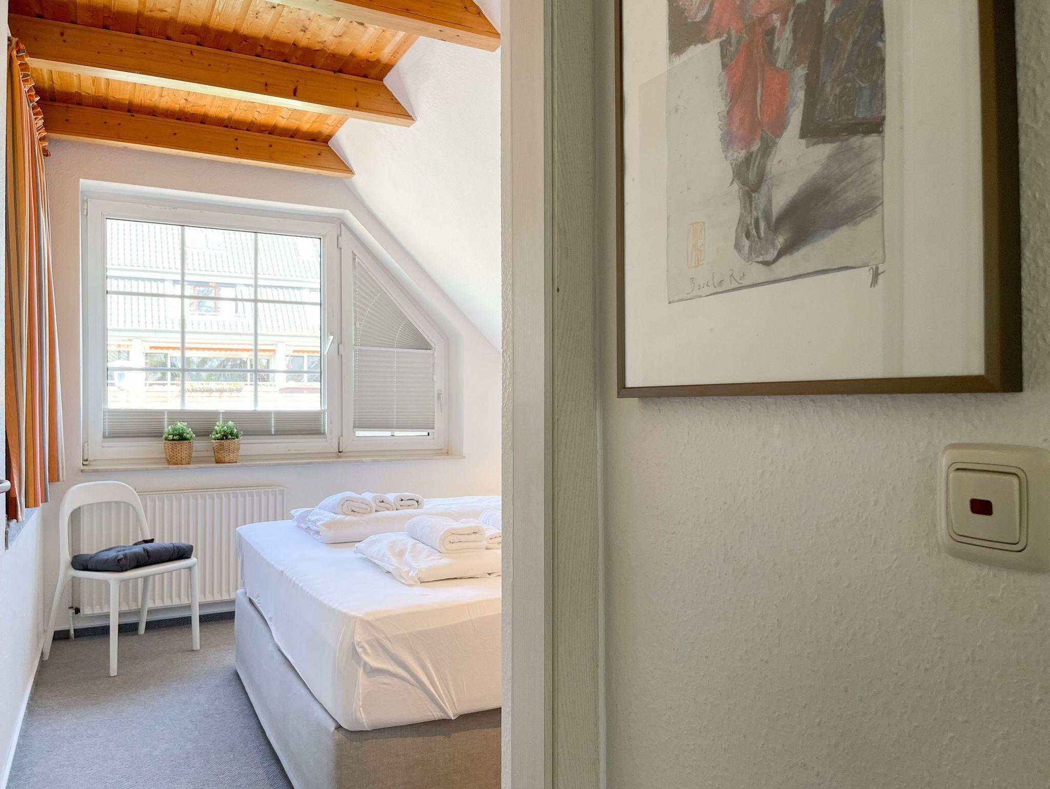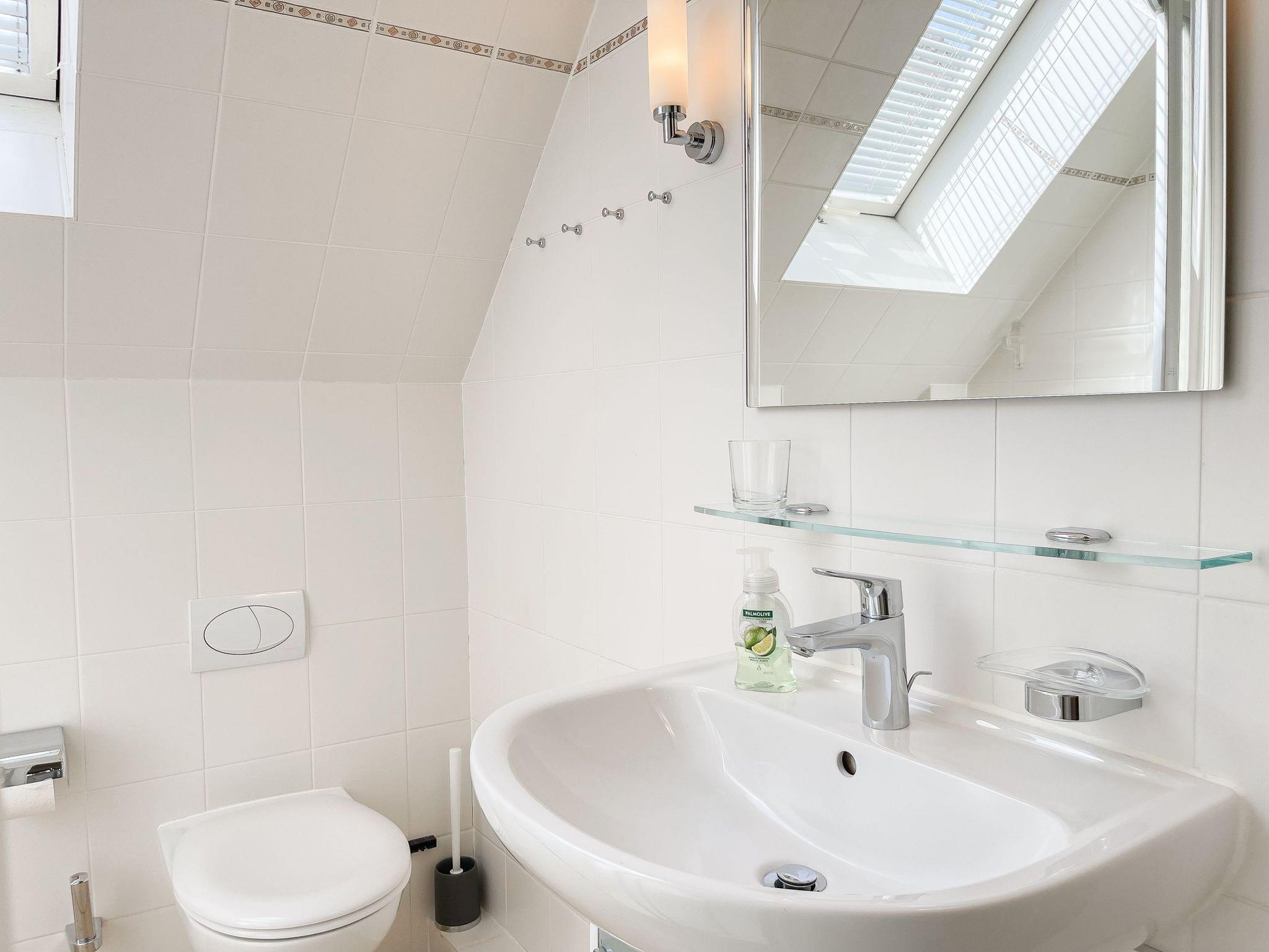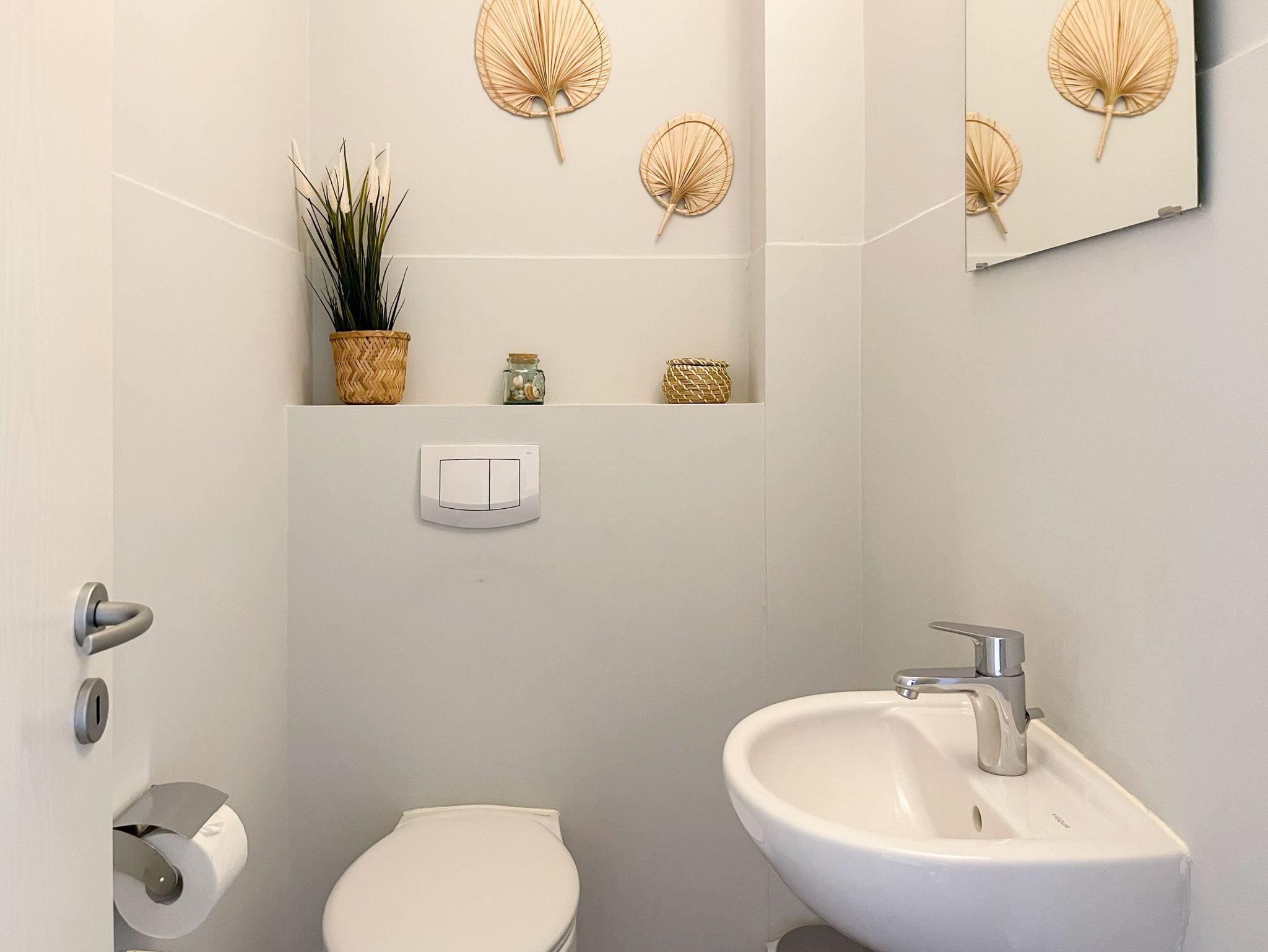 Das Ferienhaus bietet auf ca. 75 qm Wohnfläche über 2 Ebenen[nbsp] ausreichend Platz für 4 Personen (+Baby im Reisebett). Im Erdgeschoss[nbsp] befindet sich eine moderne, abgeschlossene Einbauküche mit Mikrowelle, Backofen, Kochfeld und Spülmaschine. Im hellen, freundlichen Wohnraum mit integriertem Essbereich befindet sich eine gemütliche Sitzecke und ein Kamin. TV und Radio sowie kostenloser Internetzugang über WLAN stehen zur Verfügung. Vom Wohnraum ist die großzügige, überdachte Südterrasse mit anschließendem, kleinen Garten zu betreten. Eine elektrische Markise sorgt für ausreichend Schatten. Der Außenbereich bietet einen herrlichen Rückzugsort zu jeder Tageszeit. Ein Gäste WG ist ebenfalls im EG untergebracht. Im Obergeschoss befinden sich zwei separate Schlafzimmer, die beide mit einem Boxspringbett (180x200) und Verdunkelungsplissees ausgestattet sind sowie das Duschbad. Eine Garage gehört zum Objekt.
