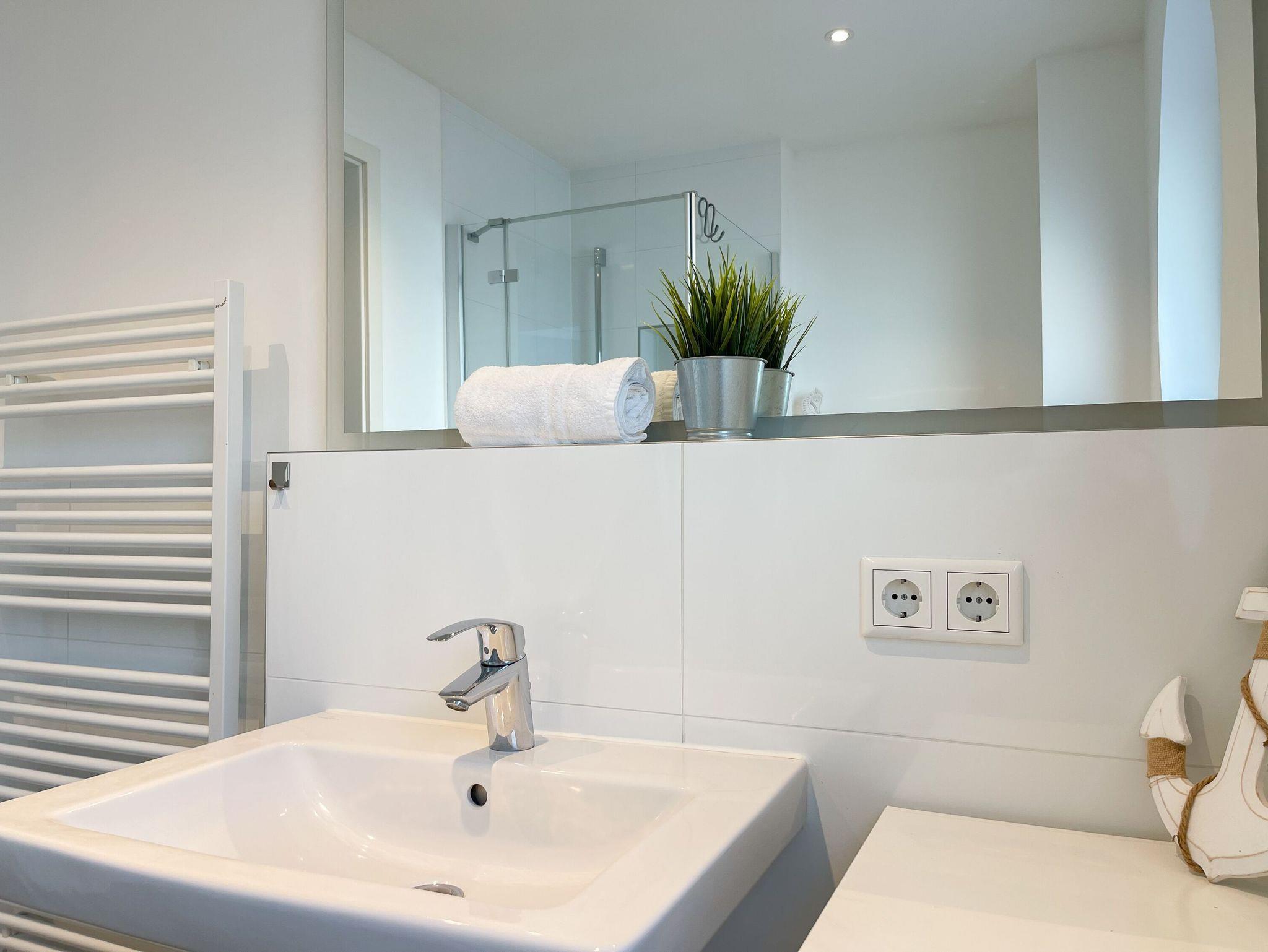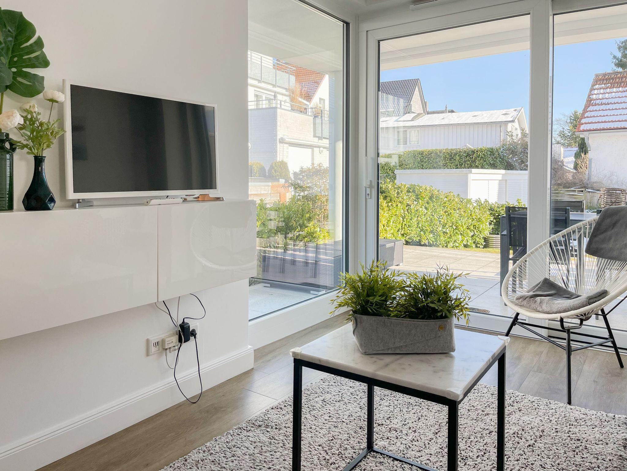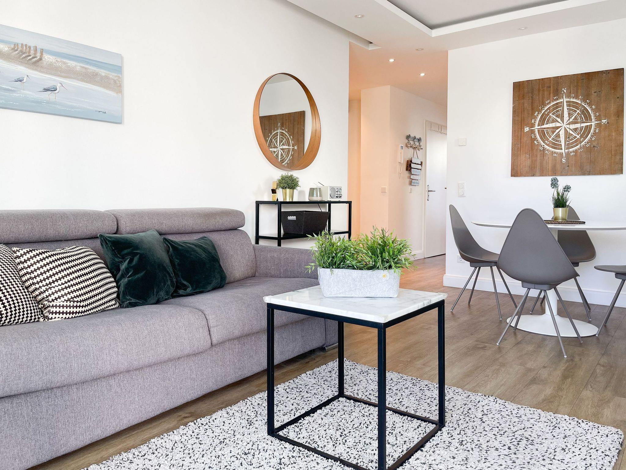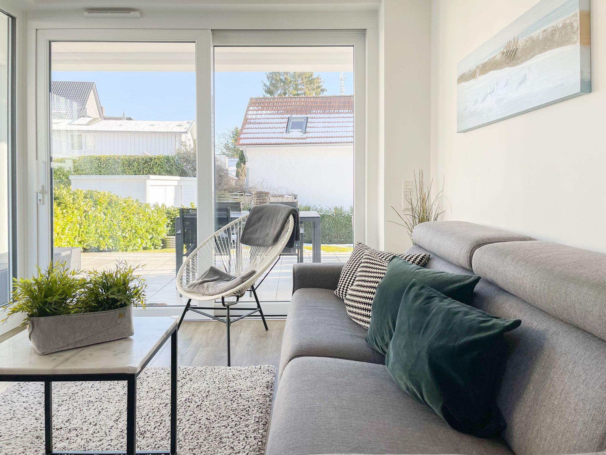 Bodentiefe Fensterelemente in der gesamten Eckwohnung, alle mit elektrischen Außenjalousien versehen, sorgen für lichtdurchflutete Räumlichkeiten. Hochwertige Bodenbeläge, die moderne, bestens ausgestattete Einbauküche und die geschmackvolle Einrichtung schaffen ein zeitgemäßes, schönes Wohnambiente. Die teilweise überdachte Sonnenterrasse ist großzügig um den gesamten Wohnbereich herum angelegt. Ausgestattet mit Gartenmöbeln und Sonnenliege ein idealer Rückzugsort zu jeder Tageszeit. Der Wohnbereich mit Terrassenzugang ist mit einem Schlafsofa (160x200), TV und WLAN ausgestattet, der integrierte Essbereich ist für 4 Personen ausgelegt. Das Schlafzimmer verfügt über ein Boxspringbett (180x200) und TV. Das hochwertige, helle Bad ist großzügig angelegt.