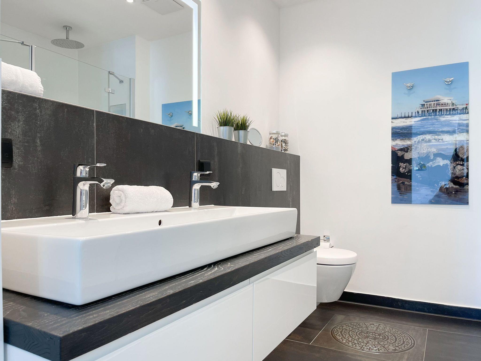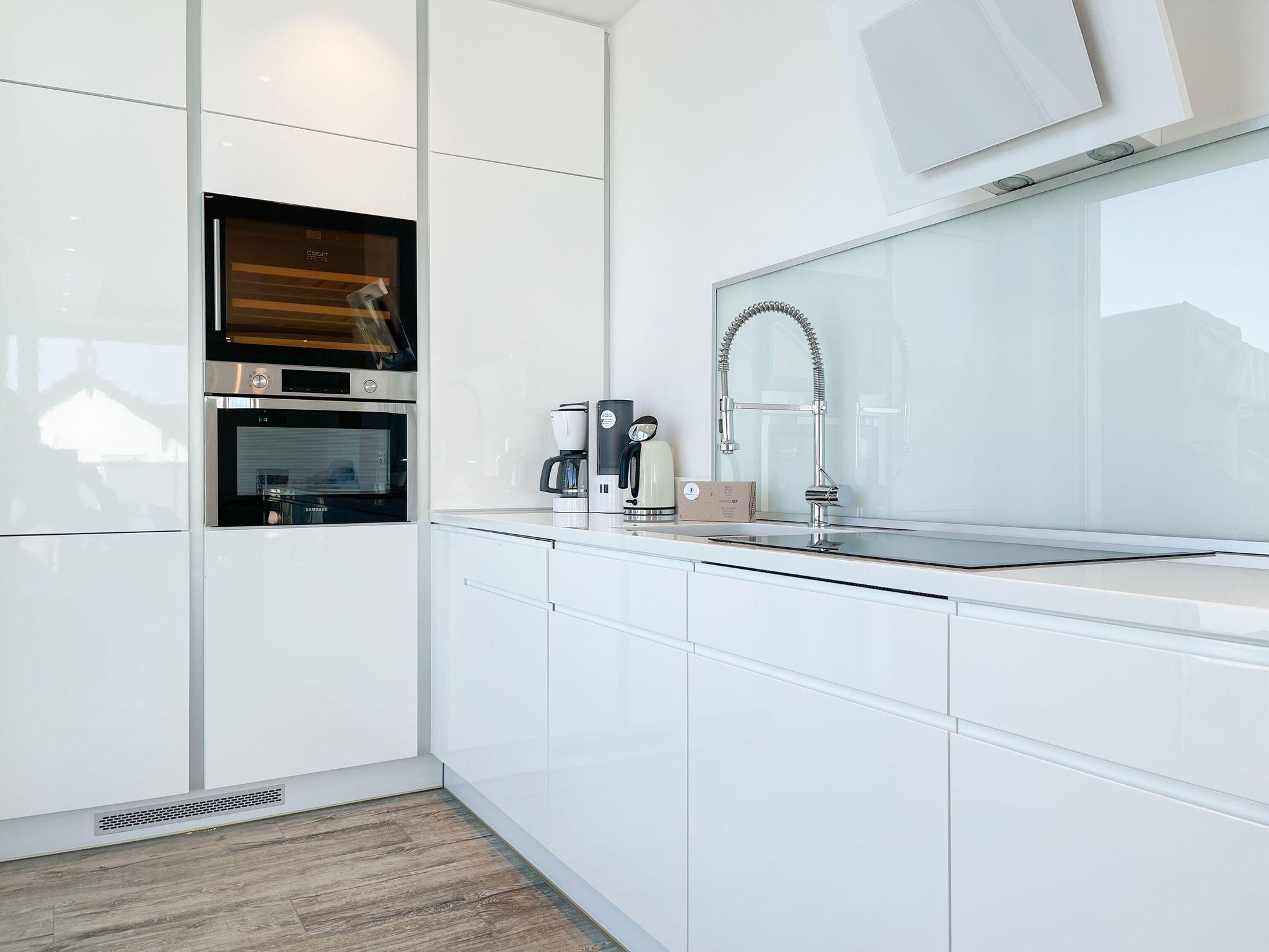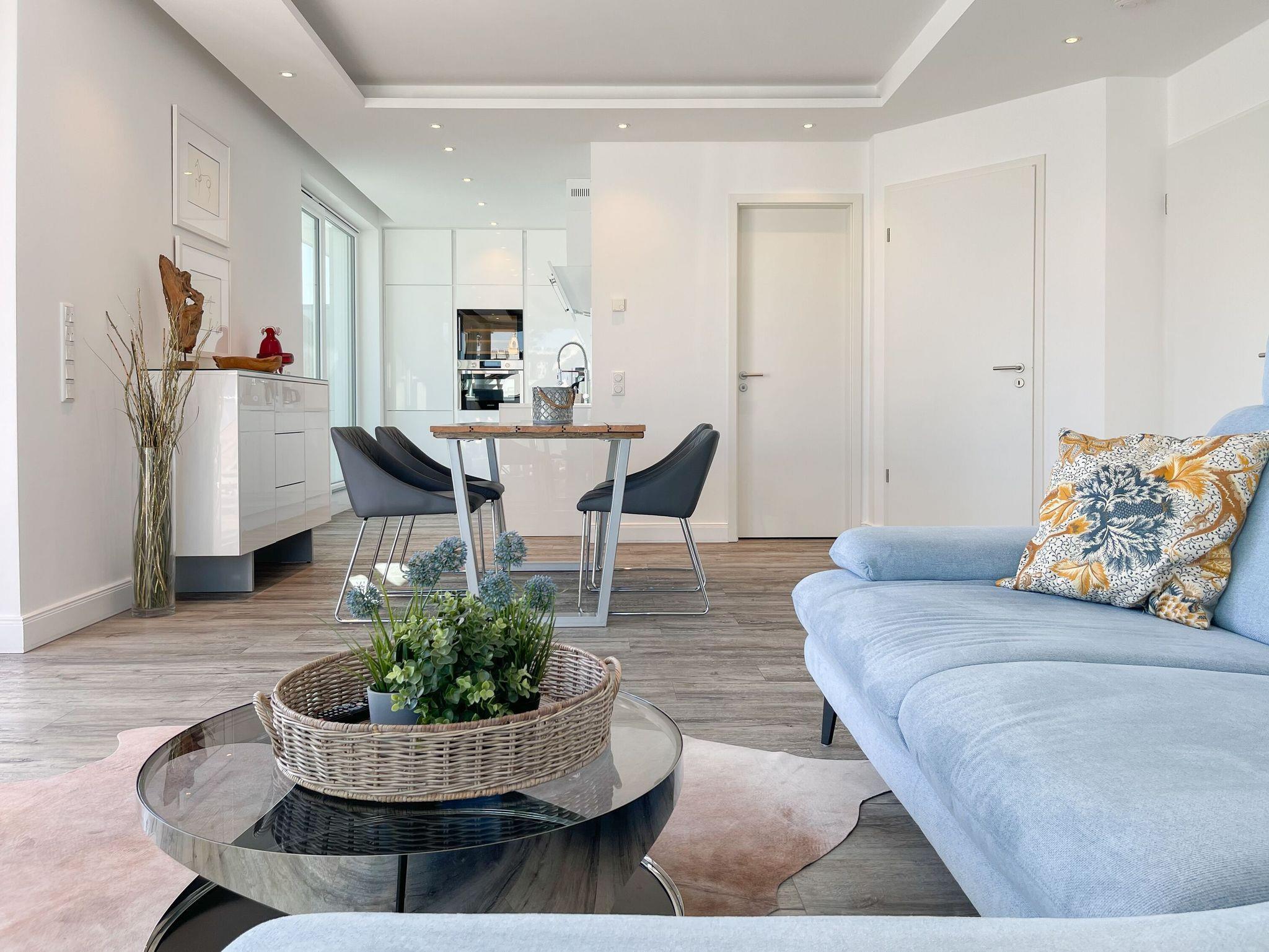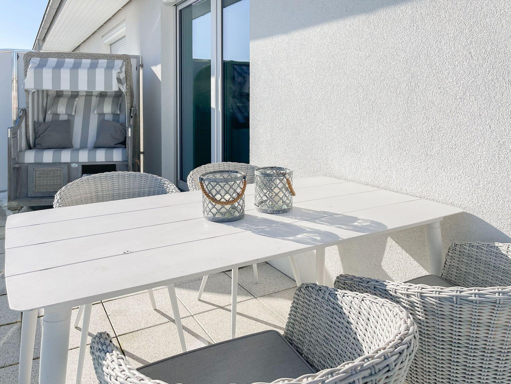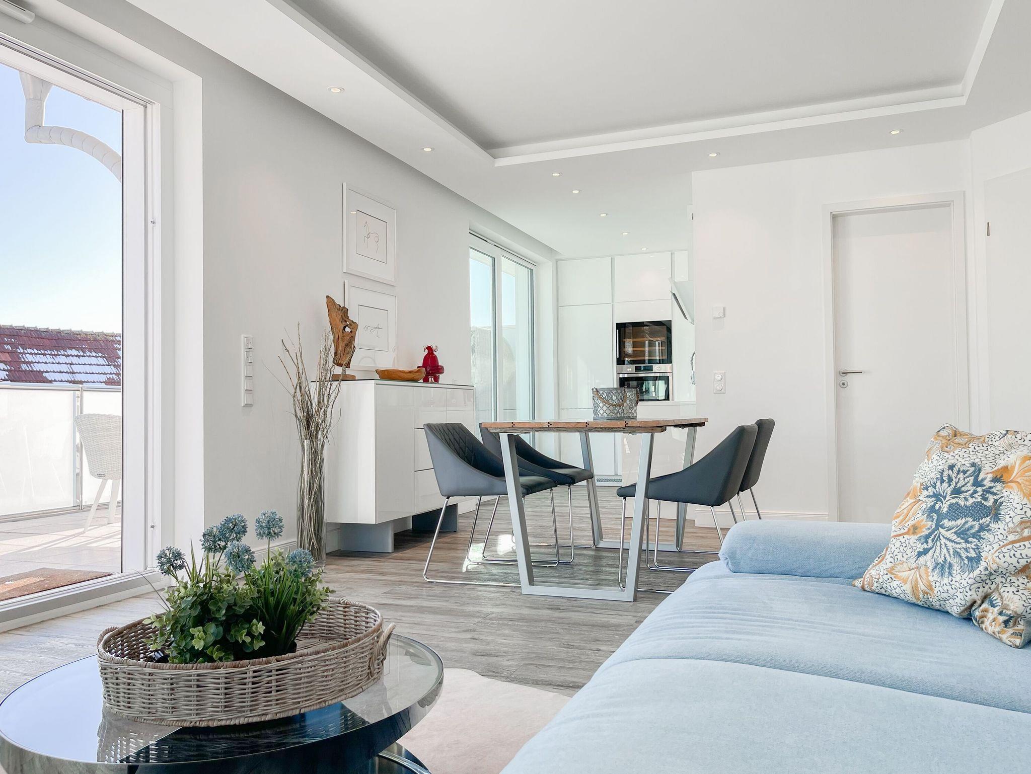 Das Penthouse bietet zwei separate Schlafzimmer mit vorgelagerten Dachterrassen, als private Rückzugsorte. Sie verfügen über Boxspringbetten (160x200),[nbsp] Einbauschränke und TV. Der großzügige Wohn- Essbereich präsentiert sich stilvoll und modern. Das Sofa ist mit einer Schlaffunktion (160x200) ausgestattet. Viel Licht und zeitgemäßer Luxus schaffen eine Atmosphäre zum Wohlfühlen. Die hochwertige Küche genügt höchsten Ansprüchen und verfügt neben allen technischen Geräten auch über einen eingebauten Weinkühlschrank. Das Designbad ist mit einem Doppelwaschbecken und einem großzügigen Duschbereich mit Rainshower und Handbrause ausgestattet. Im Einbauschrank ist eine Waschmaschine untergebracht. Ein weiteres Gäste WC steht ebenfalls zur Verfügung.