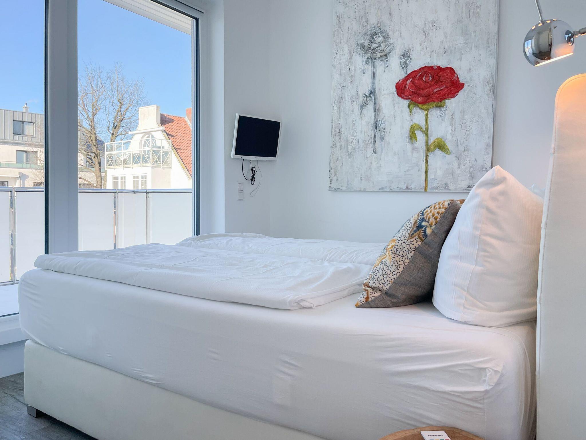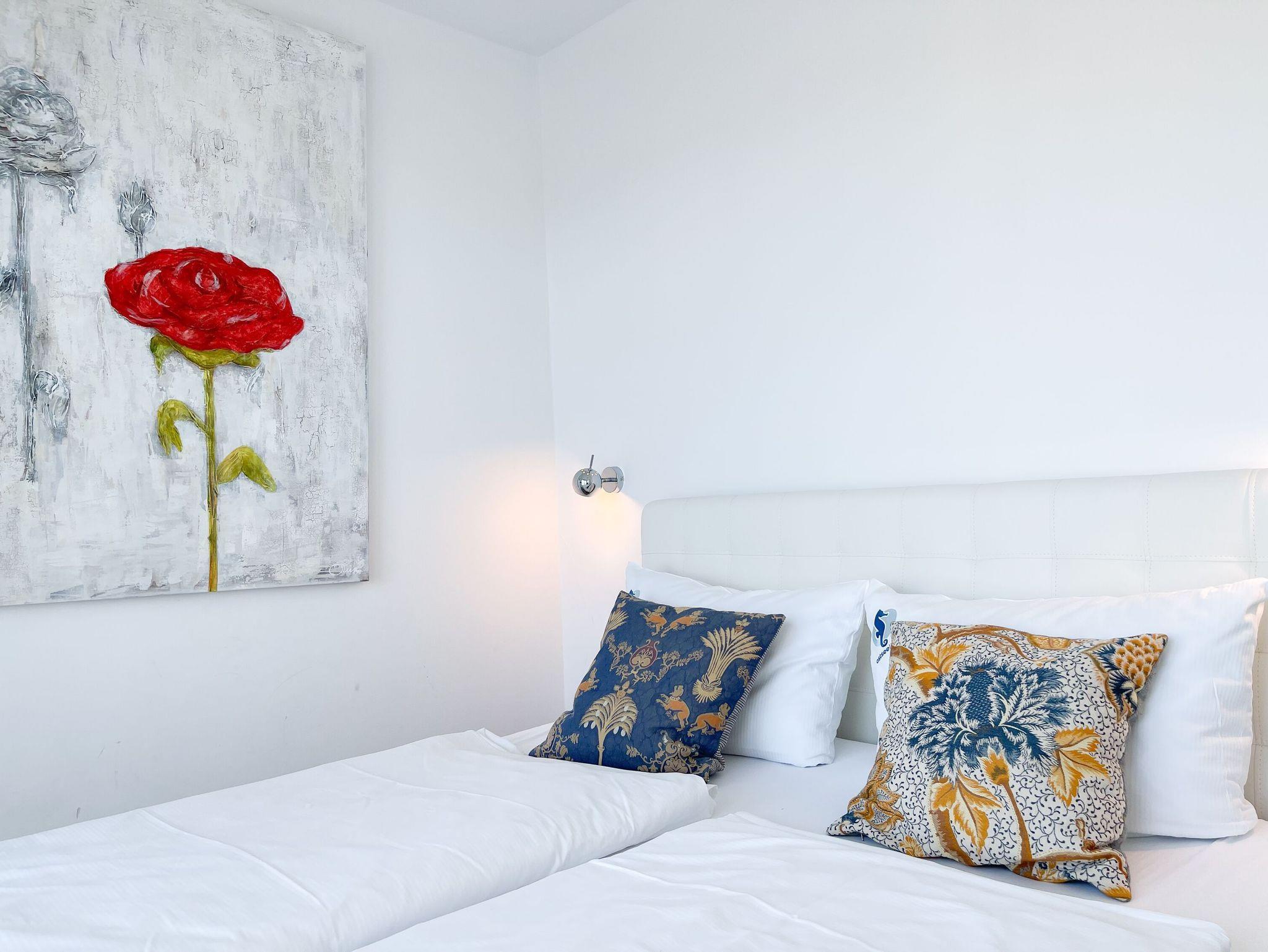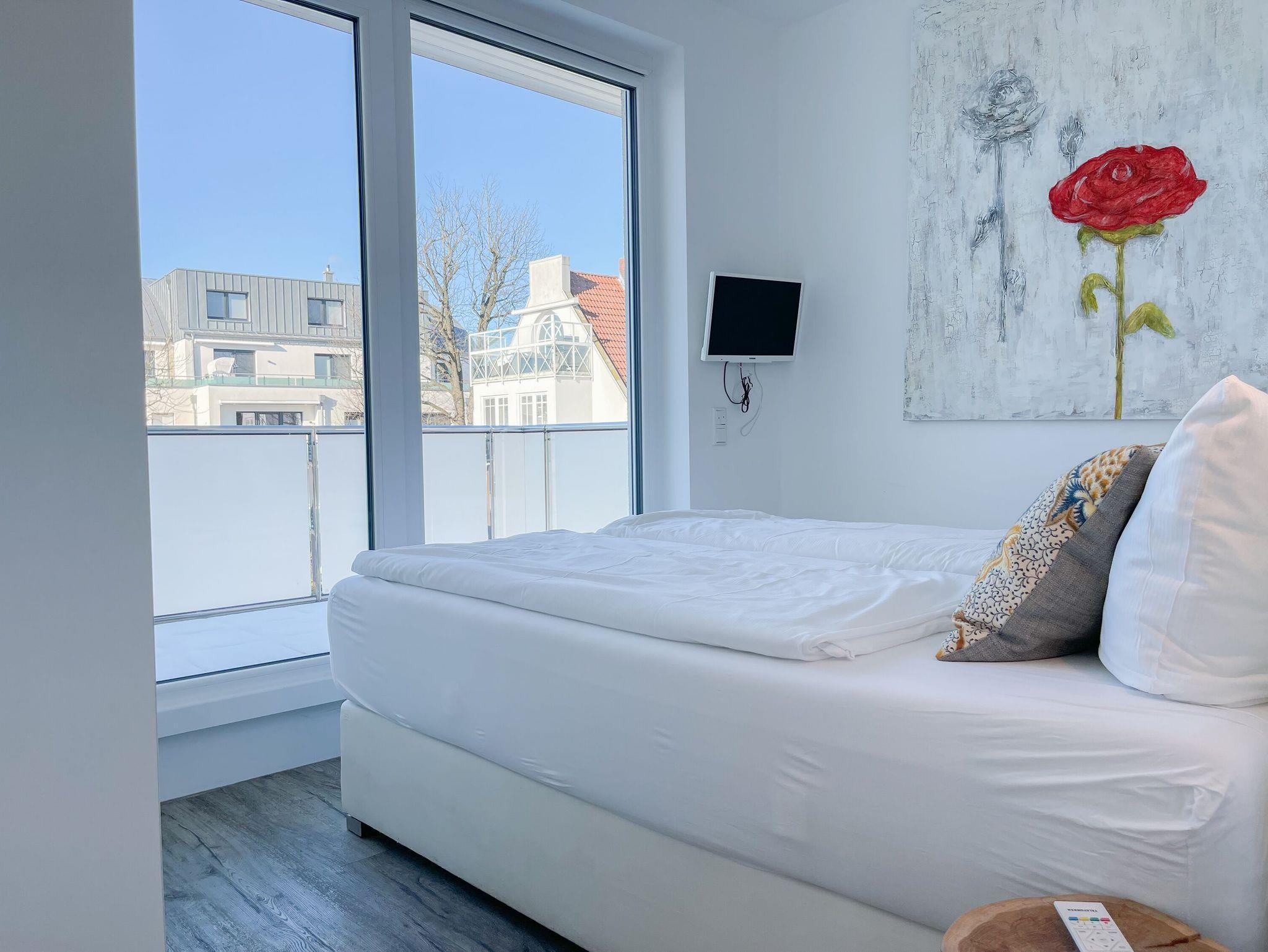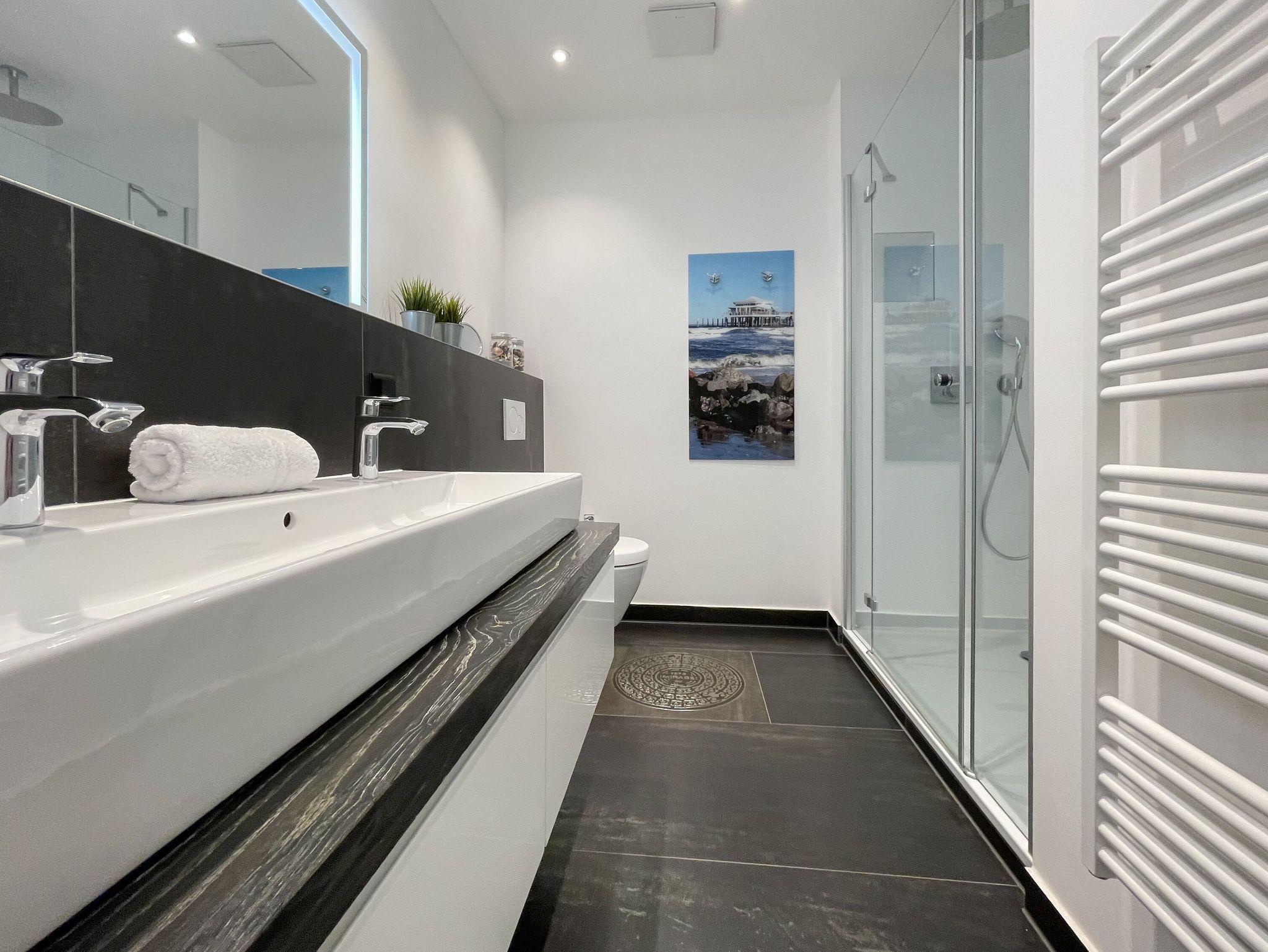Das Penthouse bietet zwei separate Schlafzimmer mit vorgelagerten Dachterrassen, als private Rückzugsorte. Sie verfügen über Boxspringbetten (160x200),[nbsp] Einbauschränke und TV. Der großzügige Wohn- Essbereich präsentiert sich stilvoll und modern. Das Sofa ist mit einer Schlaffunktion (160x200) ausgestattet. Viel Licht und zeitgemäßer Luxus schaffen eine Atmosphäre zum Wohlfühlen. Die hochwertige Küche genügt höchsten Ansprüchen und verfügt neben allen technischen Geräten auch über einen eingebauten Weinkühlschrank. Das Designbad ist mit einem Doppelwaschbecken und einem großzügigen Duschbereich mit Rainshower und Handbrause ausgestattet. Im Einbauschrank ist eine Waschmaschine untergebracht. Ein weiteres Gäste WC steht ebenfalls zur Verfügung.