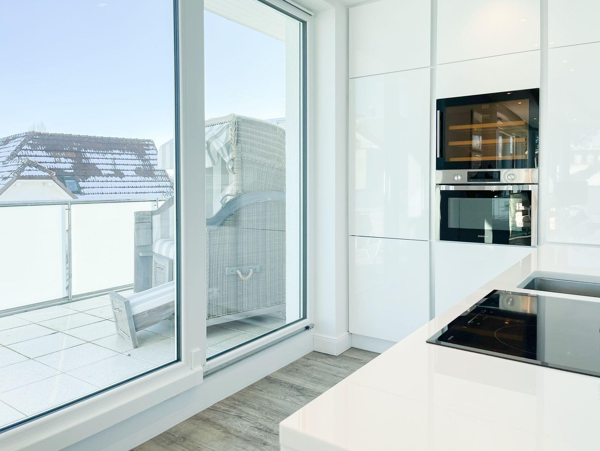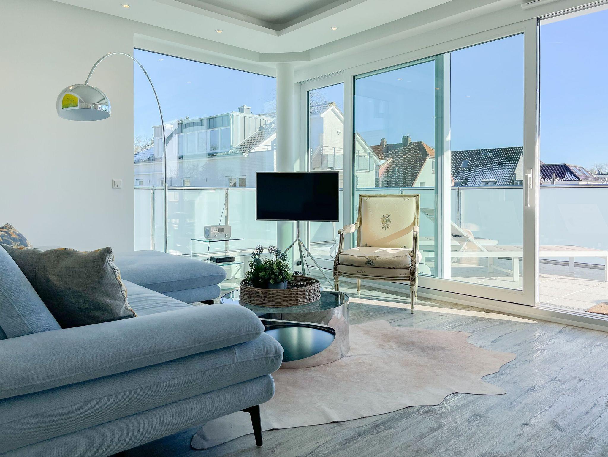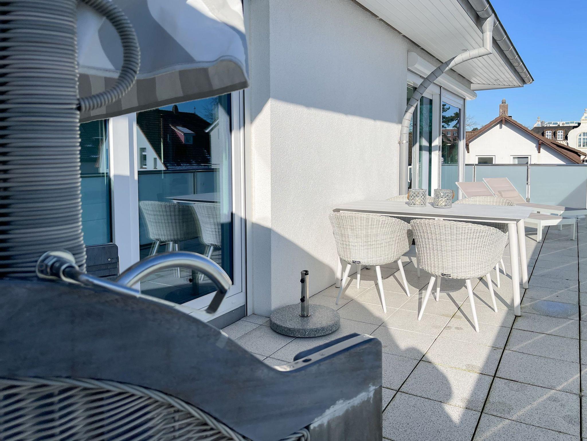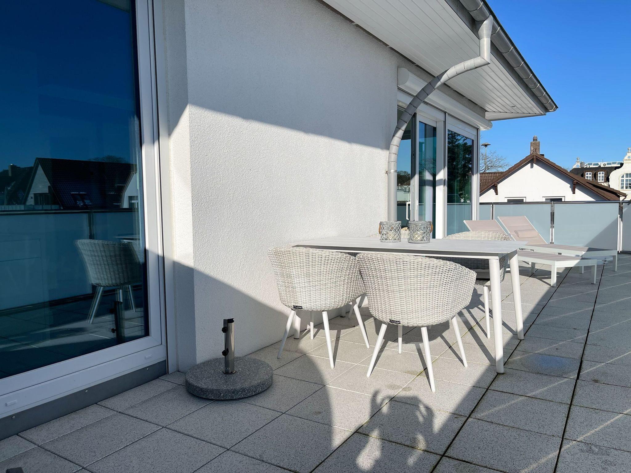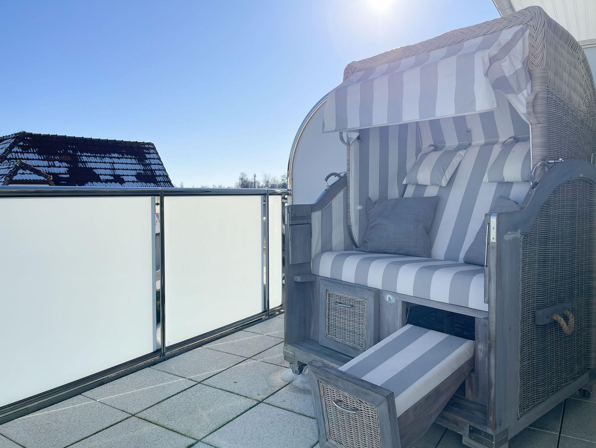 Riesige Fensterflächen und die 50 qm große Dachterrasse in Südausrichtung, die mit hochwertigen Gartenmöbeln, Sonnenliegen und Strandkorb ausgestattet ist, machen dieses Objekt zu etwas ganz Besonderem. Die bodentiefen Fensterelemente, alle mit elektrischen Außenjalousien versehen, sorgen für sonnige, helle Räumlichkeiten und die Fußbodenheizung für ein angenehmes Raumklima.