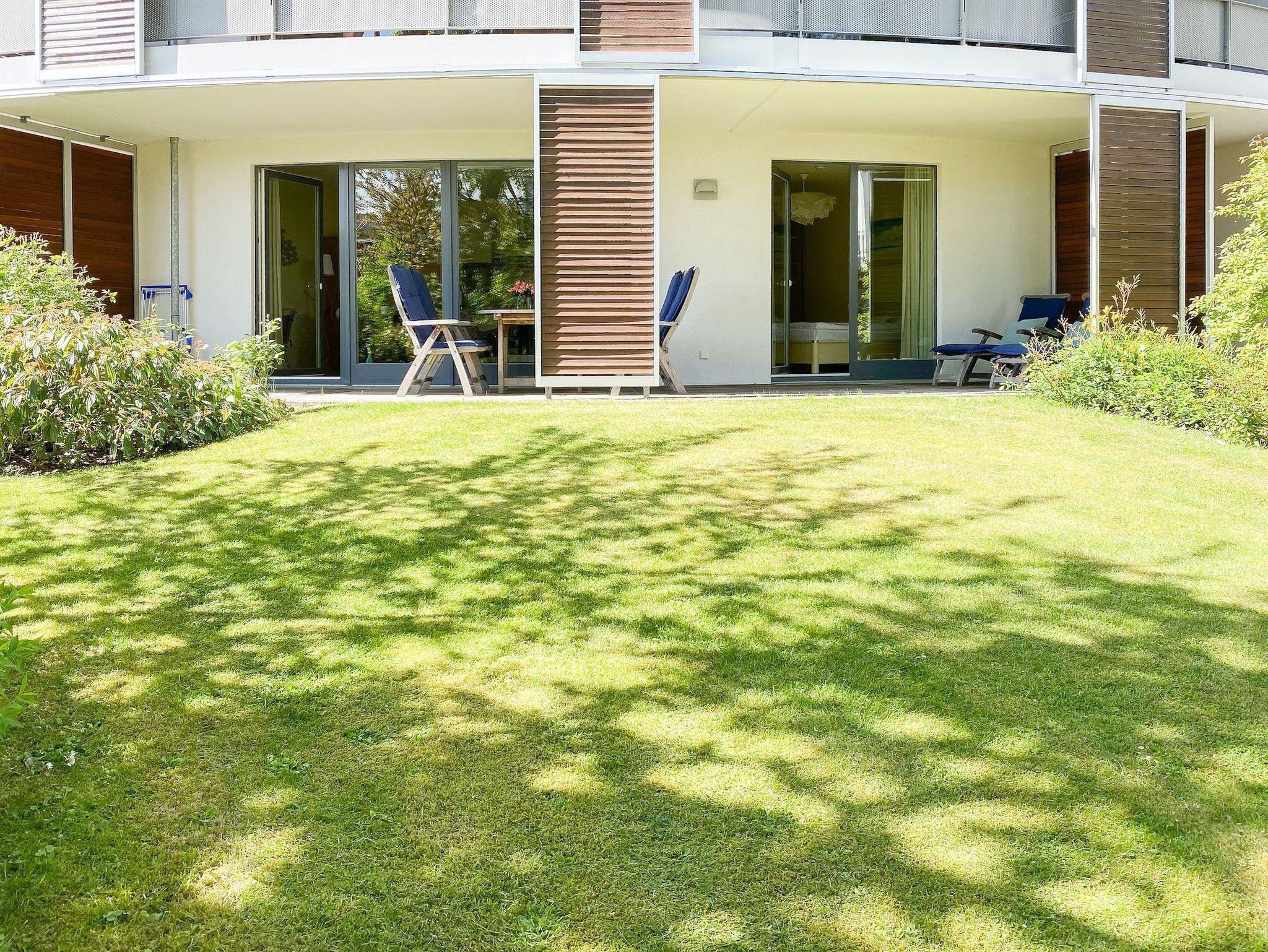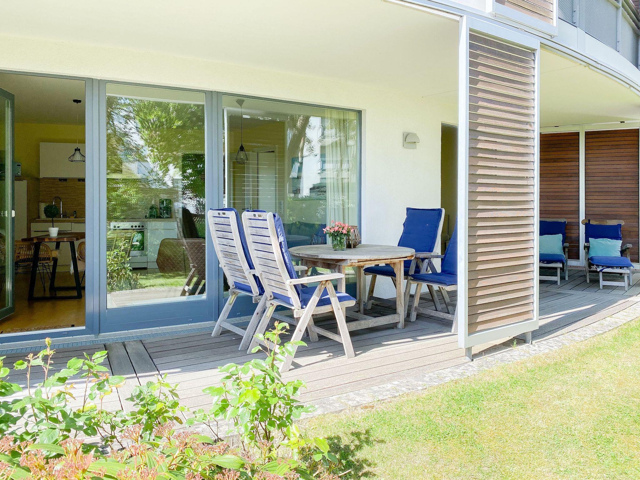 Bodentiefe Fensterflächen sorgen für helle Räumlichkeiten und die geschmackvolle Einrichtung in warmen Farben schafft eine angenehme Wohnatmosphäre. Die überdachte XXL Sonnenterrasse, die sich über die gesamte Breite der Wohnung erstreckt und mit hochwertigen Gartenmöbeln sowie Sonnenliegen ausgestattet ist,[nbsp][nbsp]macht diese Wohnung zu etwas Besonderem. Die angrenzende Rasenfläche kann ebenfalls genutzt werden. Im Wohnbereich erwartet Sie ein hochwertiges Sofa mit Schlaffunktion, TV, Radio und WLAN sowie ein Schreibtisch zur Erledigung wichtiger Korrespondenz. Der integrierte Essbereich ist für 3 Personen eingerichtet und die offene Einbauküche ist mit Backofen, Mikrowelle und Geschirrspüler bestens ausgestattet.[nbsp] Das Schlafzimmer verfügt über ein Doppelbett (180x200), einen geräumigen Schrank und TV.[nbsp] Alle Fenster sind mit Verdunkelungsvorhängen versehen. Das moderne Duschbad ist großzügig angelegt.