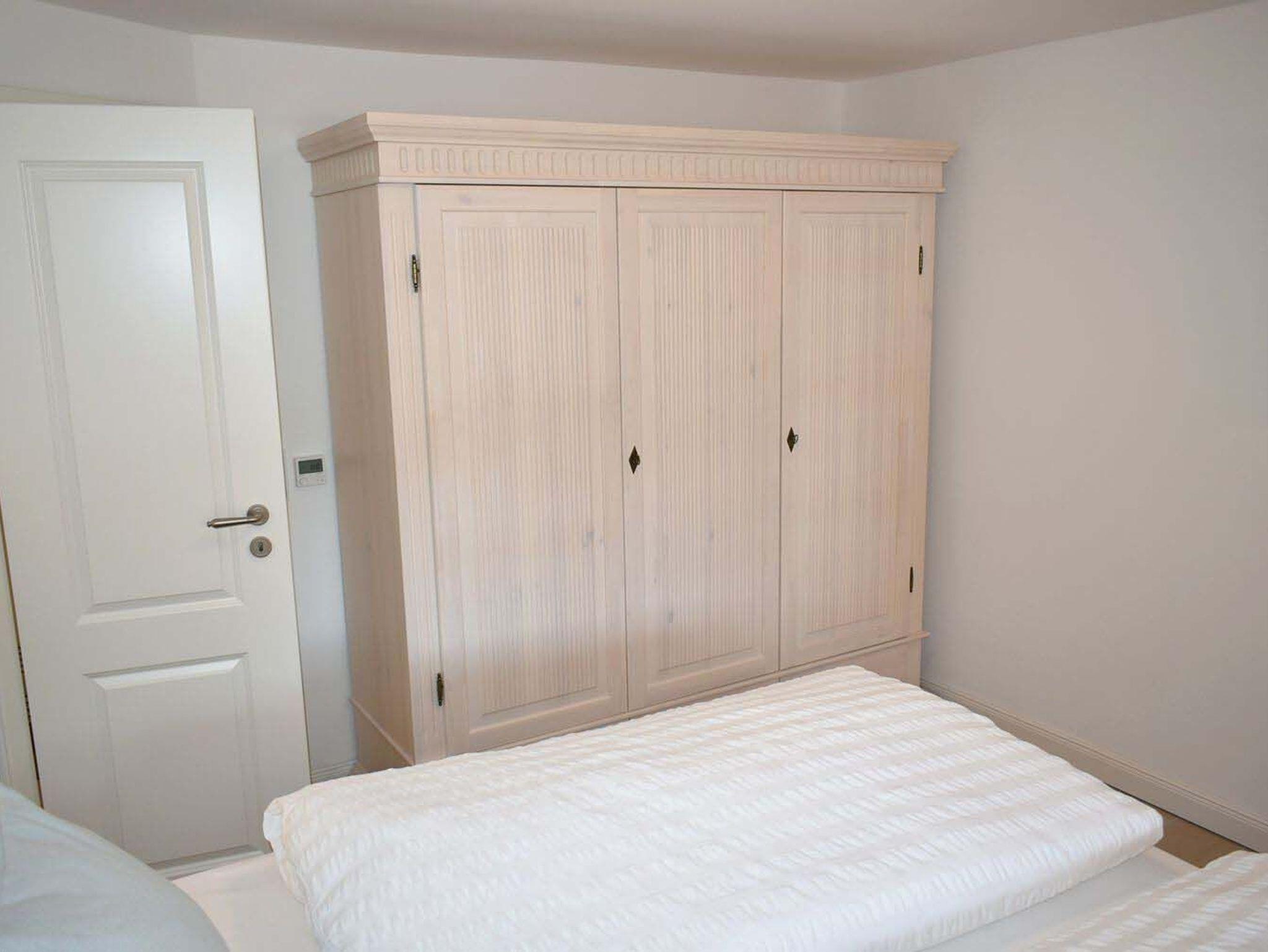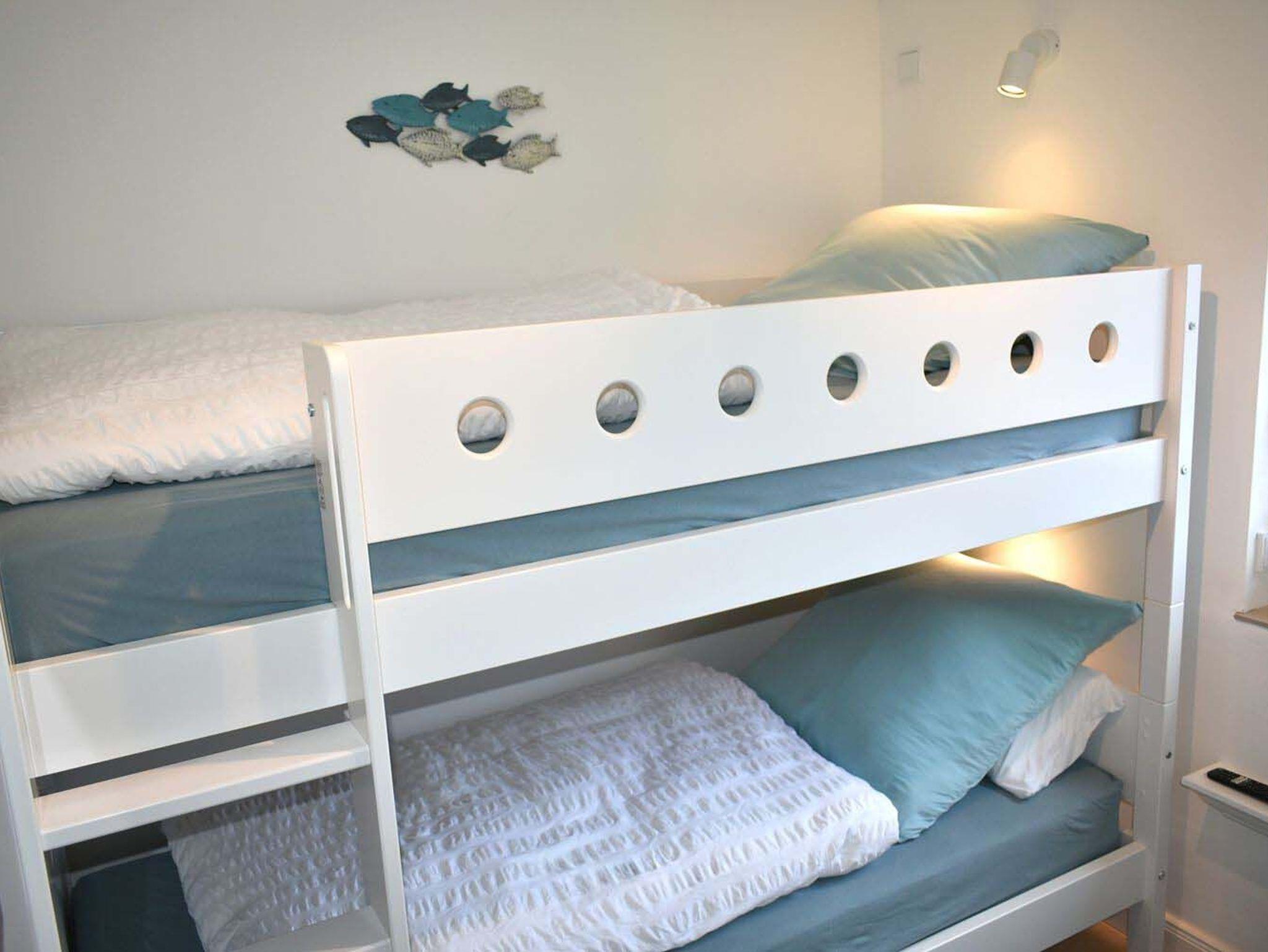 Schlafzimmer 2: 2x Kopfkissen á 0,80 x 0,80 und 2x á 0,80 x 0,40, Etagenbett 2,00 x 0,90 m, Flachbildschirm, Hocker, Kleiderschrank, Sat-TV, Verdunklungsplissee