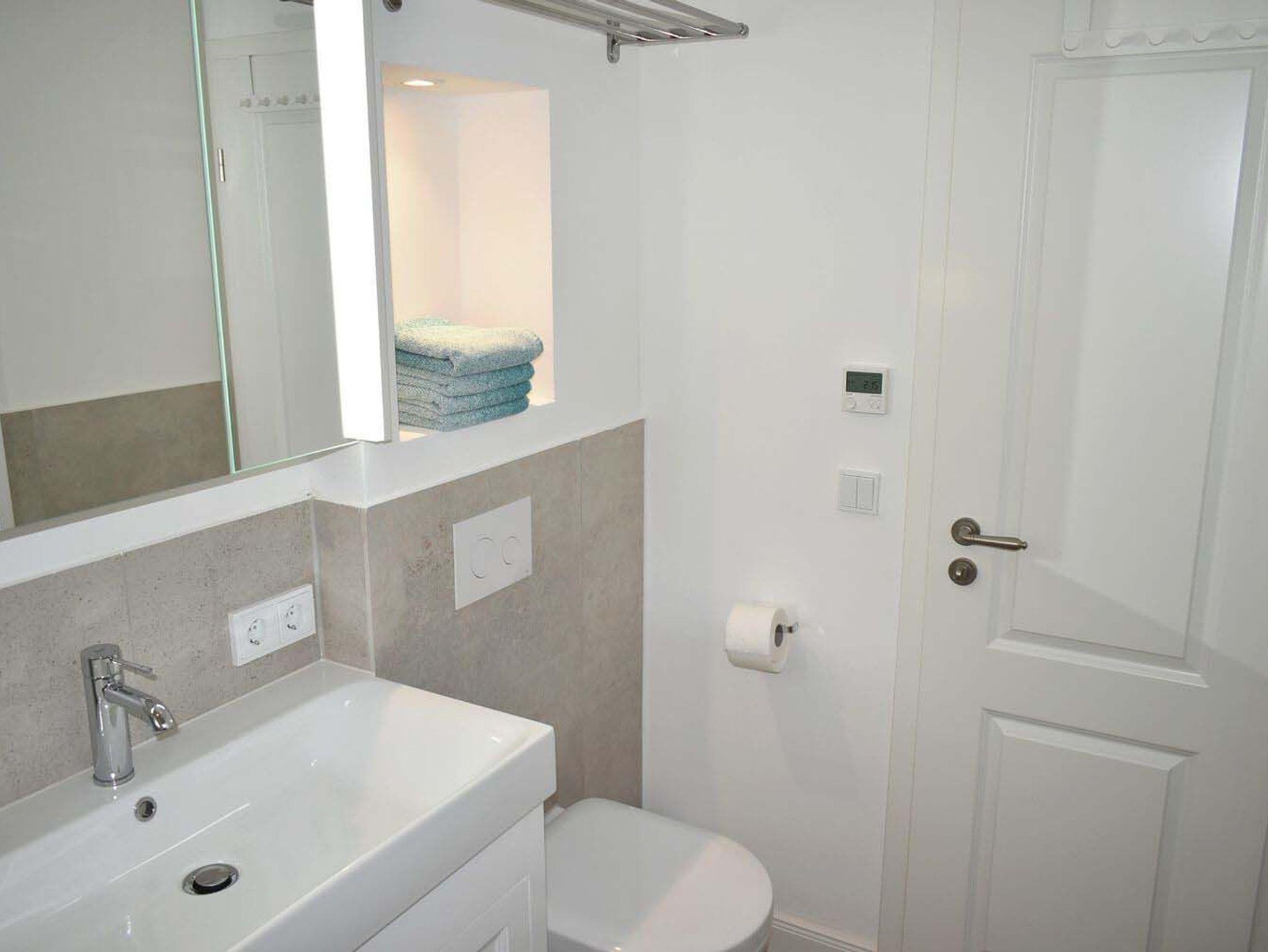 Bad 1: Duschwand, Fön, Regendusche, Spiegelschrank, Waschtisch mit Unterschrank, WC
