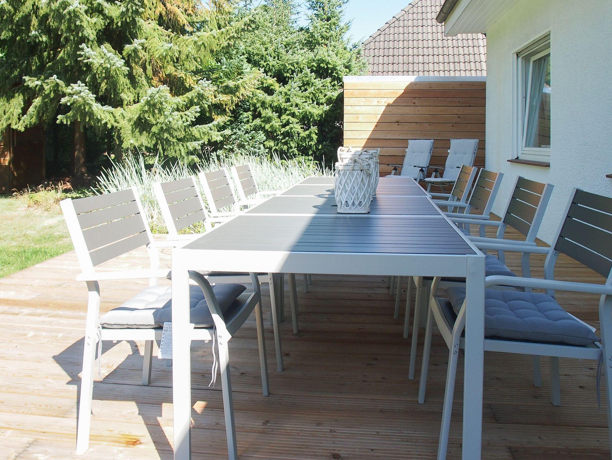 Die 30 qm große Sonnenterrasse ist mit einer Sitzgruppe für 8 Personen ausgestattet. Markise und Sonnenliegen sind selbstverständlich vorhanden. Das Gartengrundstück ist eingezäunt. Waschmaschine und Trockner sind im Keller untergebracht. Es steht ein PKW Stellplatz auf dem Grundstück zur Verfügung.