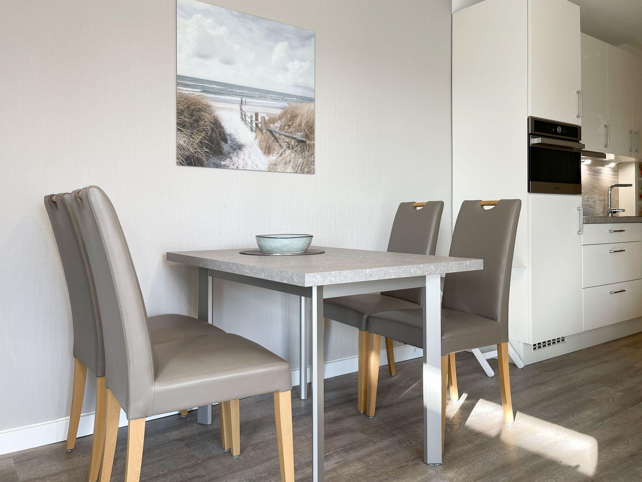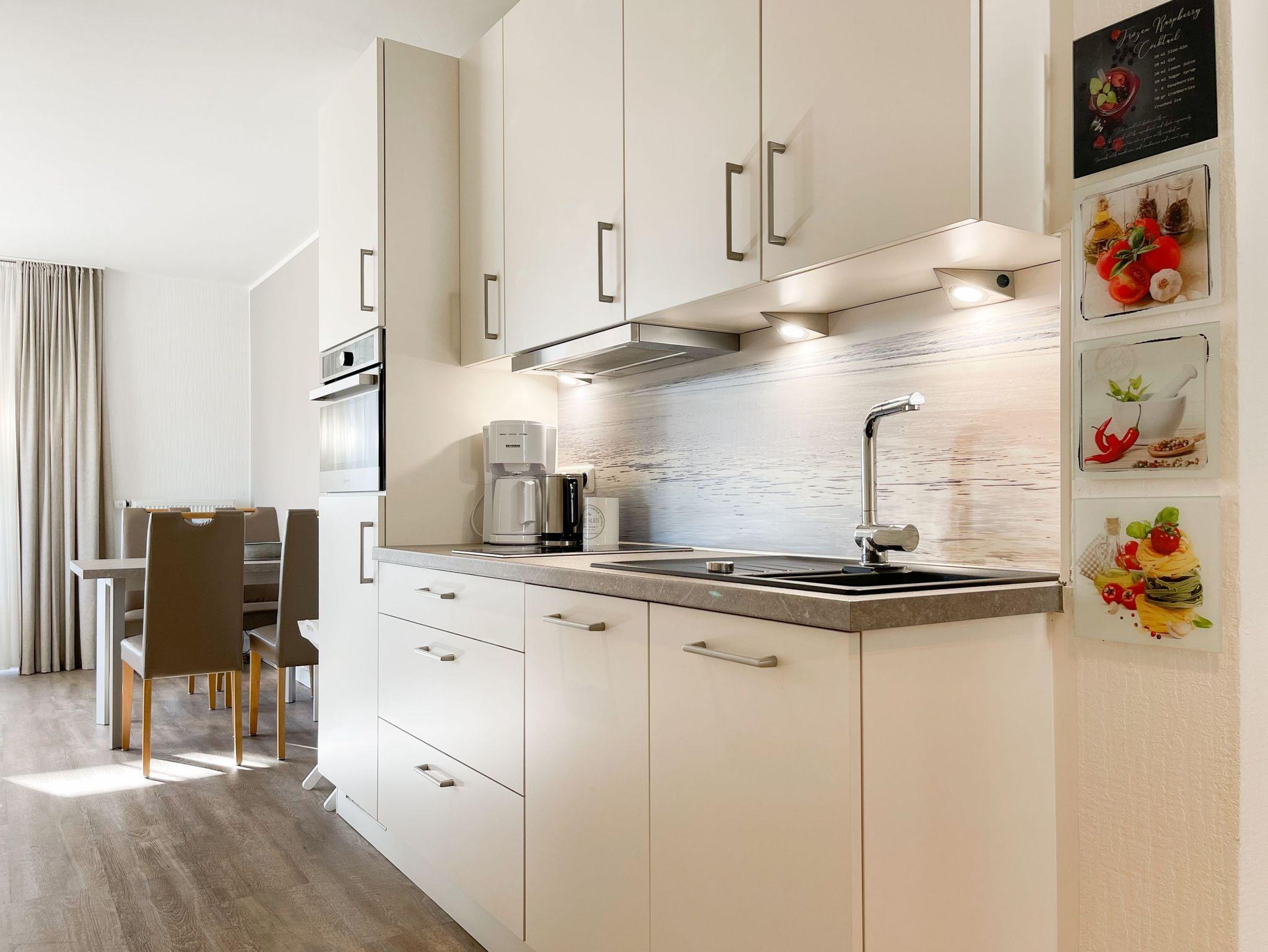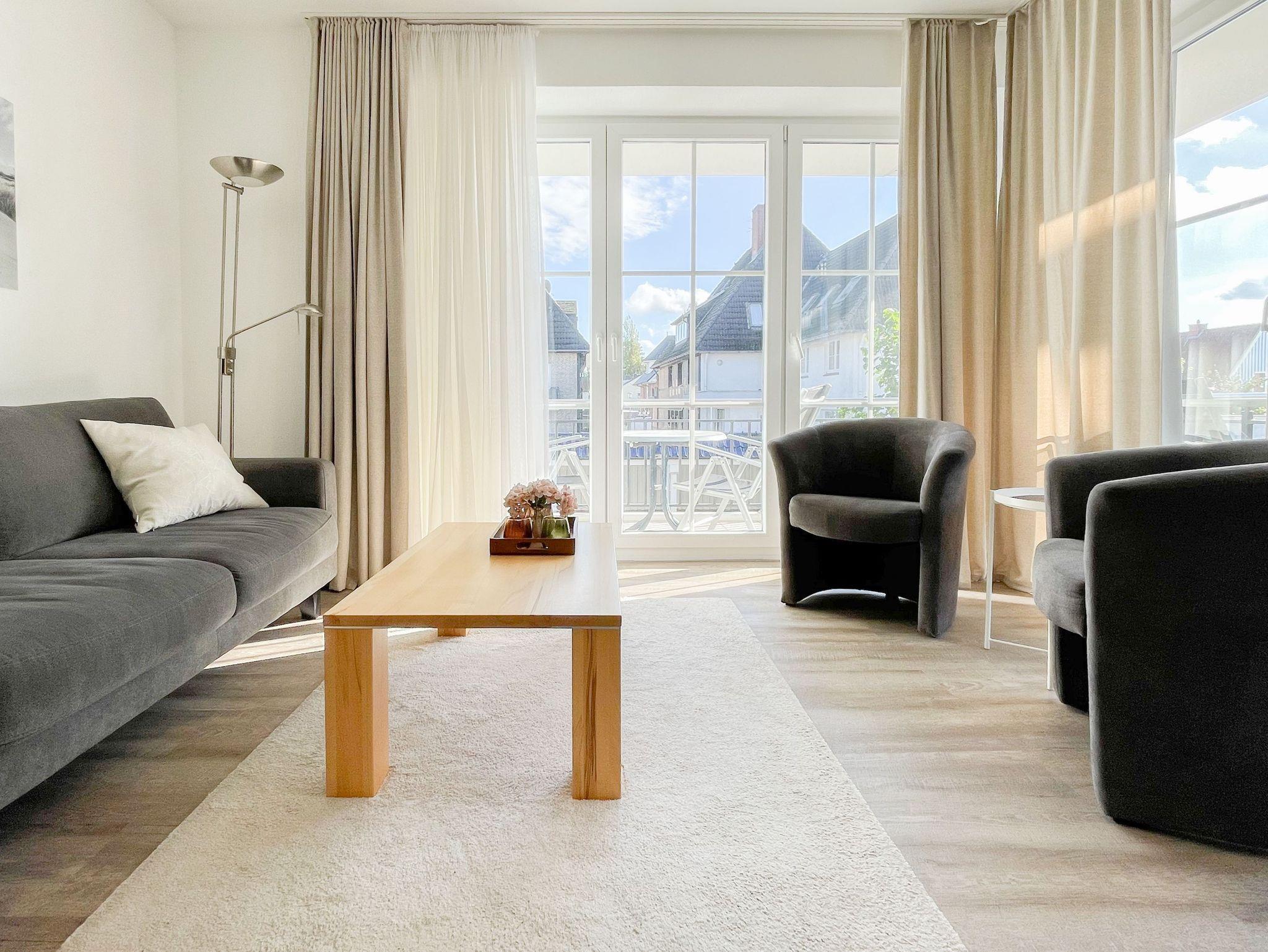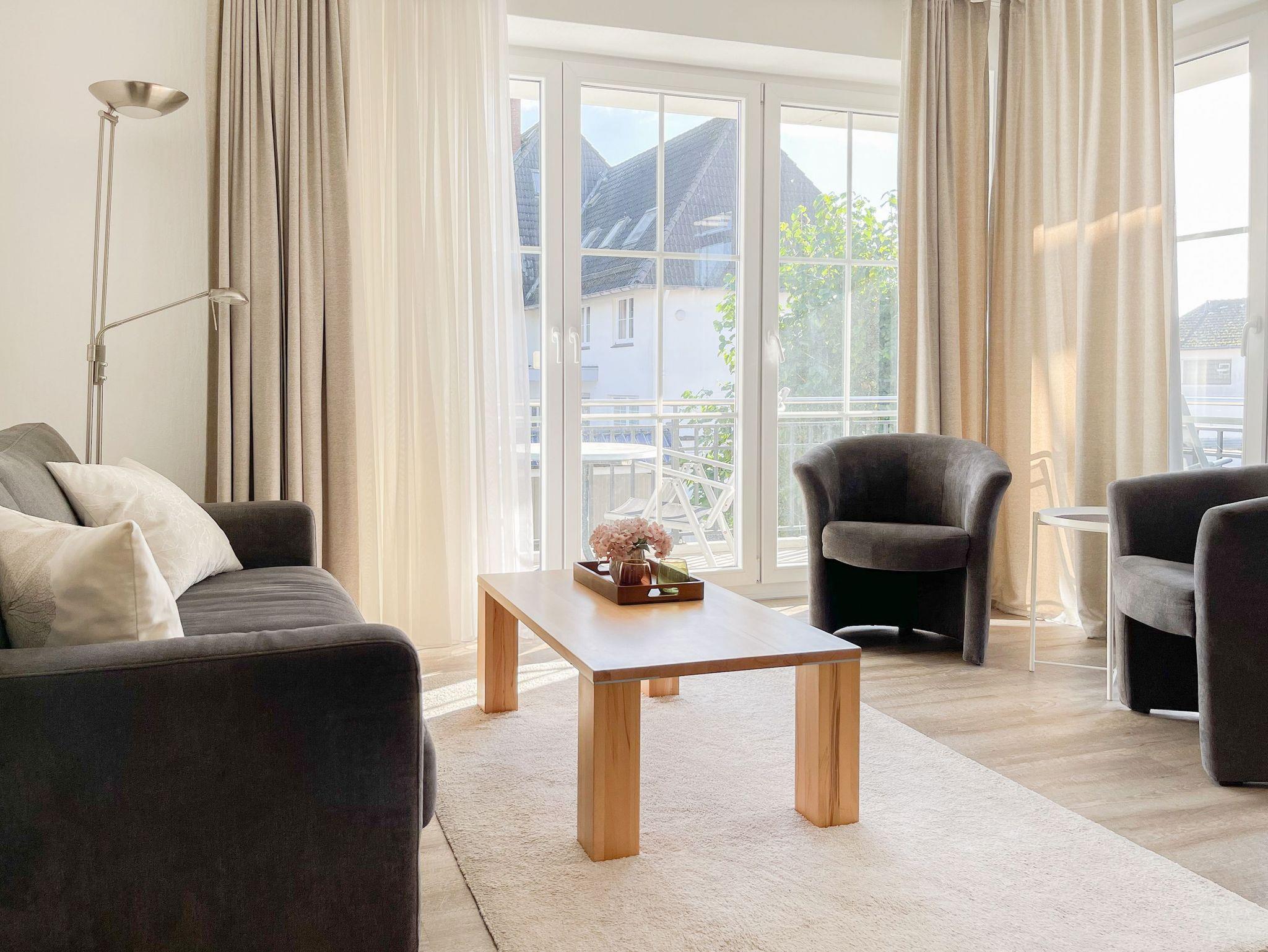 Die komfortable Ferienwohnung bietet mit zwei separaten Schlafzimmern, jeweils ausgestattet mit einem Doppelbett[nbsp] und Verdunkelungsmöglichkeit, ausreichend Platz für einen entspannten Urlaub für 4 Personen. Es erwartet Sie ein sonniger Wohnbereich mit bodentiefen Fensterelementen und umlaufendem Südbalkon sowie eine gut ausgestattete, offene Küche. Der angrenzende Essbereich ist für 4 Personen ausgelegt. TV, WLAN und Hifi Anlage stehen zur Verfügung. Das moderne Bad ist mit Dusche, Fenster, Handtuchwärmer, Föhn und Kosmetikspiegel ausgestattet.